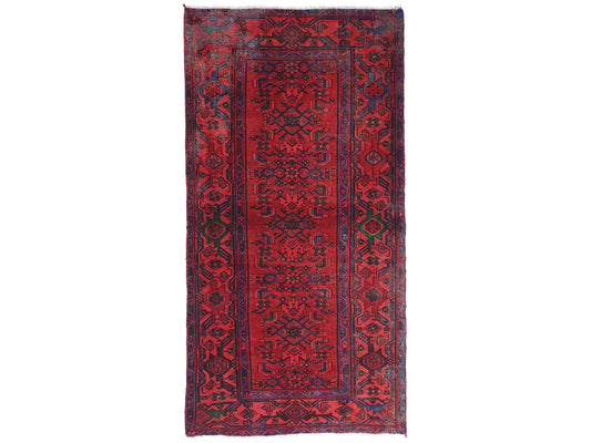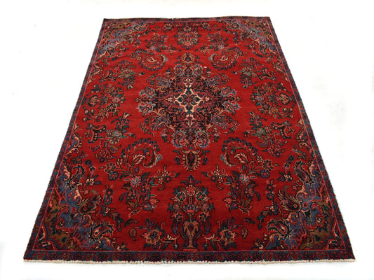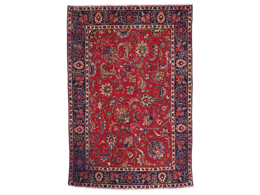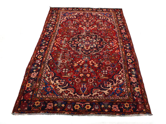 SHR673 This 4x7 handmade Turkish vintage rug from 1980 showcases a bold deep red field...
