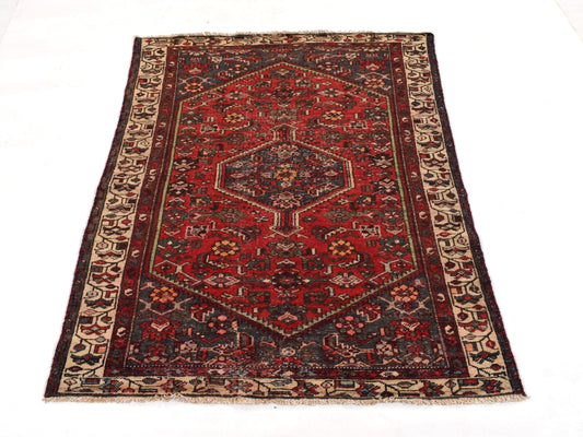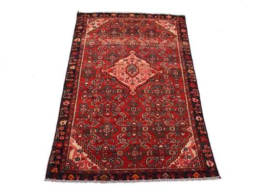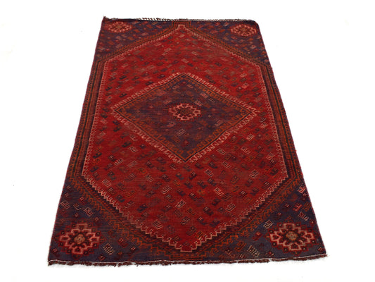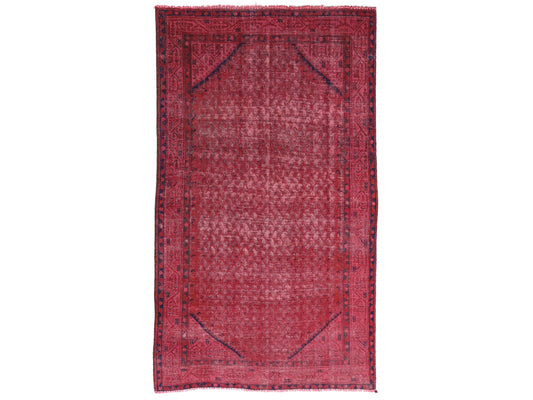 SHR601: This 4x7 handmade Turkish vintage rug from 1970 features a softly faded raspberry field...