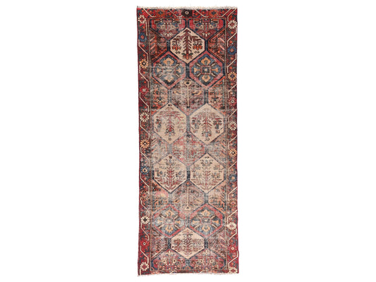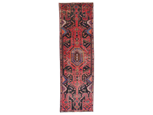 SHR682 This striking 3x9 handmade Turkish vintage rug from 1980 features a deep red field...