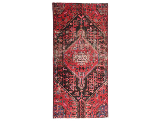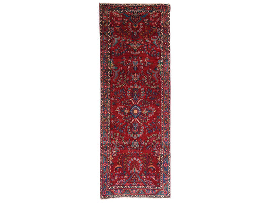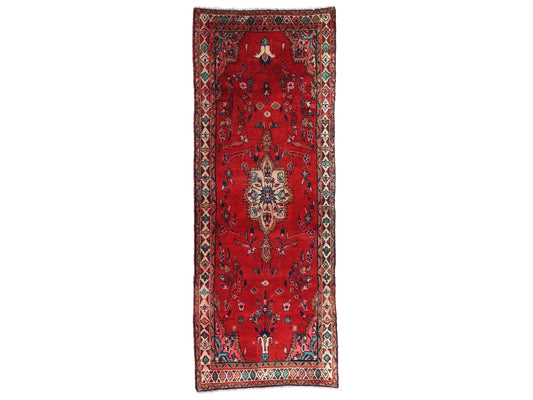 SHR678 This 3x8 handmade Turkish vintage rug from 1980 features a vivid red field adorned...