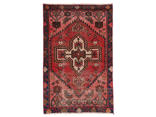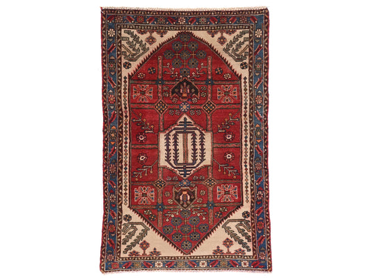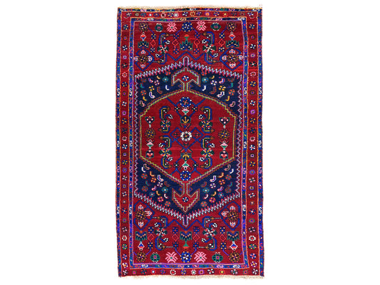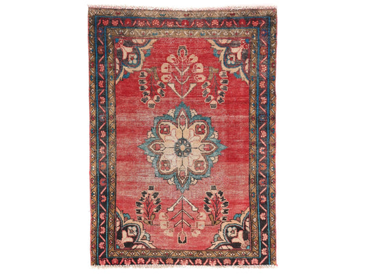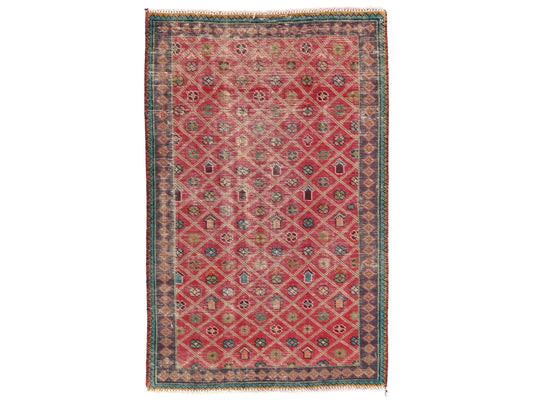 SHR509 This 3x4 handmade Turkish vintage tribal rug captivates with a crimson canvas richly adorned...