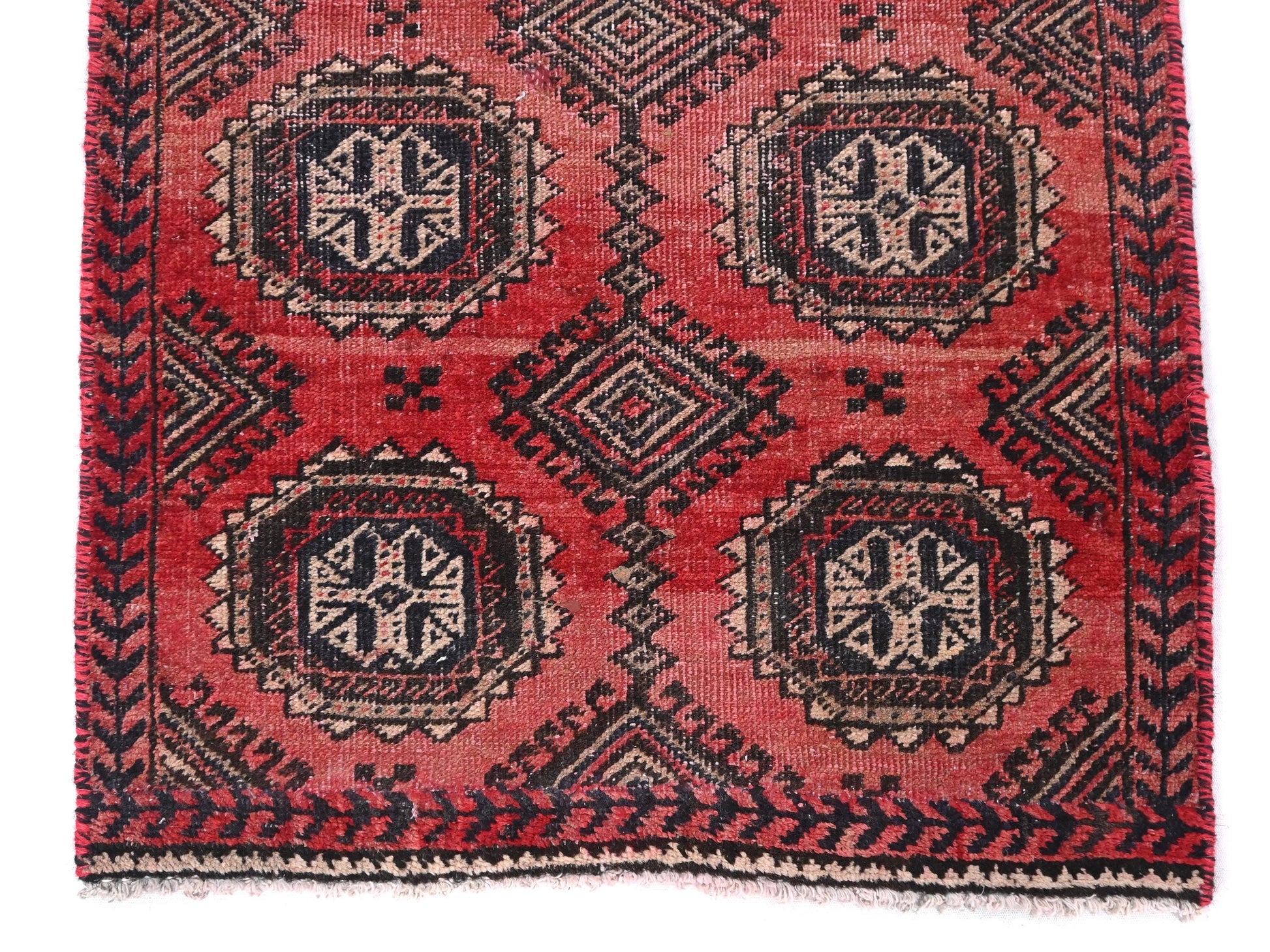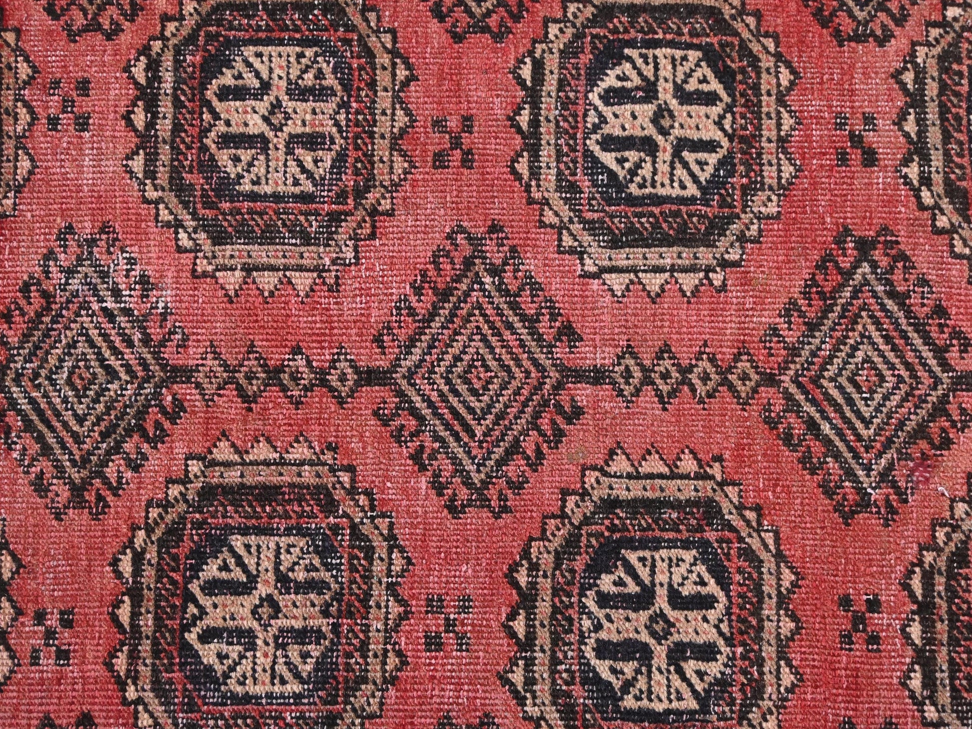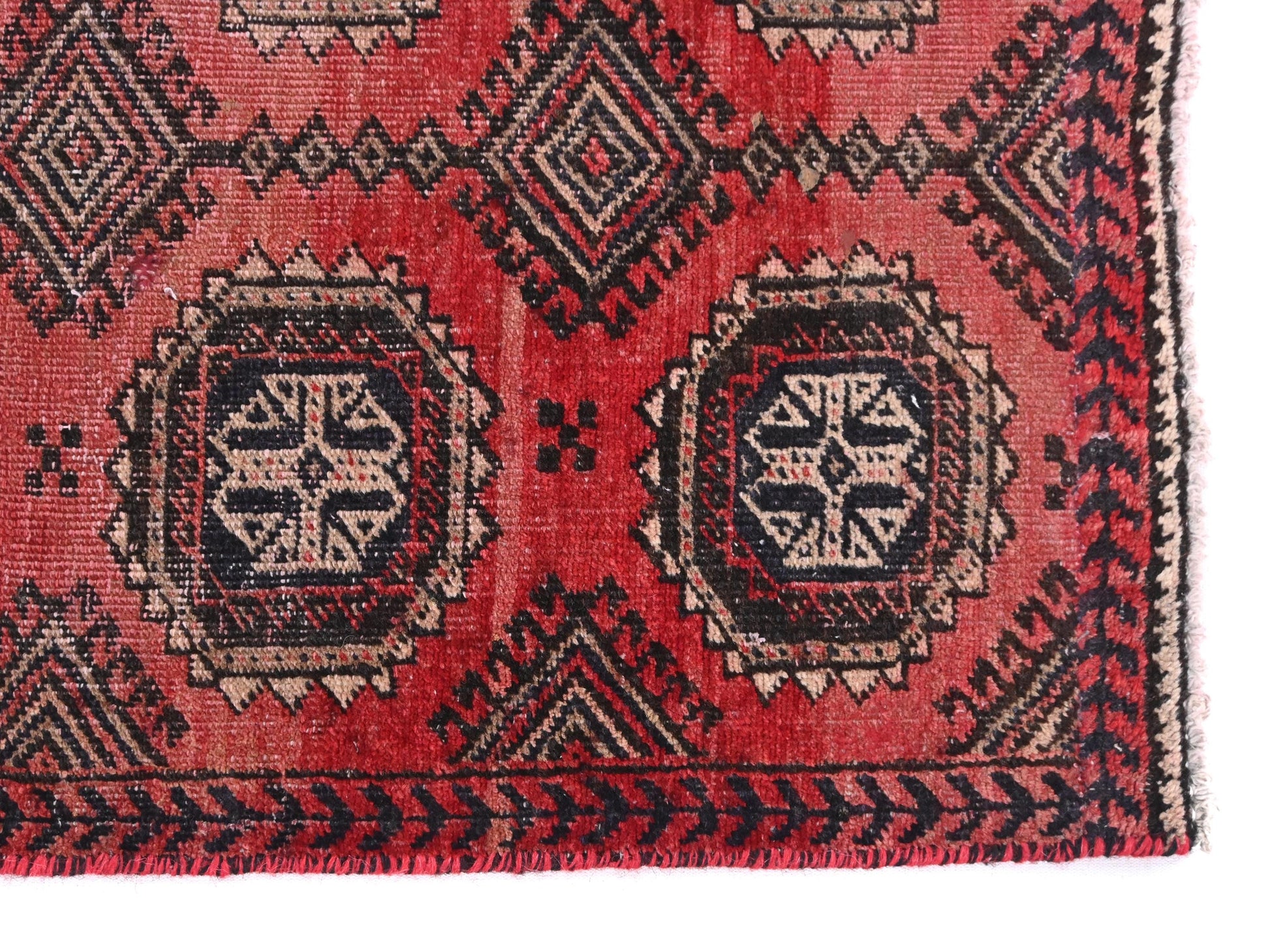 This captivating vintage piece, SHR-575, features a series of intricate emblem-star medallions woven into a symmetrical tribal matrix. The bold geometric pattern in deep navy and cream is beautifully contrasted against a warm terracotta-red background, evoking the traditional symbolism of Turkish village weavings. Each octagonal medallion appears like a celestial compass, anchoring the rug with structure and historical depth.