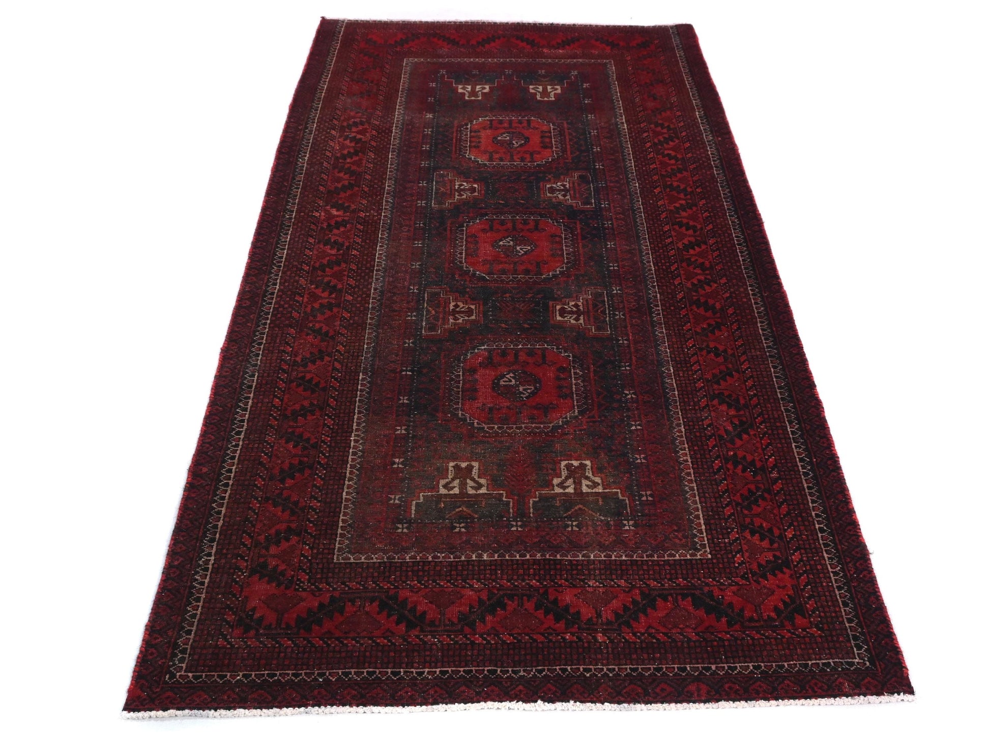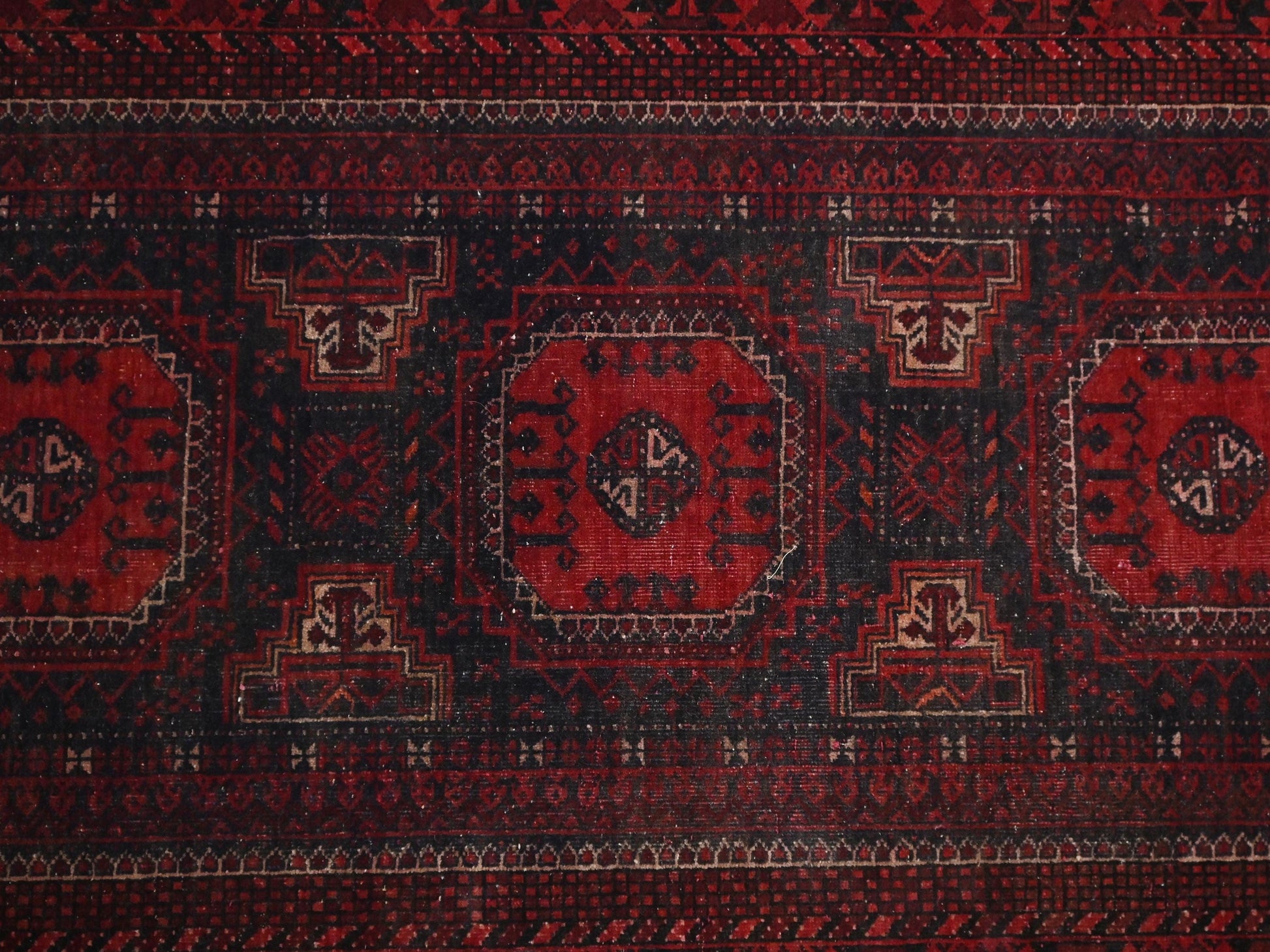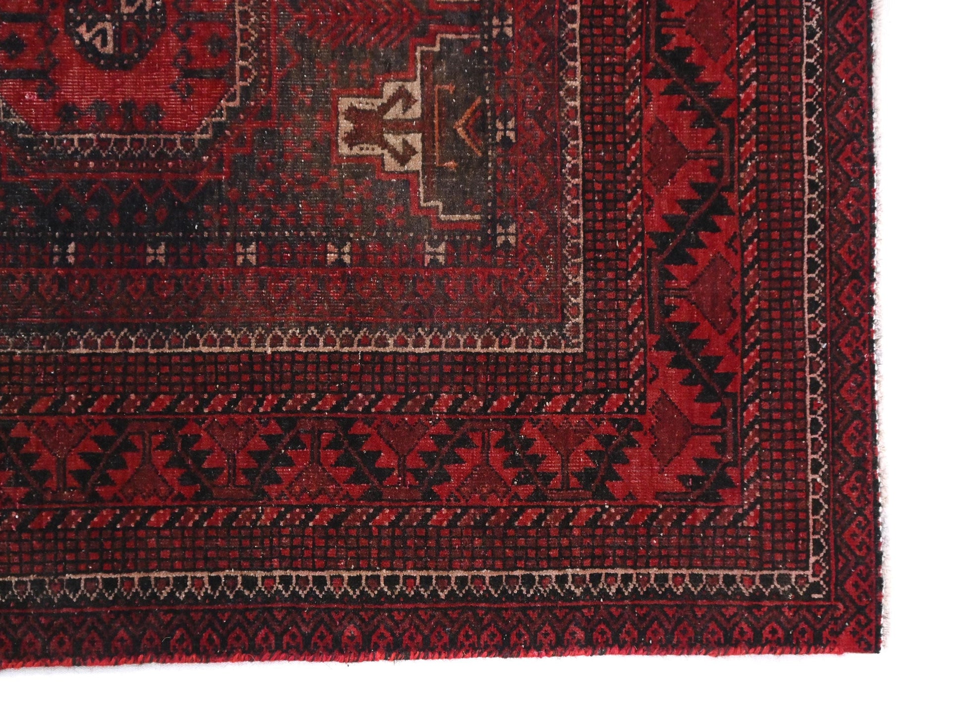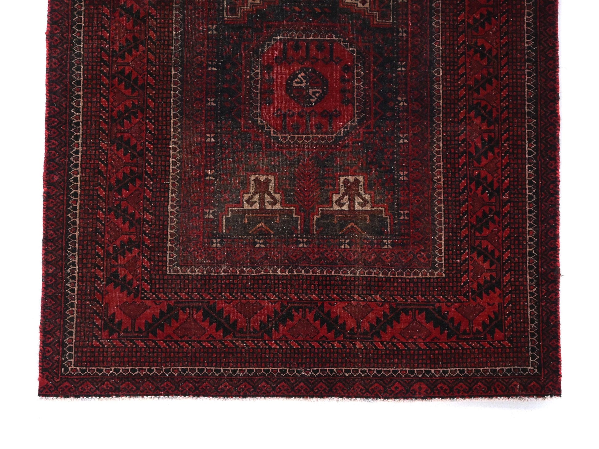 This finely woven rug rug displays a dramatic series of octagonal gul medallions—tribal emblems arranged with geometric precision against a midnight red field. Surrounded by dense zigzag borders and flanked with angular floral accents, the rug radiates a powerfully masculine presence with nods to classic Central Asian motifs.
