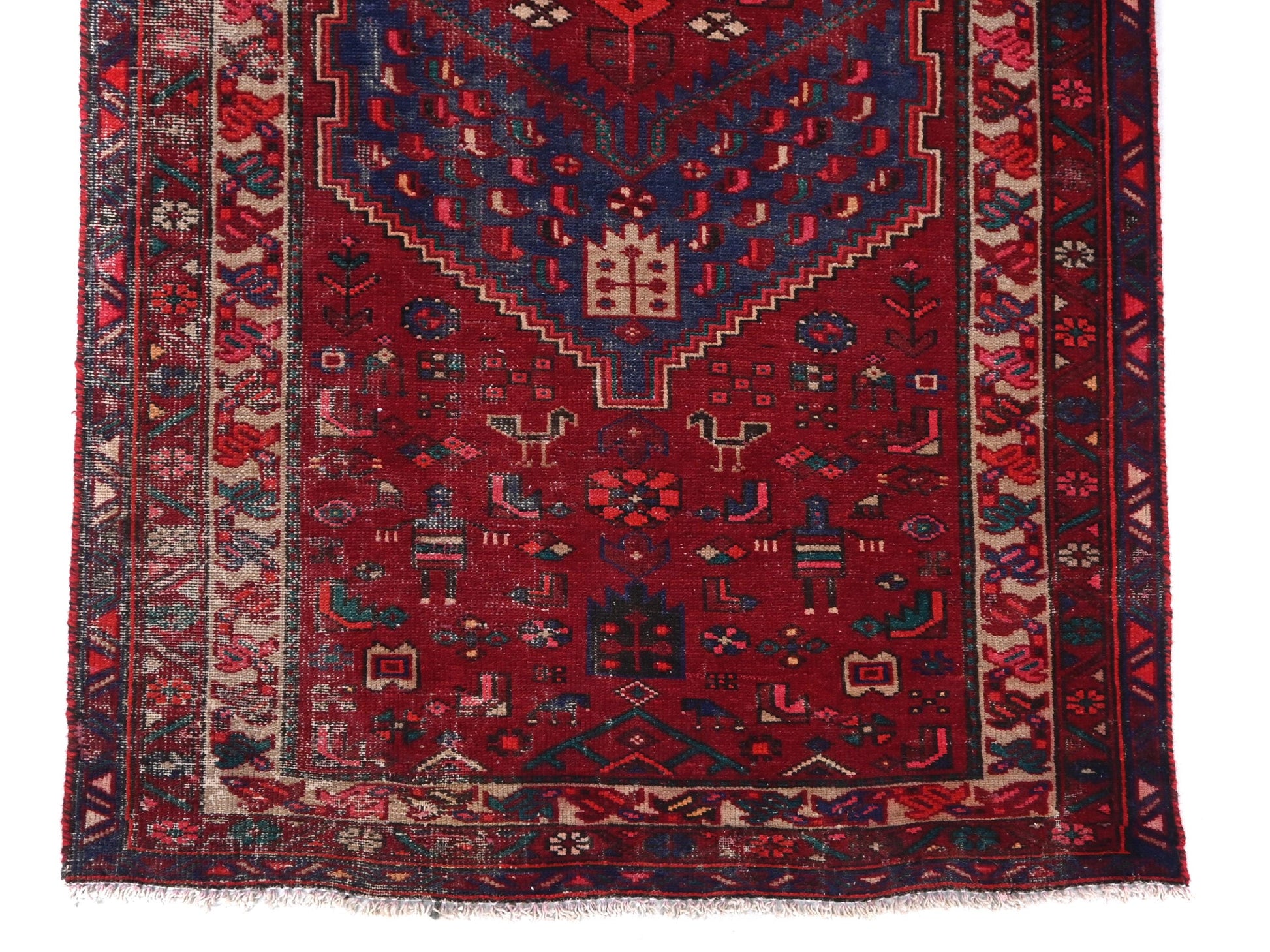 This 3x7 handmade Turkish vintage rug from 1970 features a striking brick red field anchored by a large midnight blue hexagonal medallion filled with intricate tribal motifs. The medallion's bold contrast against the deep red background draws the eye instantly, while small geometric accents and soft ivory detailing add depth throughout the field. The outer border, adorned with repeating angular and wave-like patterns, adds visual rhythm and frames the piece with balance and character. This rug would effortlessly elevate any hallway, entryway, or narrow space needing a rich, cultural touch.