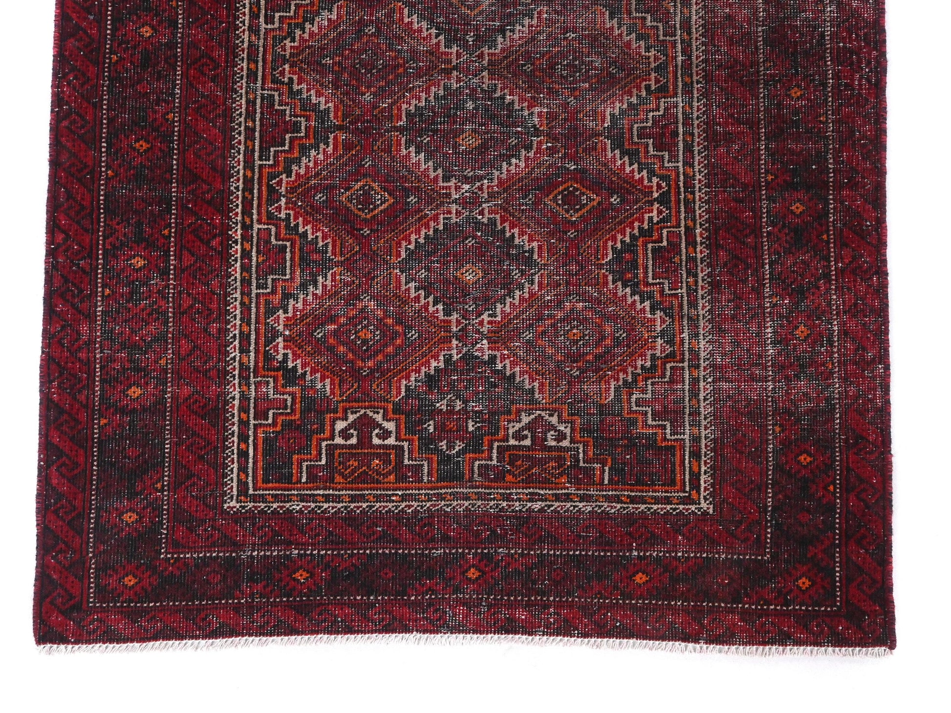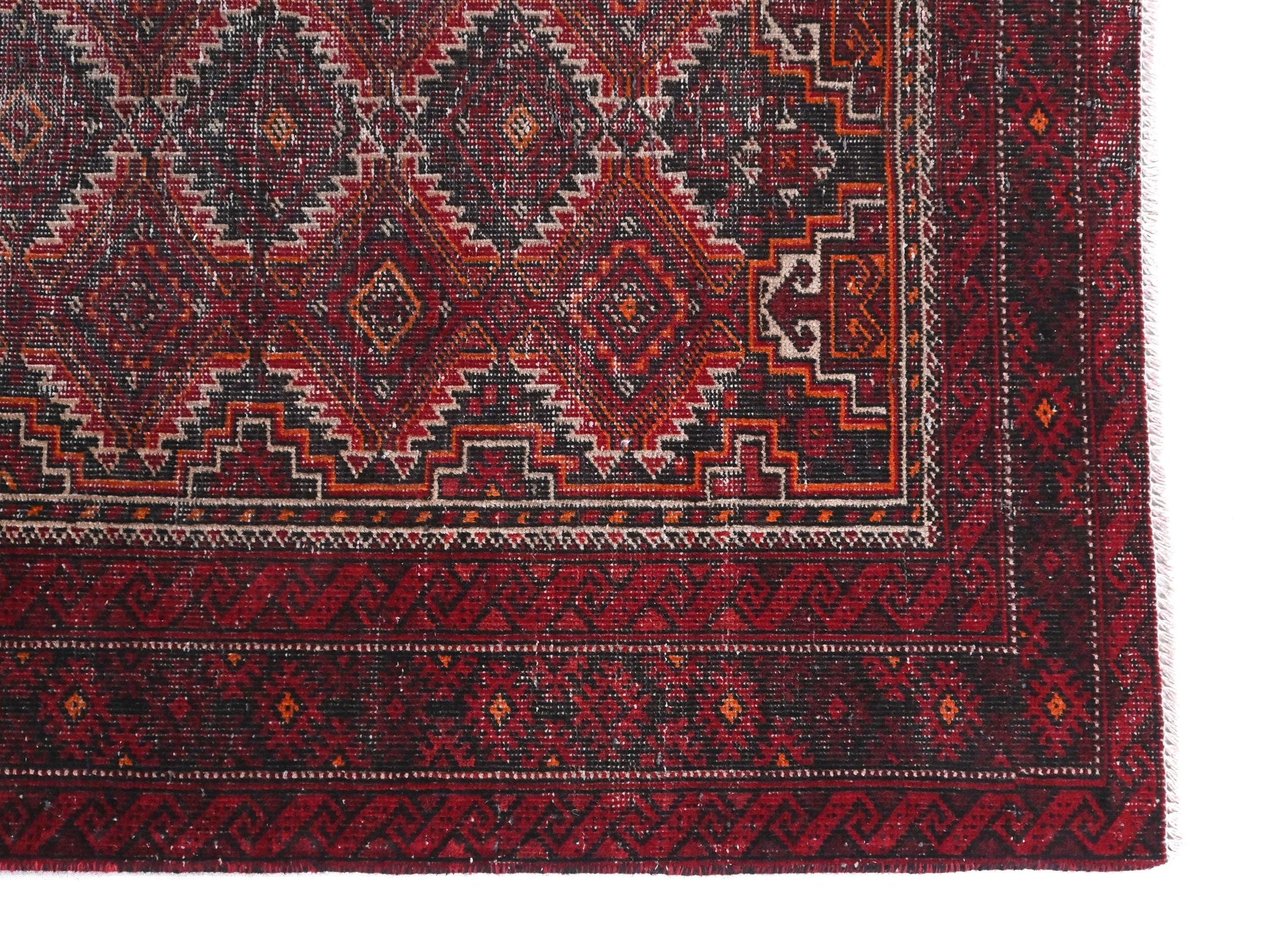 This rug rug evokes a rich visual language with its layered geometry, bordered tightly in angular motifs and lined with a striking red lattice field. The repeated medallion-style center radiates an earthy palette of burgundy, black, and terracotta, brought to life by subtly worn textures that speak to its century-old heritage.