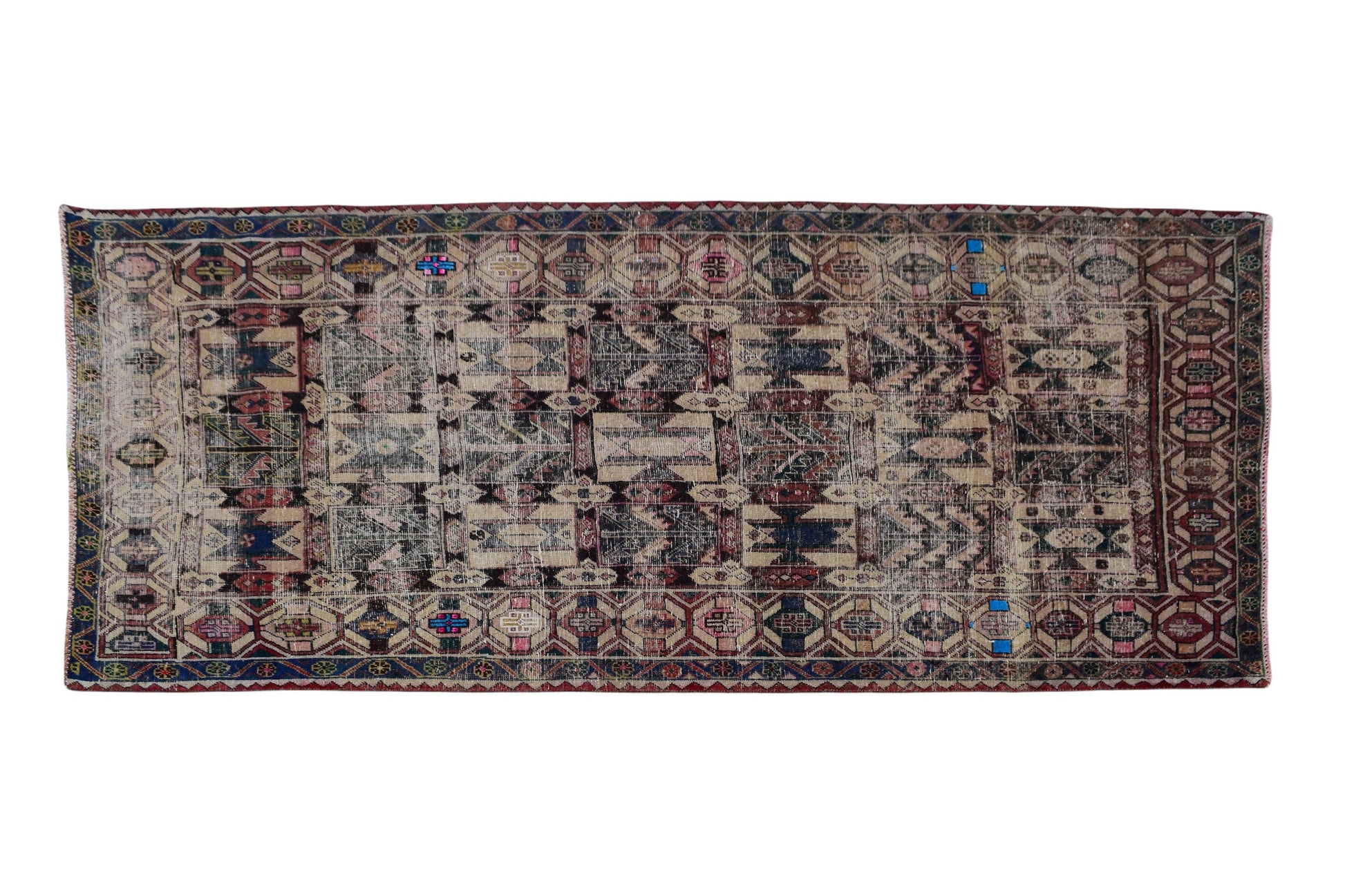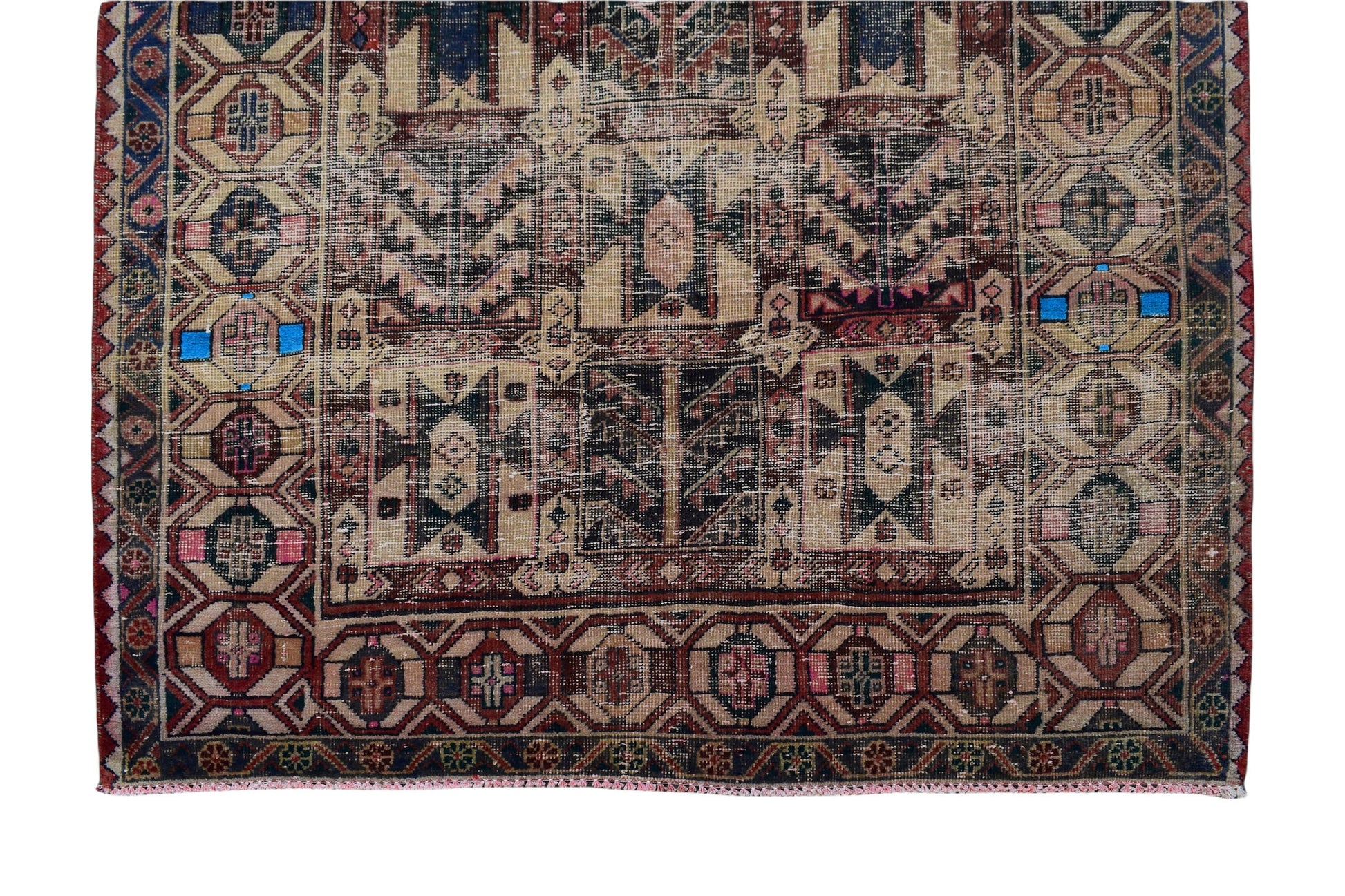 The vintage rugs in our collection have a rich and deep color palette and feature the characteristic design of a central pole medallion interspersed with geometric patterns and symmetrical shapes. Across their borders are often smaller bands encompassing a larger band with palm and leaf designs. A common theme in these rugs is geometric floral motives in various colors.