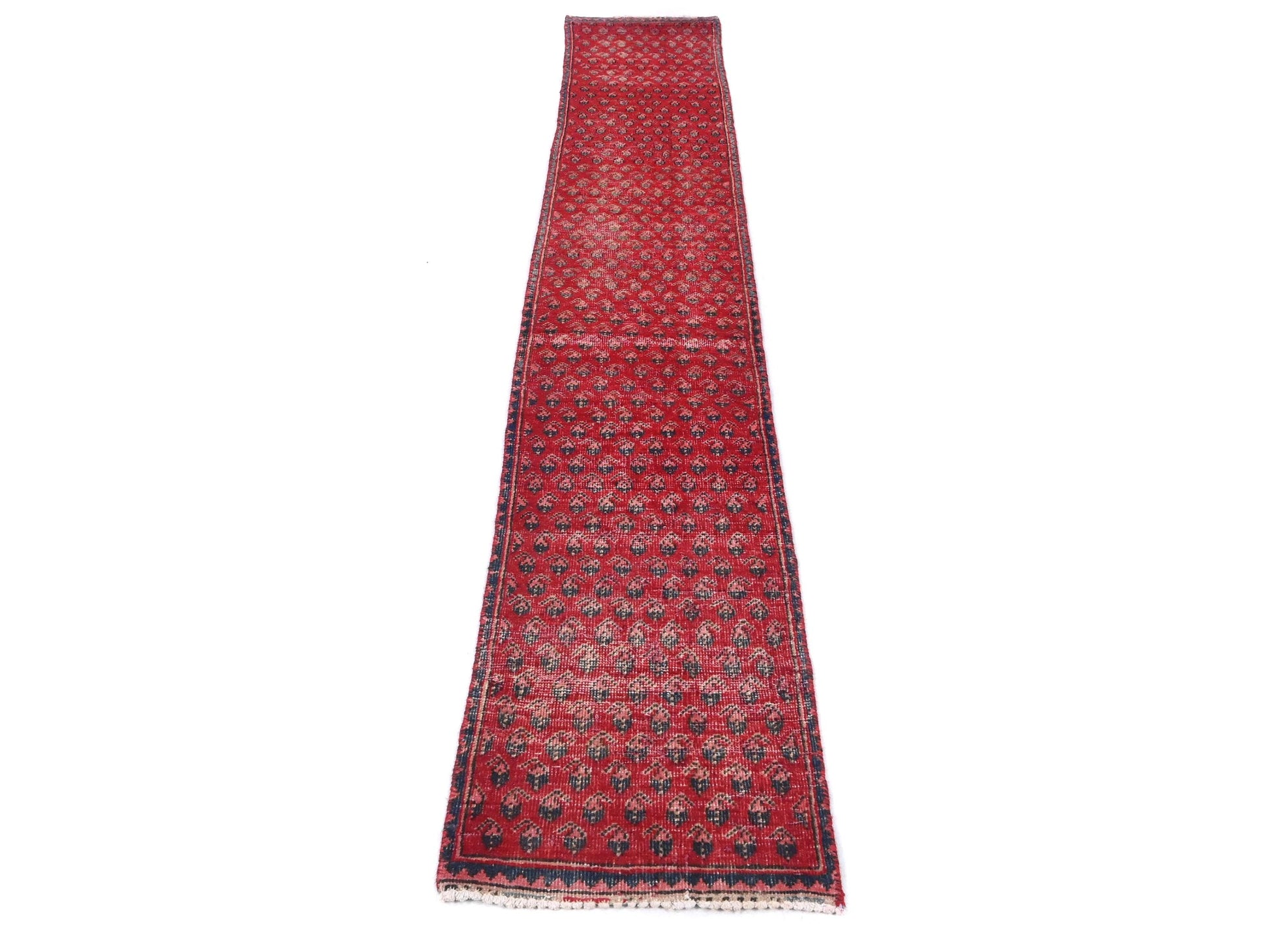 This striking 2x10 handmade Turkish vintage rug from 1980 features a stunning all-over gul motif — a traditional tribal emblem repeated meticulously across a warm brick red field. Its narrow runner shape makes it ideal for hallways, entryways, or alongside a bed, where the symmetrical design creates a sense of continuity and balance. The deep reds, aged blacks, and softened ivory tones add visual warmth while still offering a grounded, classic feel.