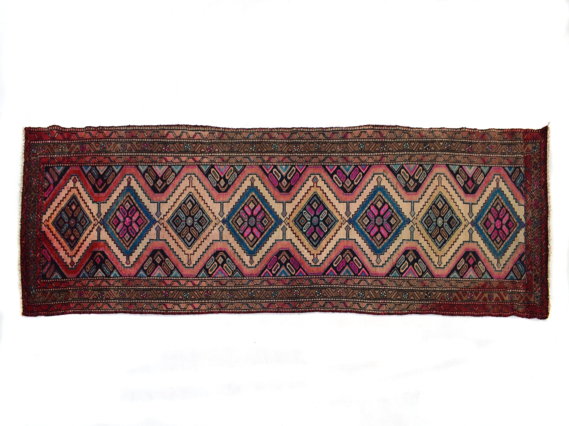 The vintage rugs in our collection have a rich and deep color palette and feature the characteristic design of a central pole medallion interspersed with geometric patterns and symmetrical shapes. Across their borders are often smaller bands encompassing a larger band with palm and leaf designs. A common theme in these rugs is geometric floral motives in various colors.