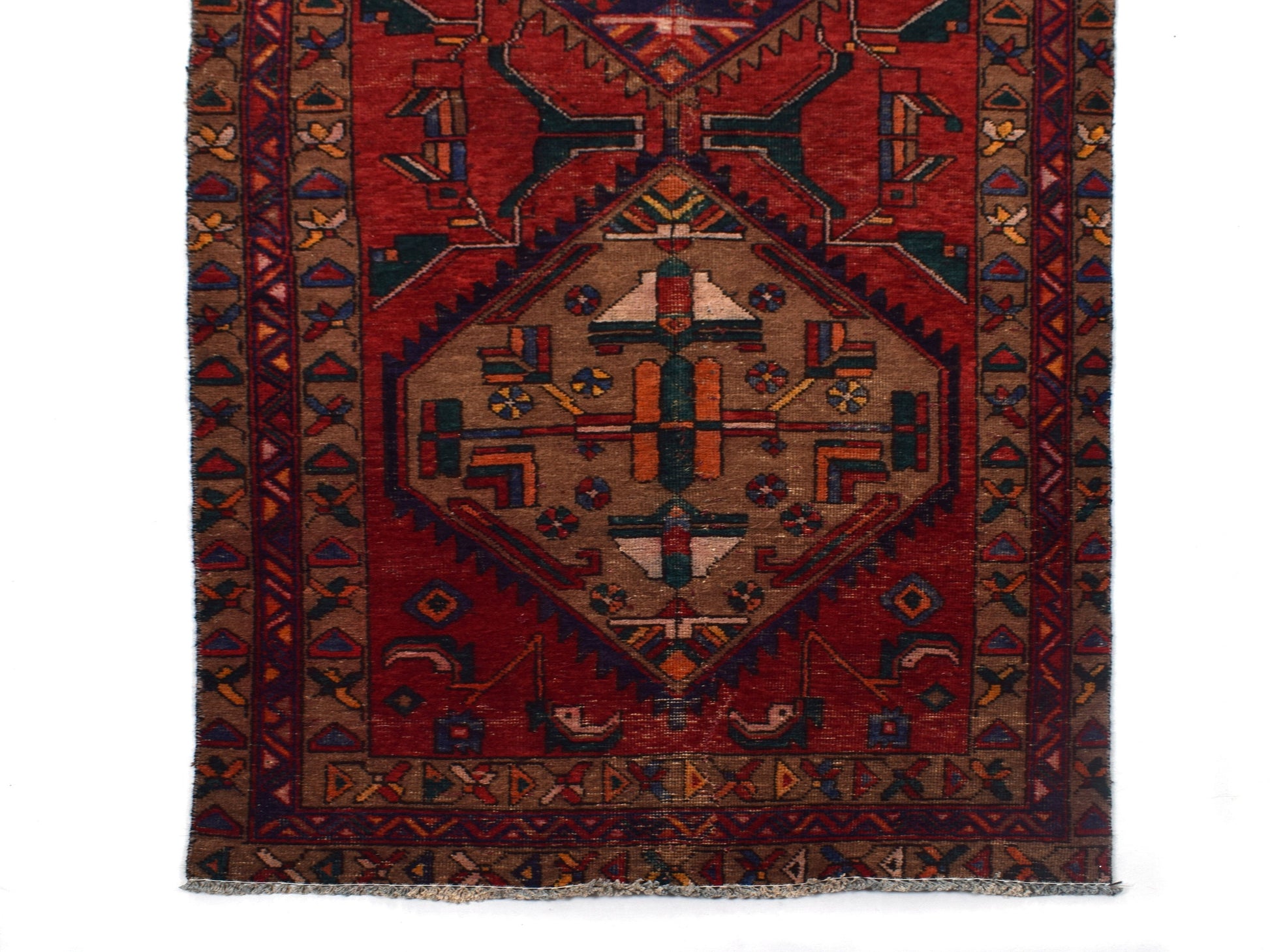 The vintage rugs in our collection have a rich and deep color palette and feature the characteristic design of a central pole medallion interspersed with geometric patterns and symmetrical shapes. Across their borders are often smaller bands encompassing a larger band with palm and leaf designs. A common theme in these rugs is geometric floral motives in various colors.
