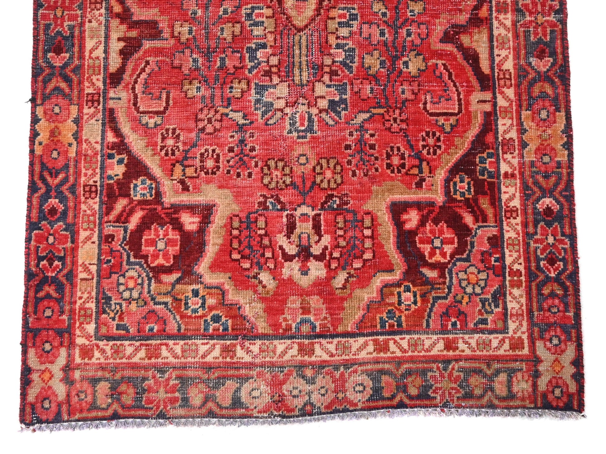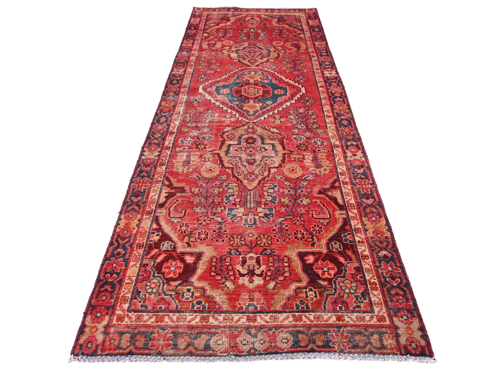 This 3x10 handmade Turkish vintage rug from 1970 showcases a faded raspberry red field with soft floral medallions cascading along the centerline. Hints of navy, ivory, and peach provide delicate contrast, gently revealing themselves through the time-softened wool pile. The central pattern flows effortlessly, lending the rug a subtle motion and calm character.
