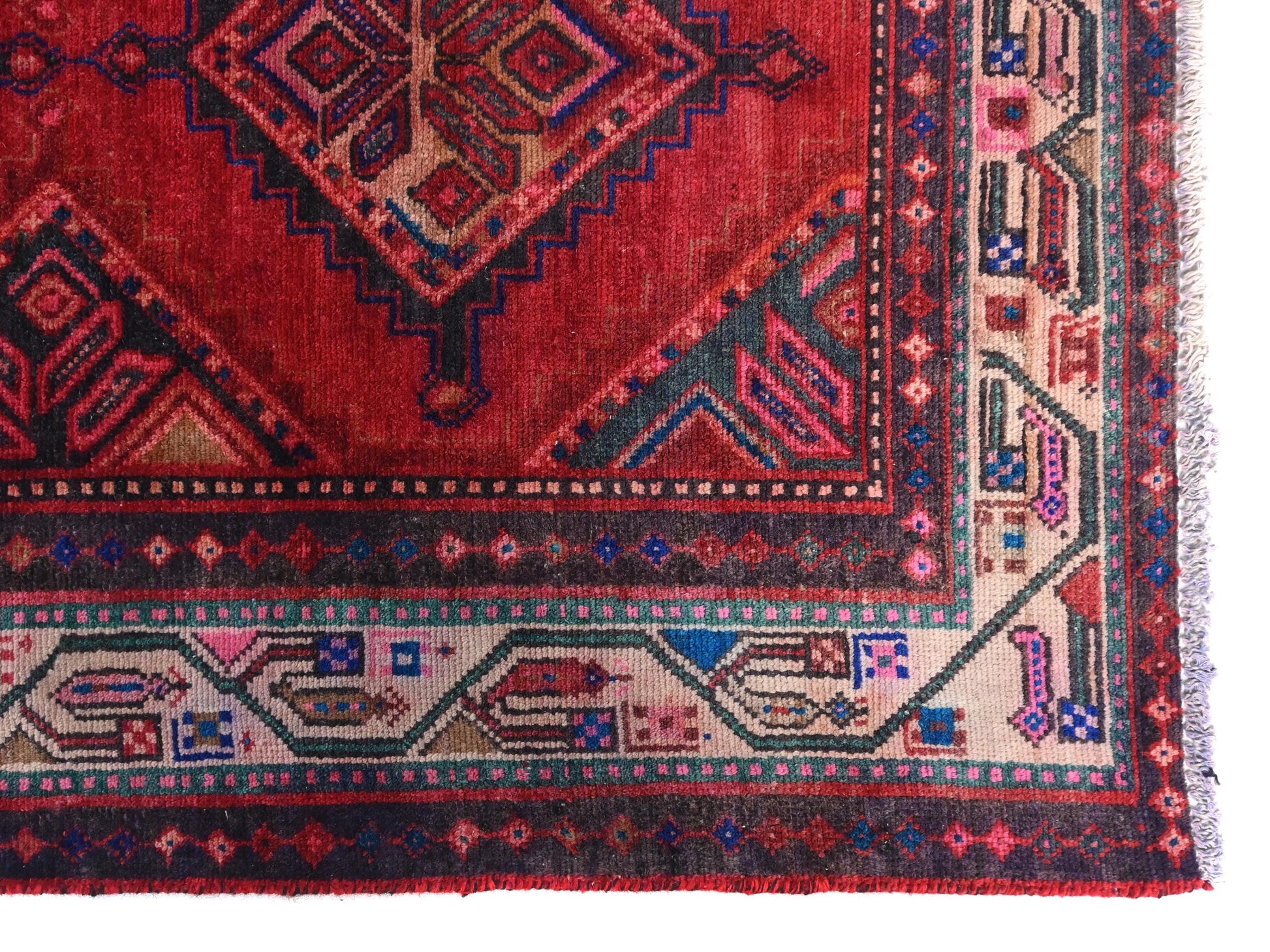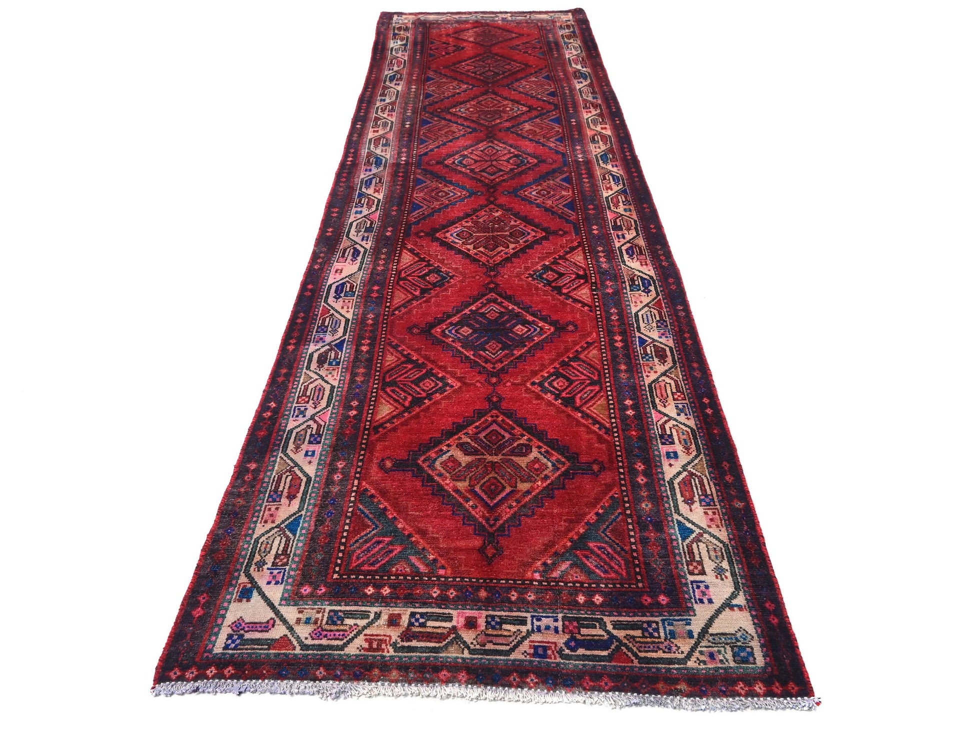 This 3x11 handmade Turkish vintage rug from 1970 features a powerful diamond pattern running vertically along a richly dyed red and navy field. Each medallion is uniquely bordered, creating a sense of movement and energy that enhances hallways or entryways with style.