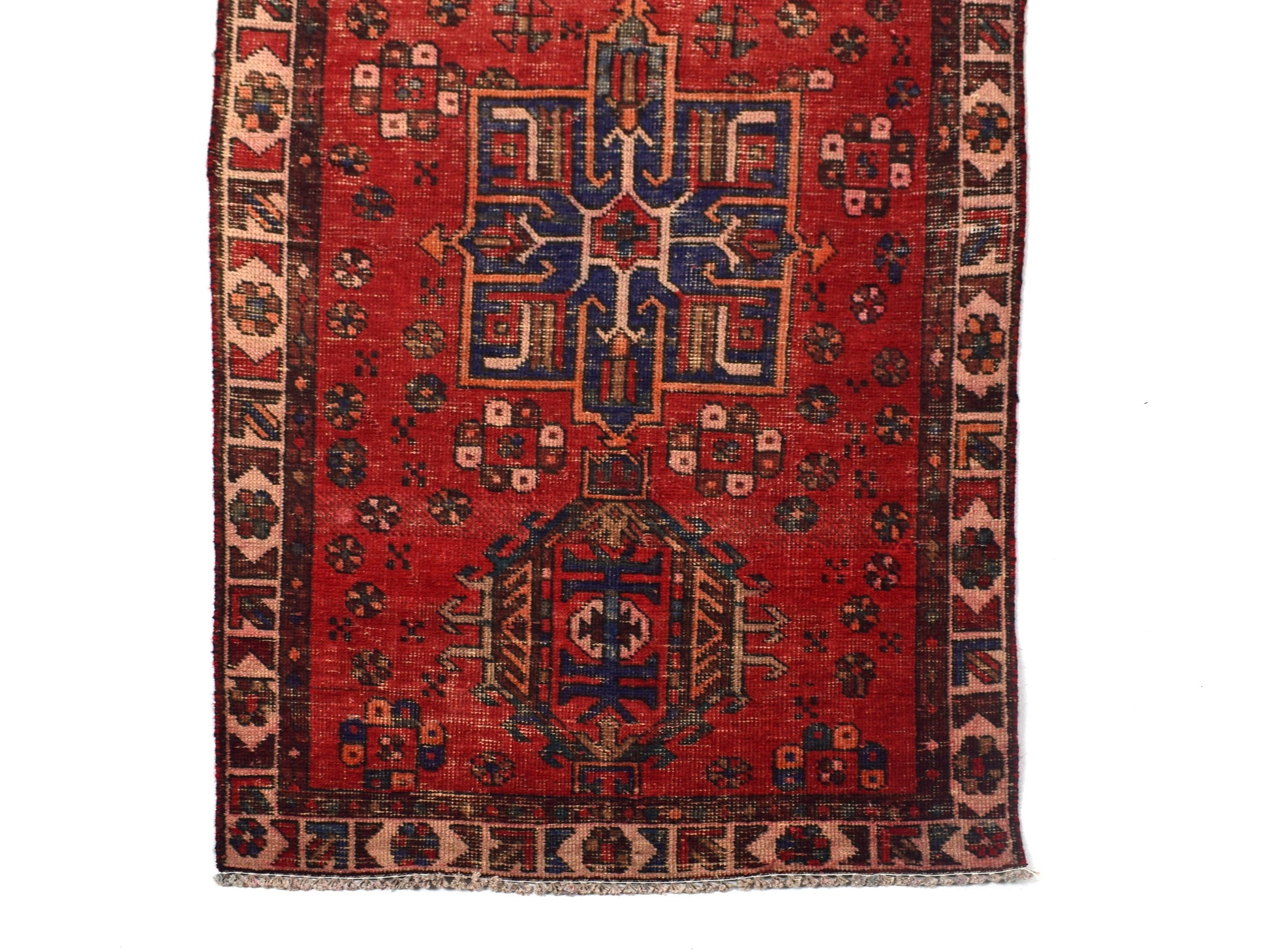 The vintage rugs in our collection have a rich and deep color palette and feature the characteristic design of a central pole medallion interspersed with geometric patterns and symmetrical shapes. Across their borders are often smaller bands encompassing a larger band with palm and leaf designs. A common theme in these rugs is geometric floral motives in various colors.