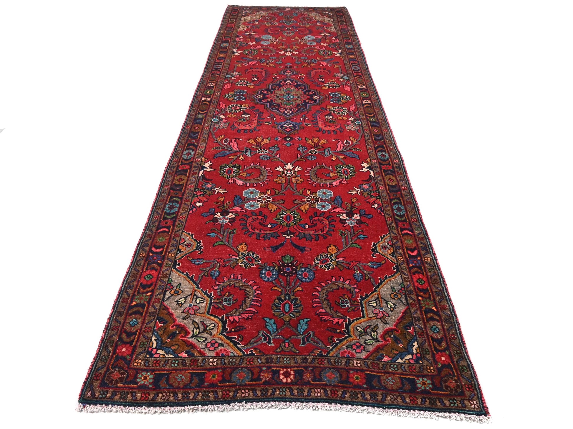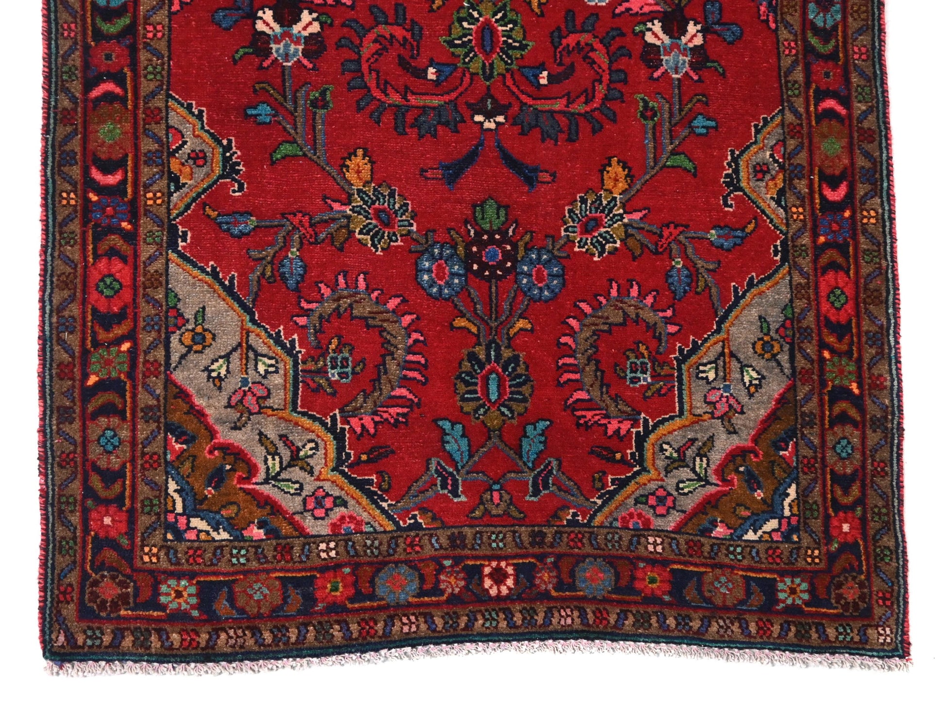 This 3x9 handmade Turkish vintage rug from 1970 features a bold composition of three oversized floral medallions in navy and coral red, set against a deeply saturated crimson field. The high-contrast palette gives this piece a striking presence, while subtle beige borders frame the layout with graceful symmetry. Accents of ivory and dark brown add further depth to this one-of-a-kind tribal design.