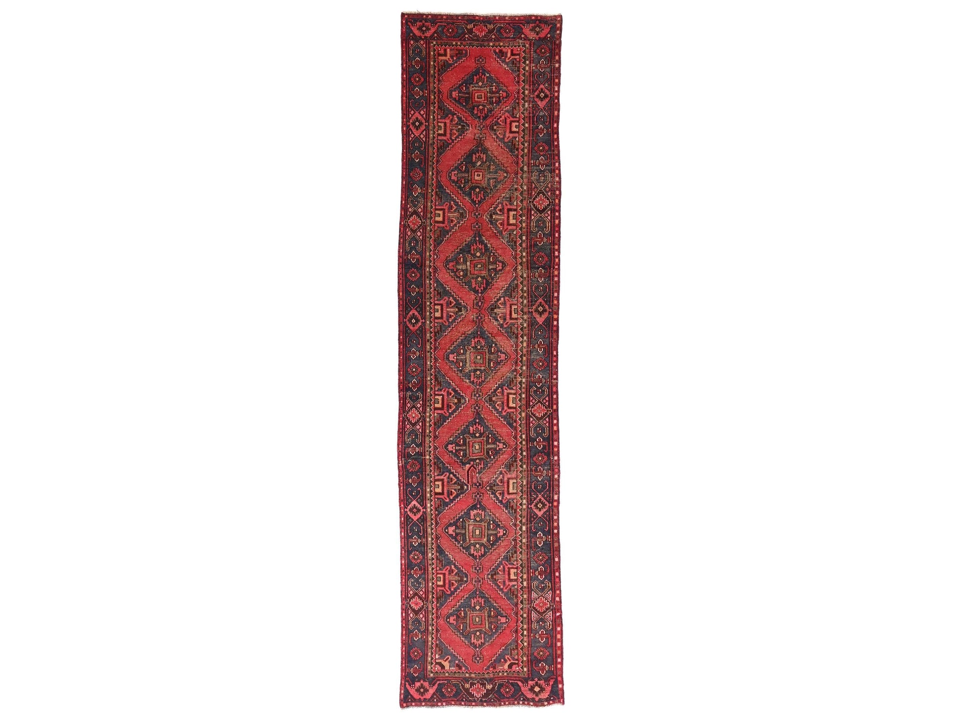 This striking 3x12 handmade Turkish tribal rug from 1980 commands attention with its vibrant red field and a continuous chain of navy diamond medallions running symmetrically down its center. Each diamond is intricately filled with geometric motifs and framed by delicate cream and brown corner accents, giving the rug a rhythmic and visually captivating structure.