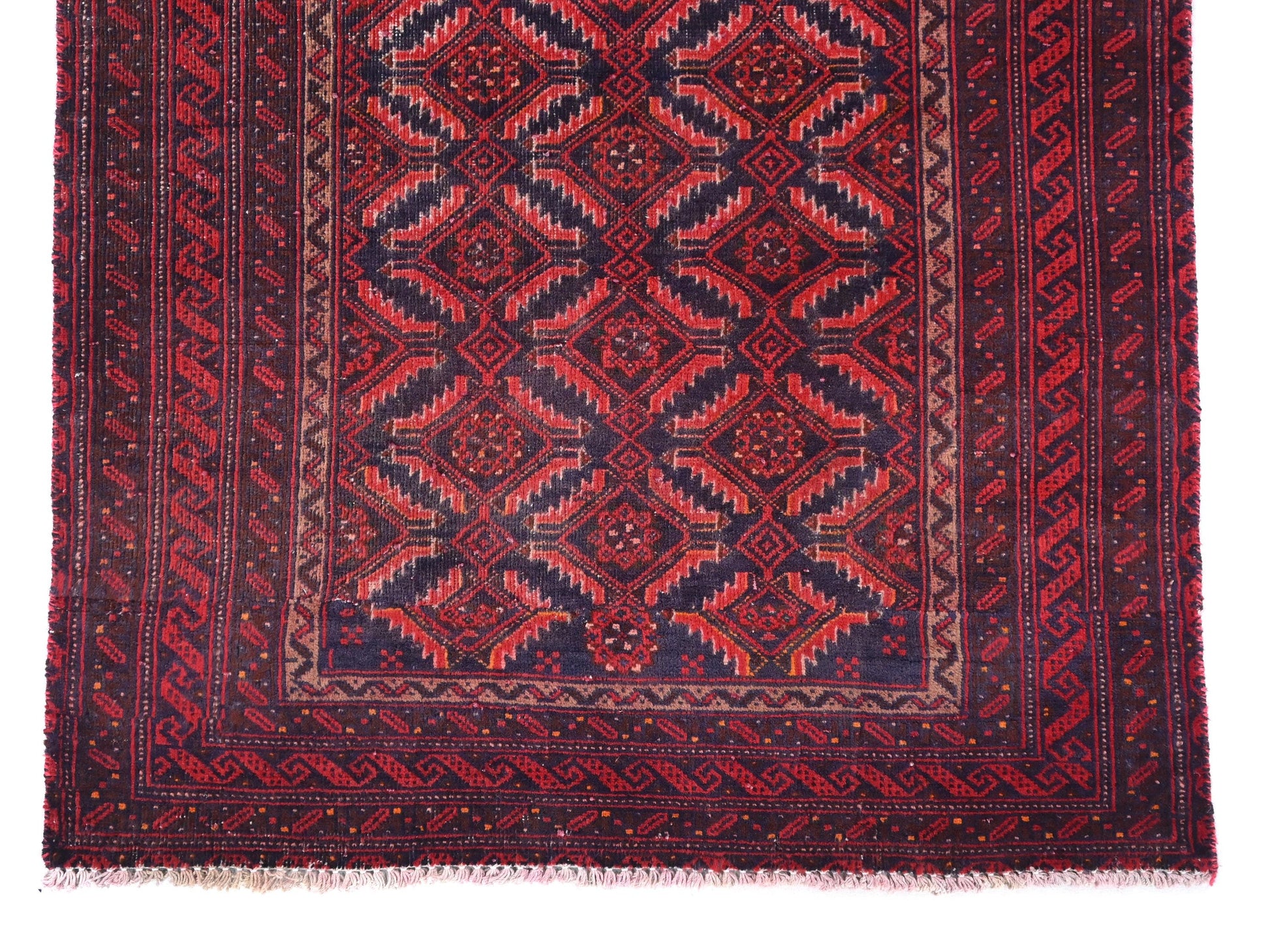 This 3x4 handmade Turkish vintage rug from 1970 features a fiery red and brick-toned field decorated with a tight array of angular, leaf-like forms arranged in diagonal alignment. The thick navy border provides a bold visual contrast, neatly boxing in the movement of the center pattern. Woven by hand with 12 knots per square inch, this small-format rug is full of life and energy.