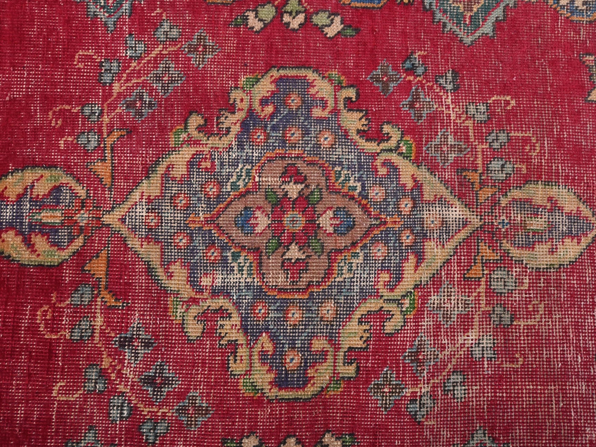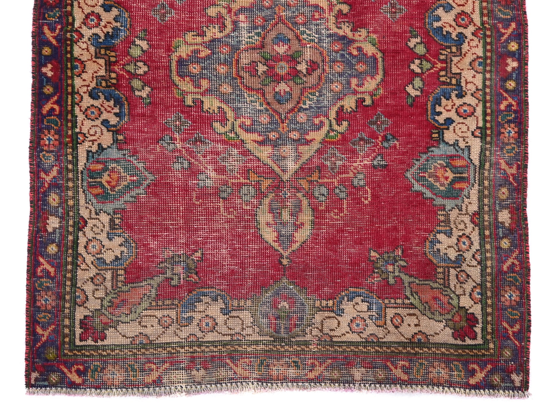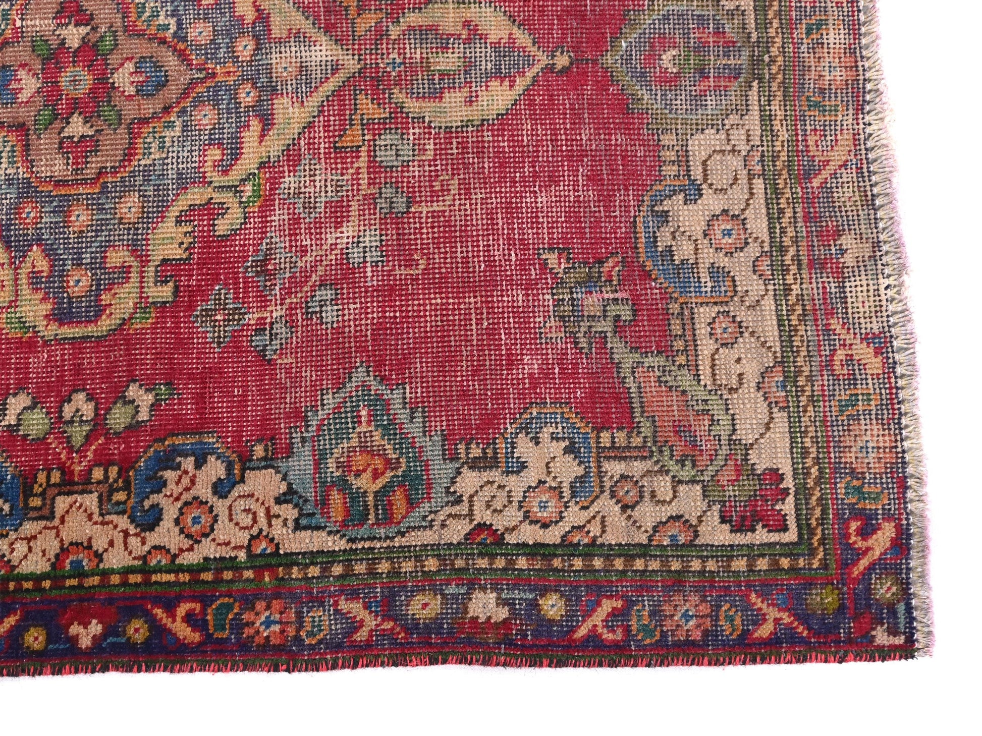 The splendid central flower medallion on this rug is a testament to the timeless artistry of Turkish weaving. Encircled by a myriad of flourishing botanical motifs and vibrant geometric shapes, this piece brings a rich history and dynamic aesthetic to any space it graces. The deep red background enhances the lush blue, creamy beige, and intense orange tones, ensuring this rug captivates and charms from every angle. Perfect for those who appreciate luxury grounded in tradition, this rug promises to transform your room into a gallery of cultural heritage.