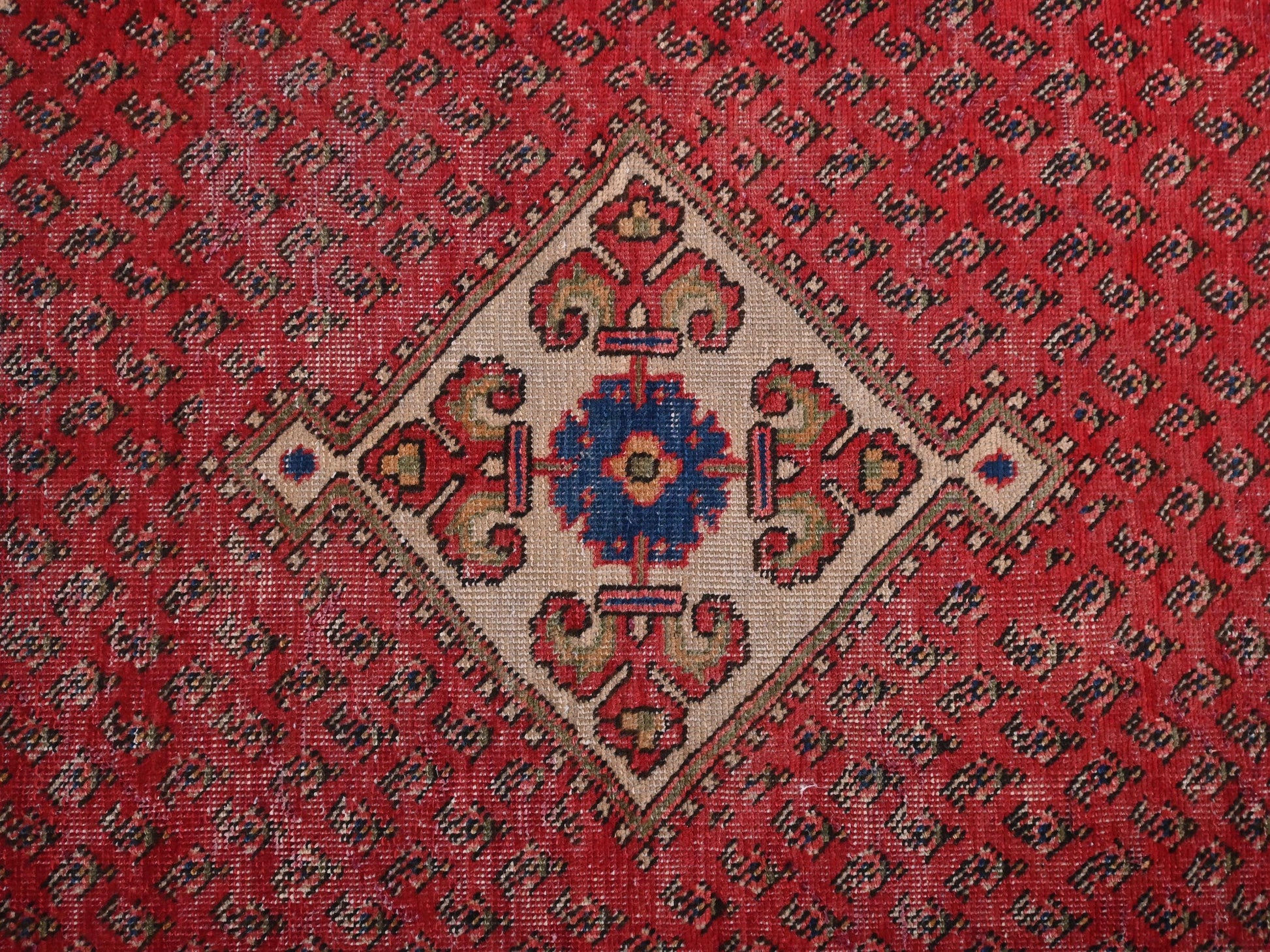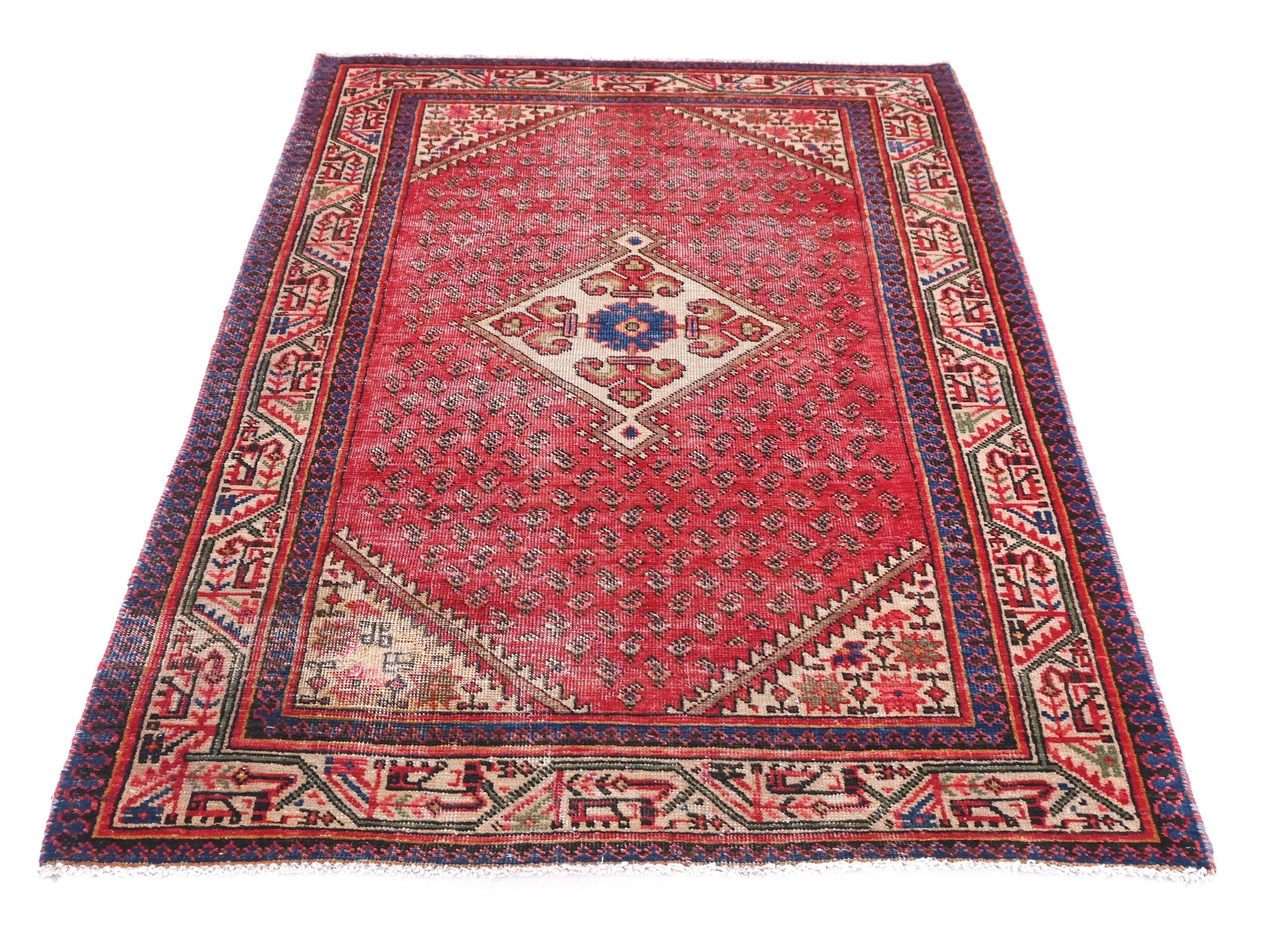 This rug features a mesmerizing central floral medallion surrounded by intricate tribal patterns and a rich color palette. The deep reds and vibrant blues create a striking contrast, making this piece a captivating focal point in any room. It seamlessly blends historical artistry with contemporary living spaces, offering both luxury and timeless charm. Perfect for adding a touch of elegance to your living room, bedroom, or kitchen.