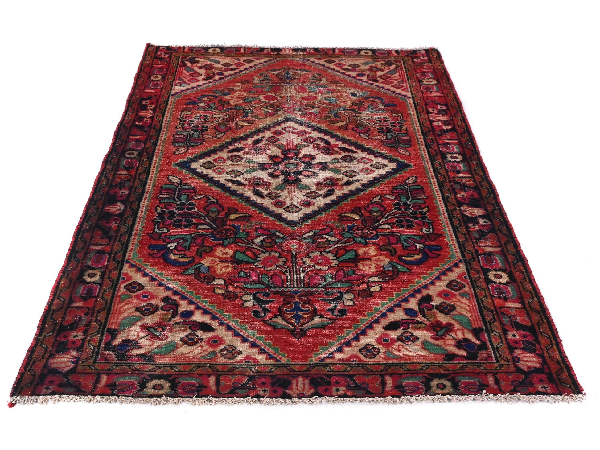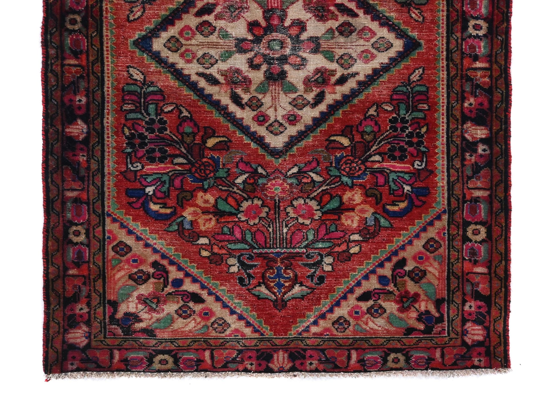 This vivid Turkish rug rug centers around a diamond-shaped medallion bursting with blooming florals, framed by ornate bouquets in each corner that feel as if they are pouring from elegant vases. The palette is radiant—lush reds, muted indigos, pistachio green, and blush pinks layered with faded ivory, bringing depth and warmth to the entire field.