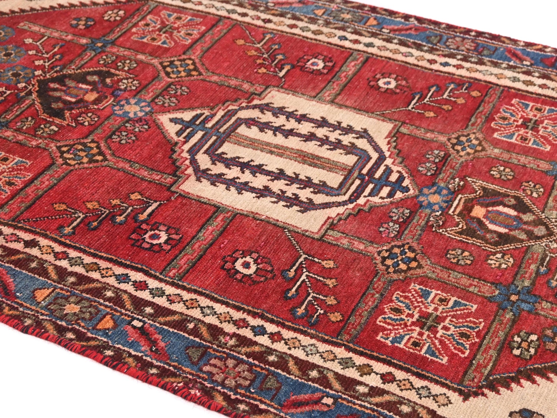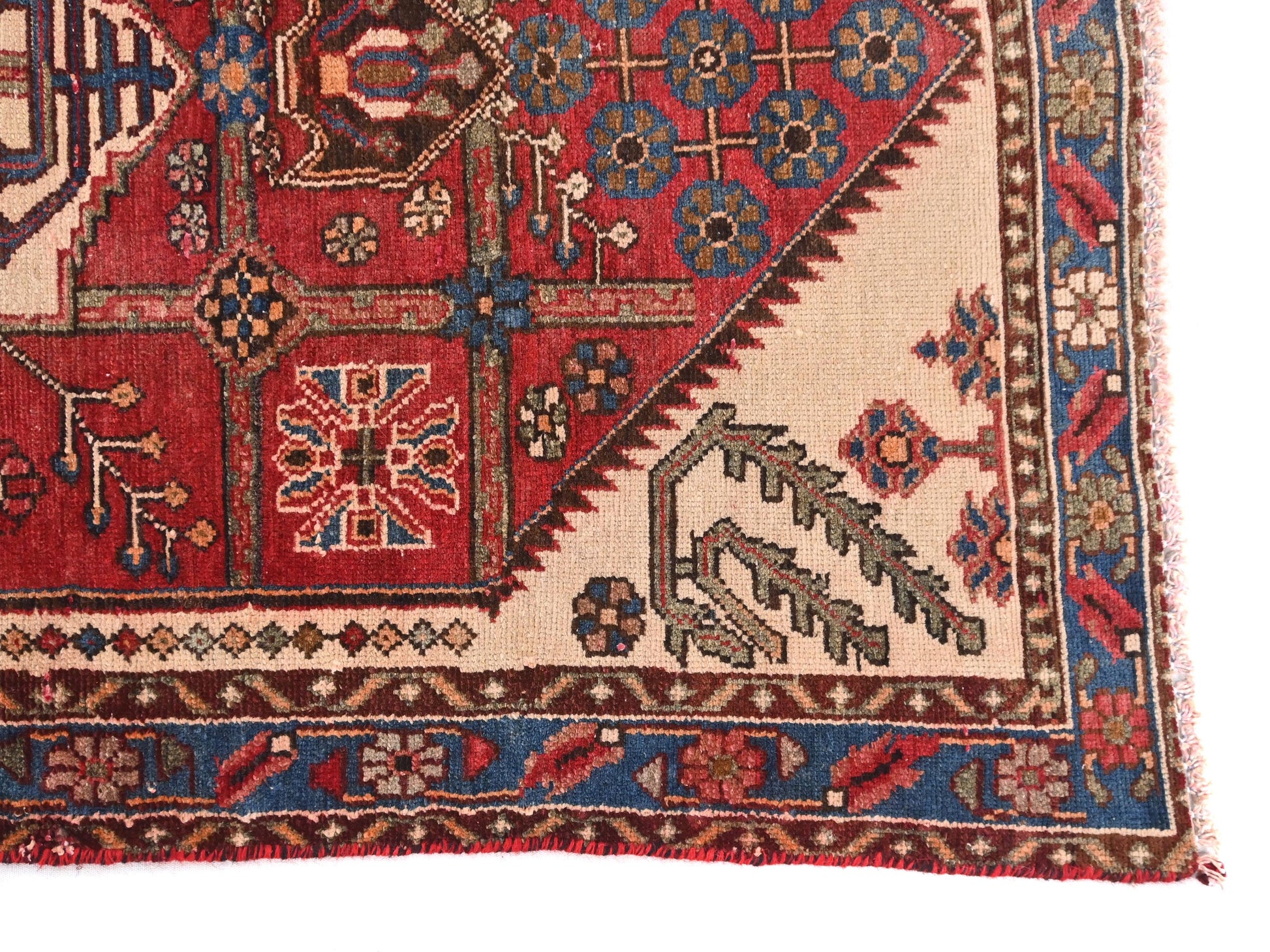 Embrace the allure of SHR518, a 3x5 handmade Turkish vintage tribal rug that captivates with its majestic centerpiece medallion. Surrounded by a complex interplay of tribal patterns and protective motifs, this rug showcases the depth of its cultural heritage. Each stitch resonates with the stories of yesteryears, while the deep reds and blues intermingle to form a visually striking piece. The weave is dense, indicative of the skilled artisans who have passed their knowledge through generations. Ideal for those who cherish both history and style, this rug serves as a stunning narrative of artistry and elegance, making it an exceptional addition to any collection.