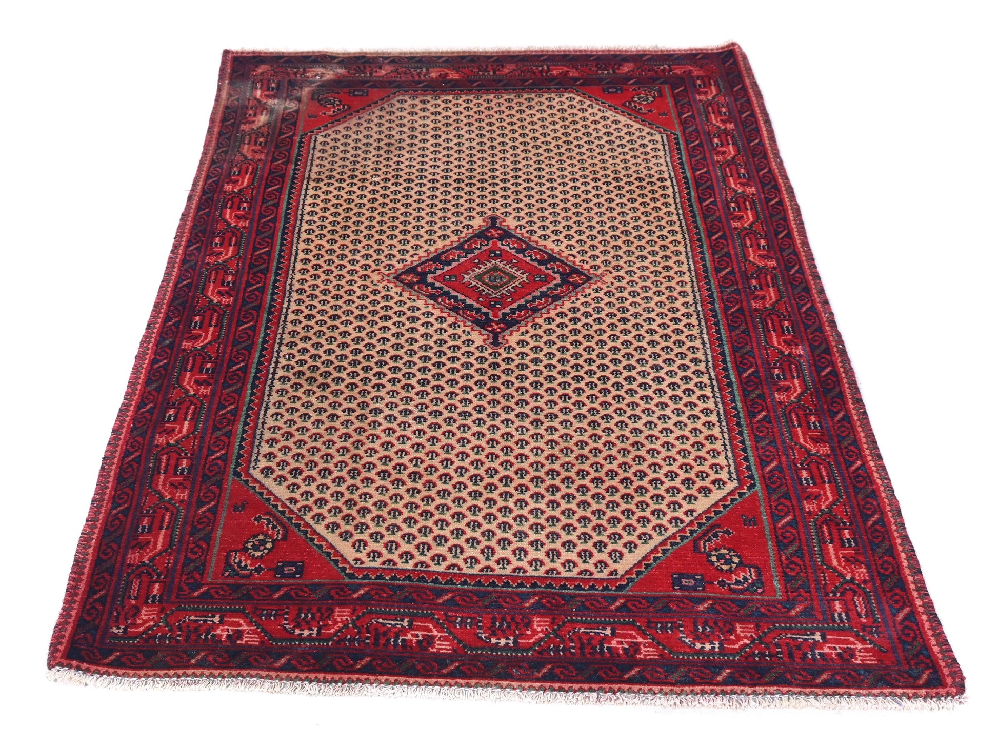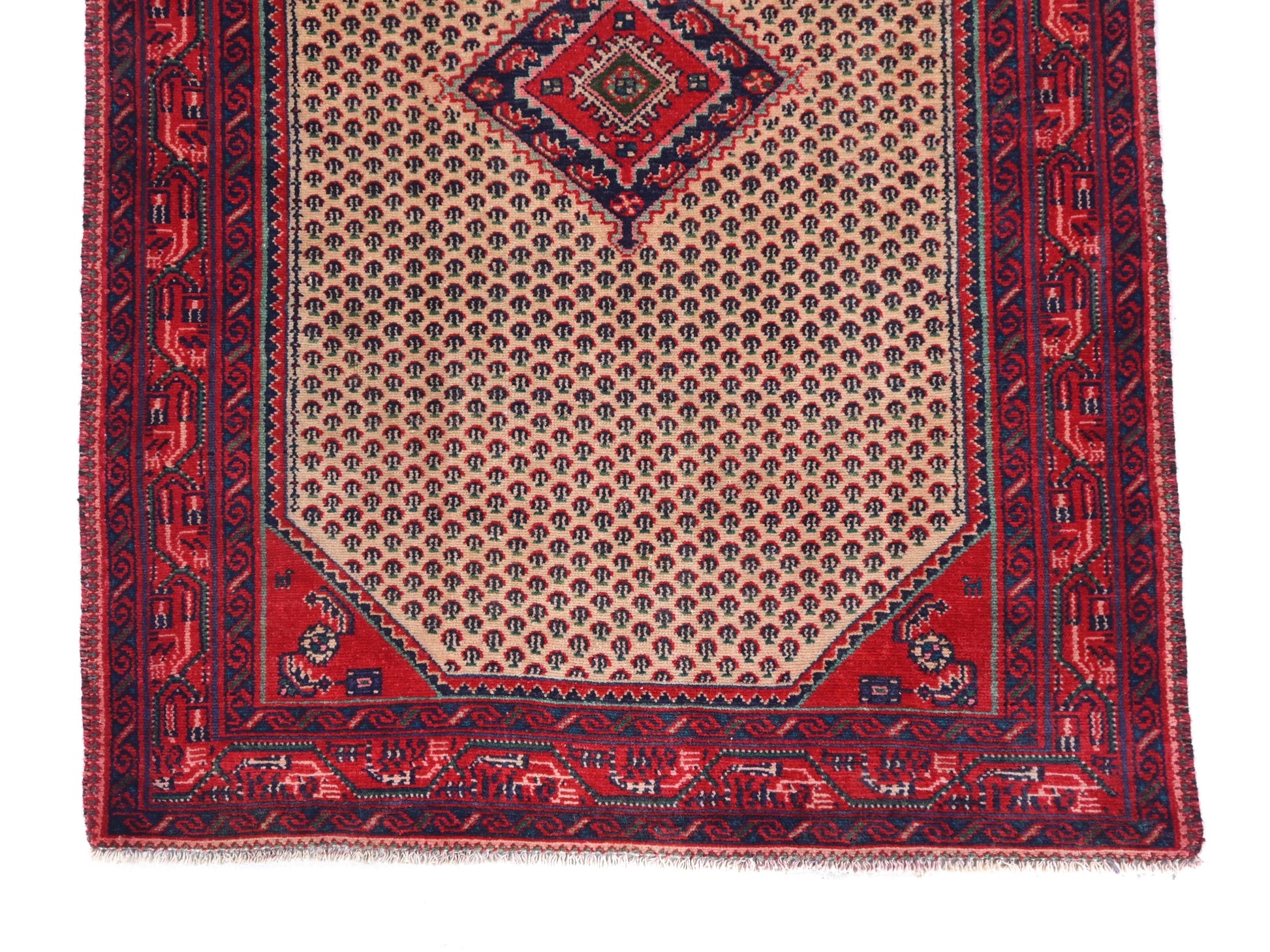 Framed by rich crimson borders and a striking central diamond medallion, this Turkish vintage rug is a radiant homage to Anatolian textile tradition. The ivory-blush field is adorned with a cascading motif of miniature floral teardrops, each woven with precision and symbolic charm. The corners echo this design language, forming a seamless visual journey from edge to center that draws the eye inward with elegance and restraint.