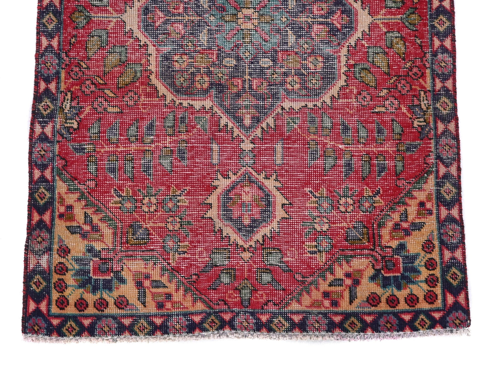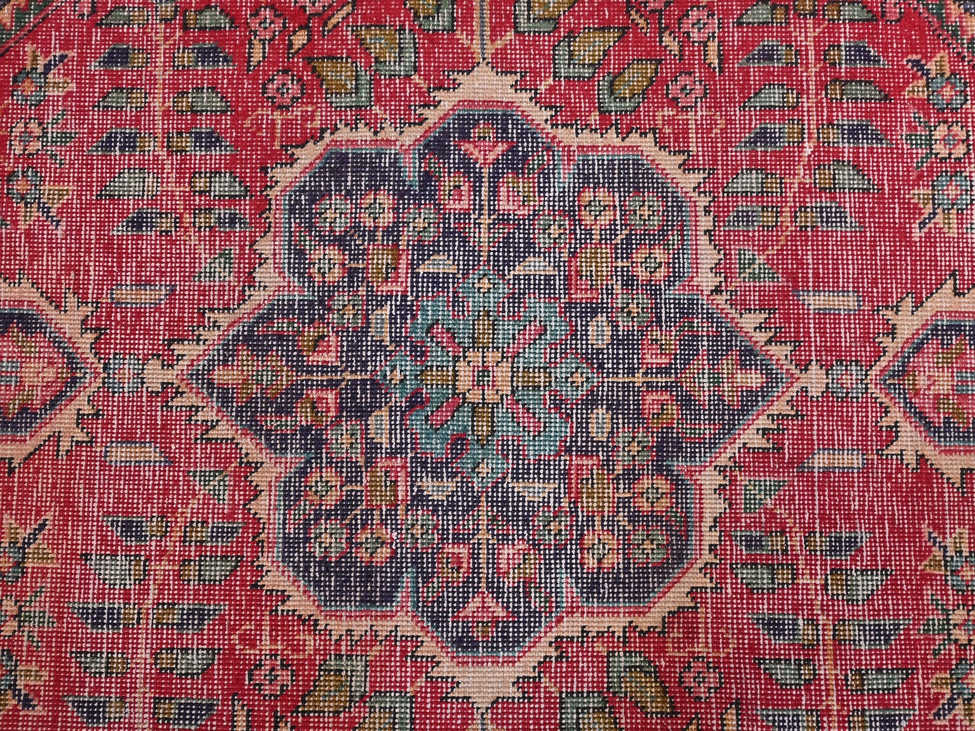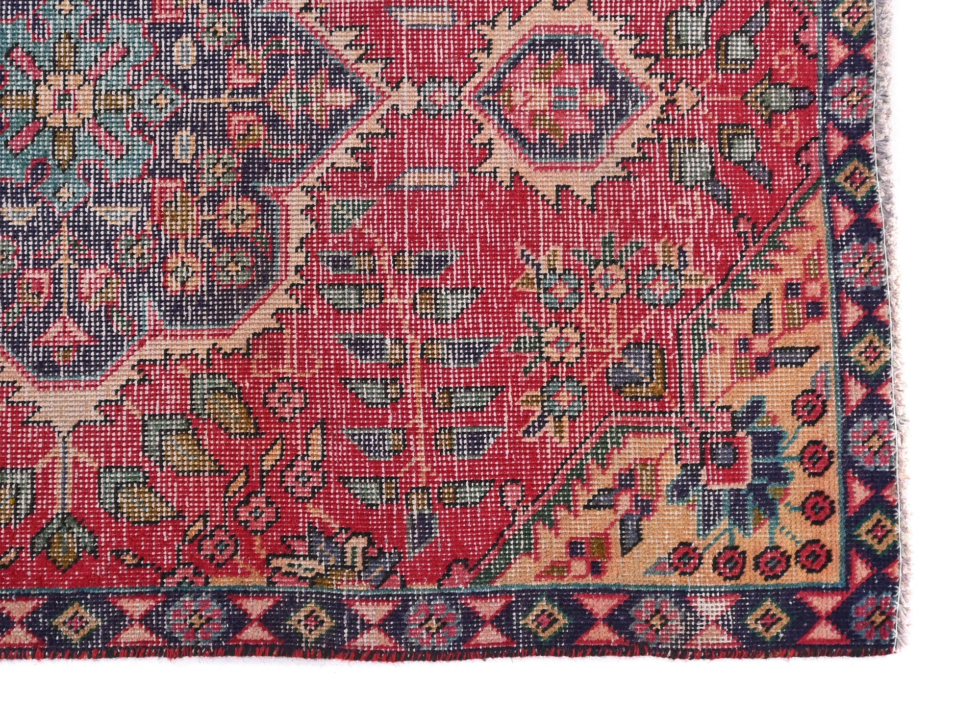 The majestic allure of the floral medallion central to this rug captivates with its vibrant color palette and intricate detailing. Celebrated for its classic beauty and skilled craftsmanship, this rug is a testament to the artistry of Turkish weaving. Its deep reds and soothing blues create a warm, inviting atmosphere, while the intricate floral and geometric patterns provide a stunning visual that complements any room.