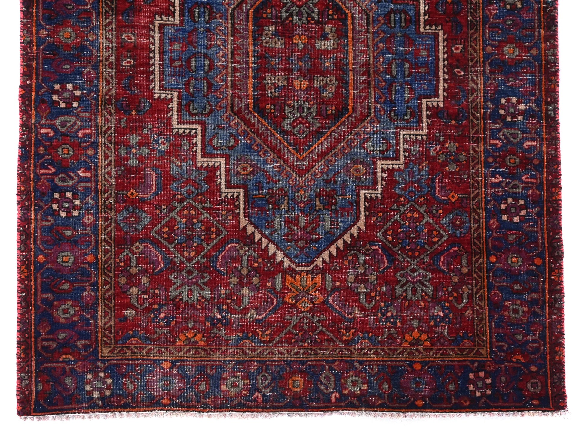 Discover the enchanting beauty of our vintage Turkish tribal rug, highlighted by its MAJESTIC GEOMETRIC FLAIR. Each knot of this rug tells a story of traditional craftsmanship and intricate artistry. The rug features a harmonious mix of deep blues and vibrant reds, framing a central geometric motif that captivates and draws the eye. This design element not only enhances its aesthetic appeal but also embodies a rich cultural heritage, making it a perfect statement piece for any sophisticated interior.