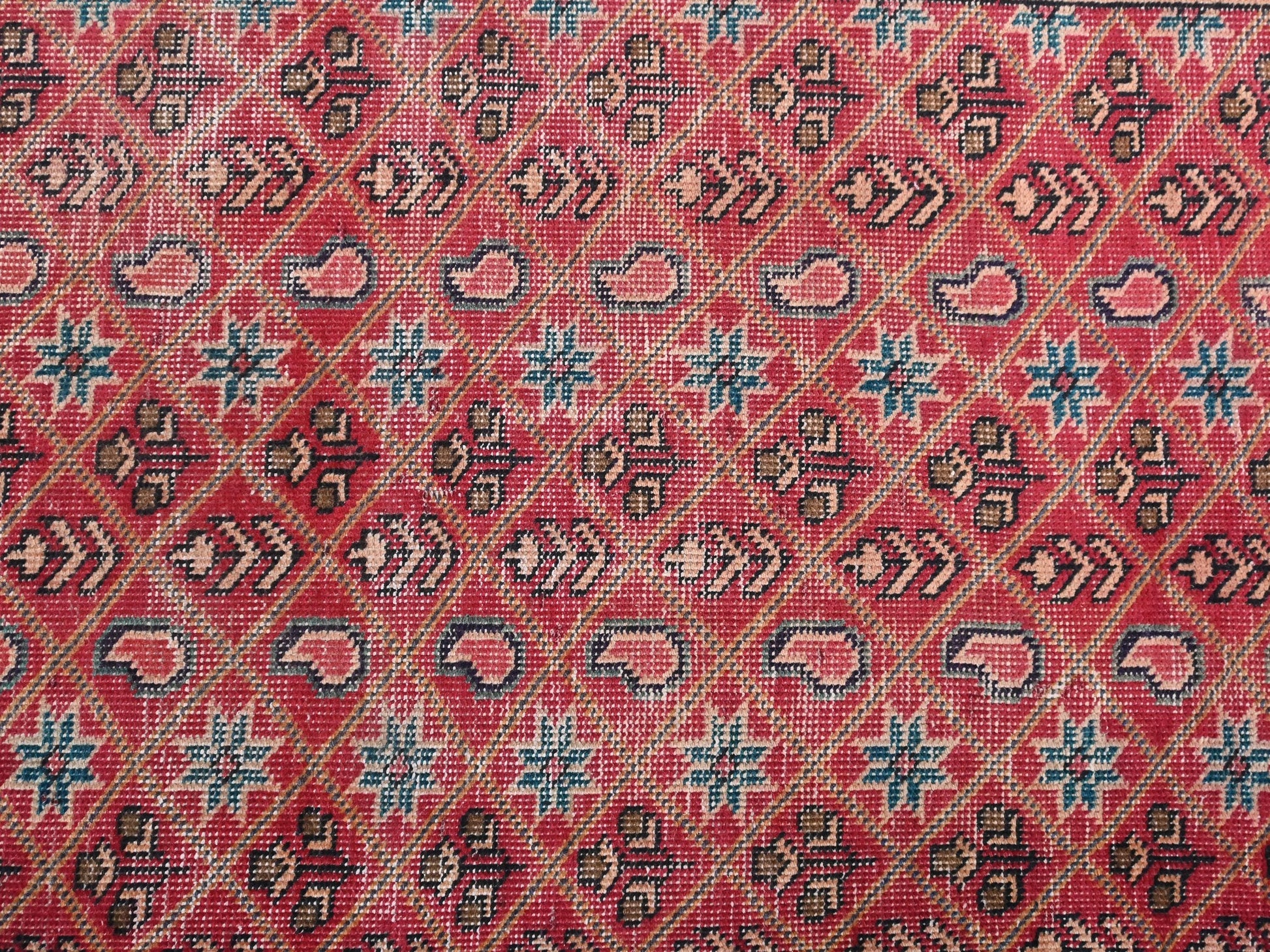 This handmade Turkish Sherazi rug, woven over a century ago, captivates with a field of red kissed by delicate age-worn fading. Its pattern features a mesmerizing array of star-shaped floral rosettes and paisley teardrops arranged diagonally in a rare, near-perfect tessellation. Framed by a warm sand-toned border lined with dual-motif rows, it balances intricate symmetry with rich cultural storytelling. The careful use of faded sky blues, cream, and mahogany shades within each geometric element gives it a painterly character.