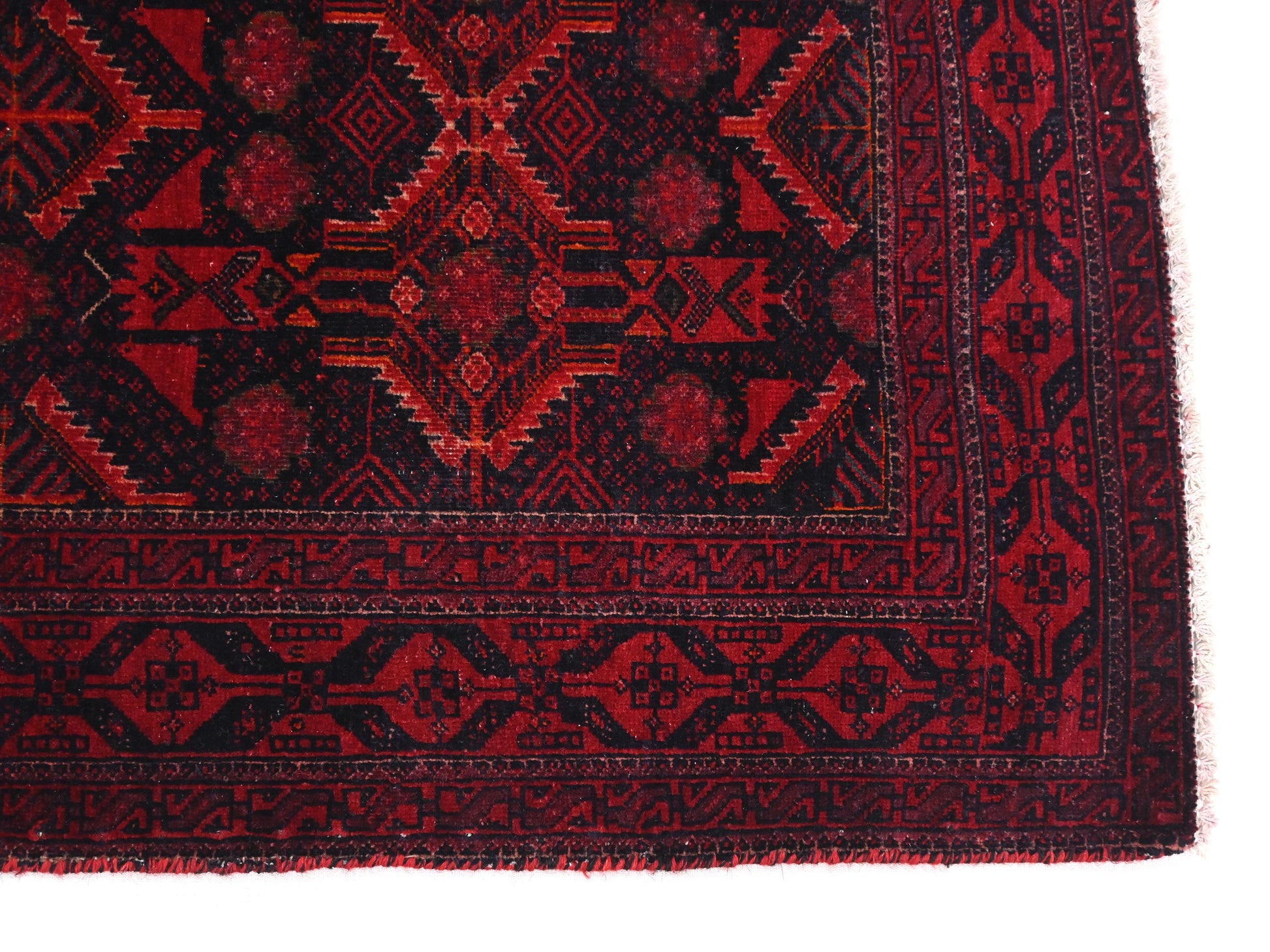 A captivating Turkish piece, this rug features a deep garnet backdrop intricately overlaid with a diamond trellis pattern. The sharp black and crimson contrasts create a bold, symmetrical design, rooted in traditional tribal artistry yet refined for modern spaces. Each motif carries echoes of centuries-old craftsmanship passed down through generations of Anatolian weavers.