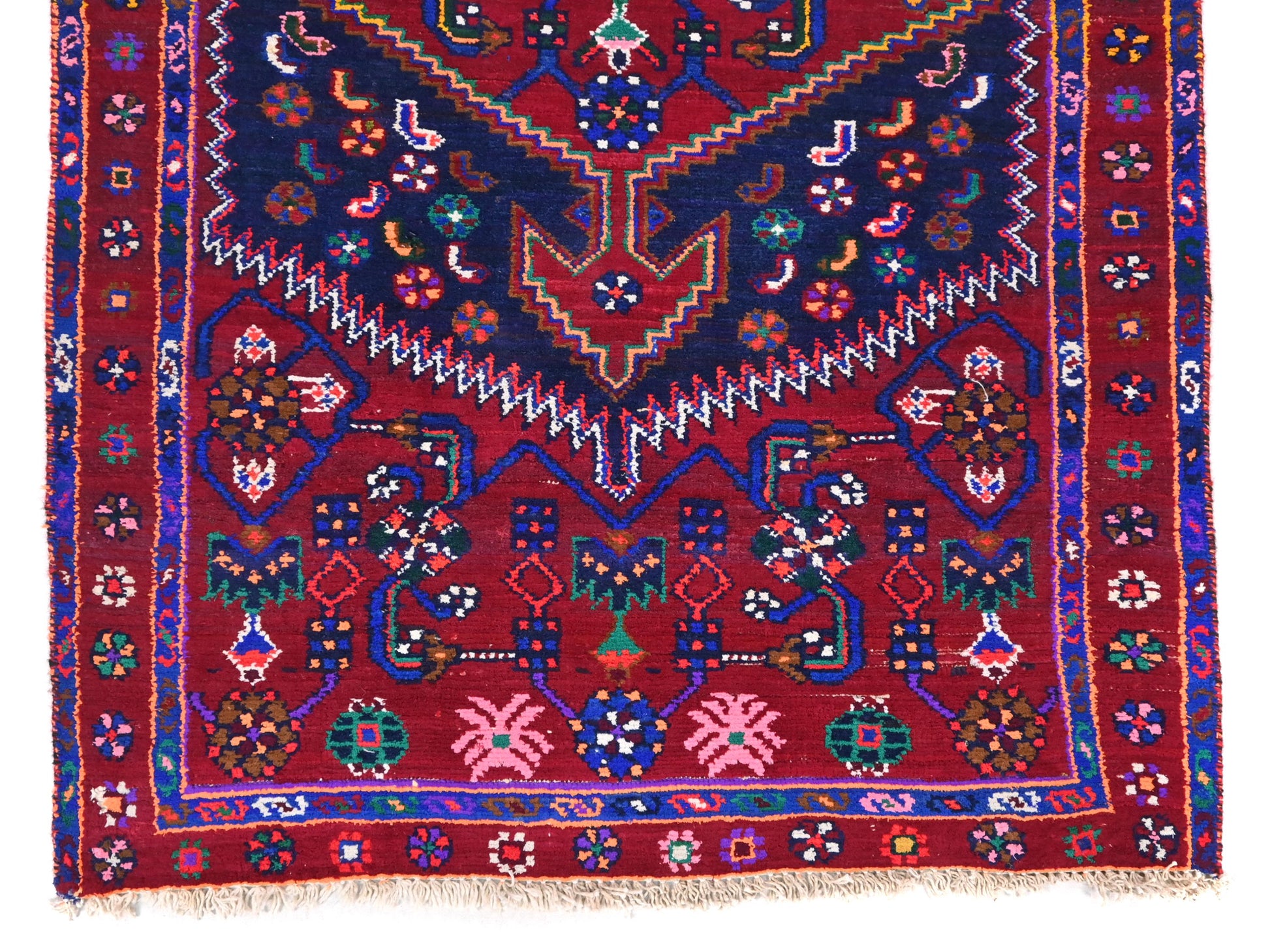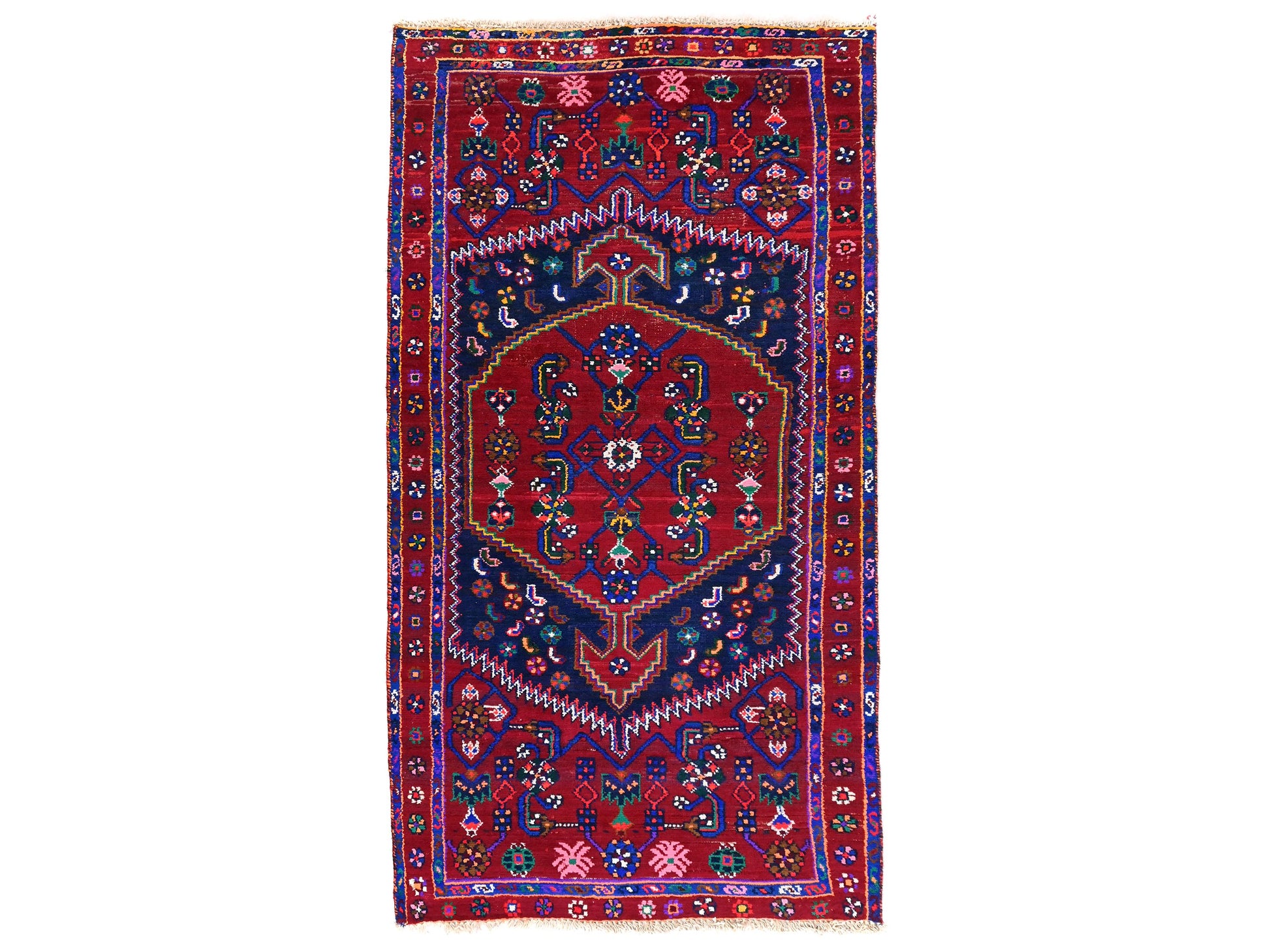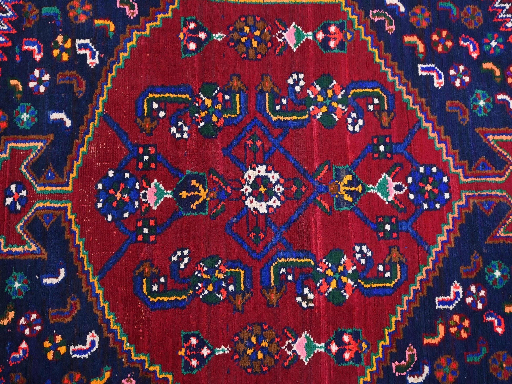 This 3x6 handmade Turkish vintage rug from 1970 features a mesmerizing palette of deep red and bold navy, anchored by a powerful hexagonal medallion surrounded by vibrant floral motifs. The rug’s ornate patterning is balanced by sharp jagged outlines, creating a dramatic tension between structure and fluidity. Each quadrant bursts with colorful botanical and tribal detailing, giving the piece a vibrant, energetic personality that commands attention.