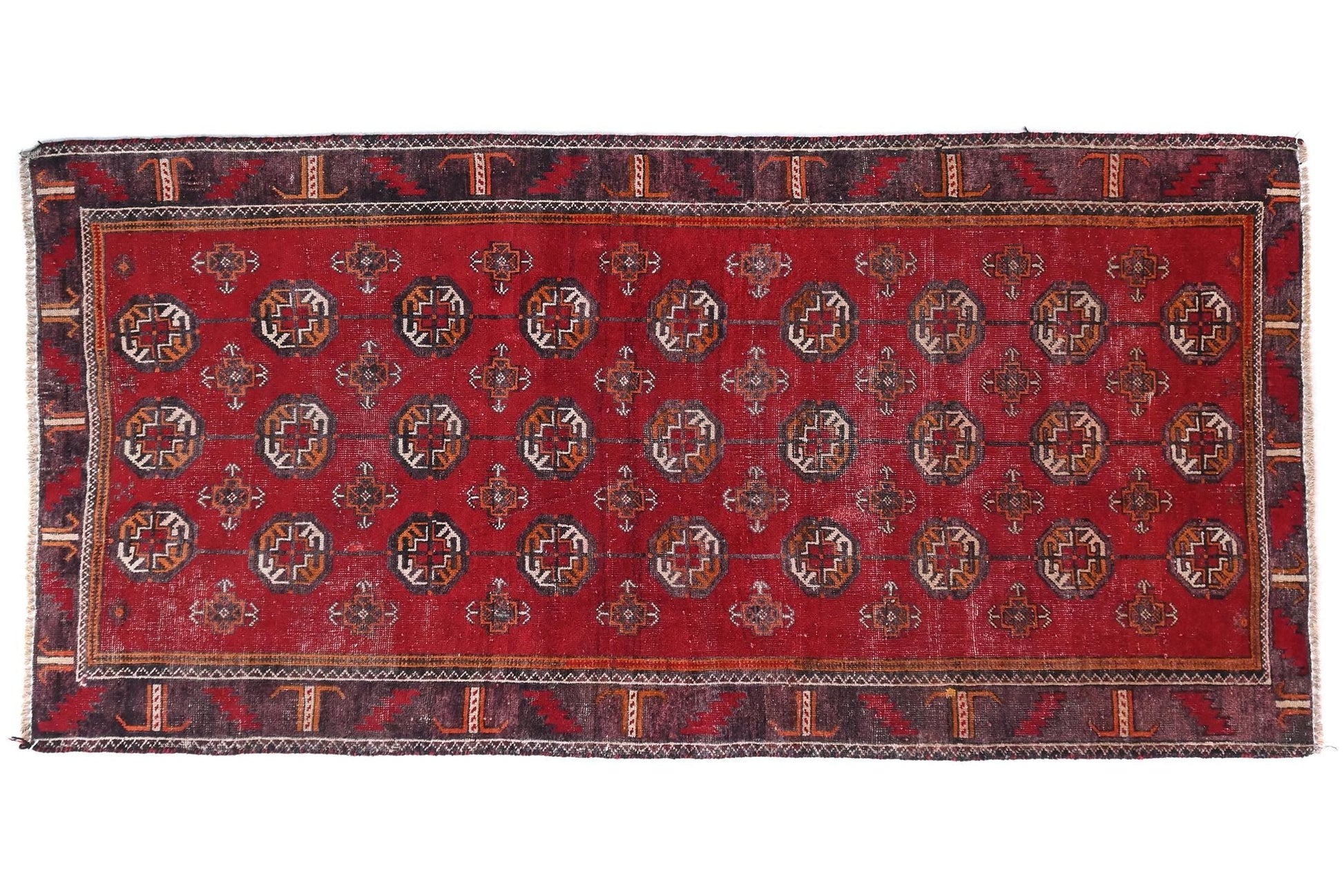 This 3x6 handmade Turkish vintage tribal rug features a mesmerizing arrangement of octagonal "gul" medallions, deeply rooted in traditional Turkmen design. Set against a rich crimson field, each medallion is framed with intricate tribal motifs and smaller floral rosettes, all enclosed by a bold geometric border in dark espresso and burnt copper tones. The layout’s symmetry and contrast make it a dynamic piece that instantly commands attention in any room.