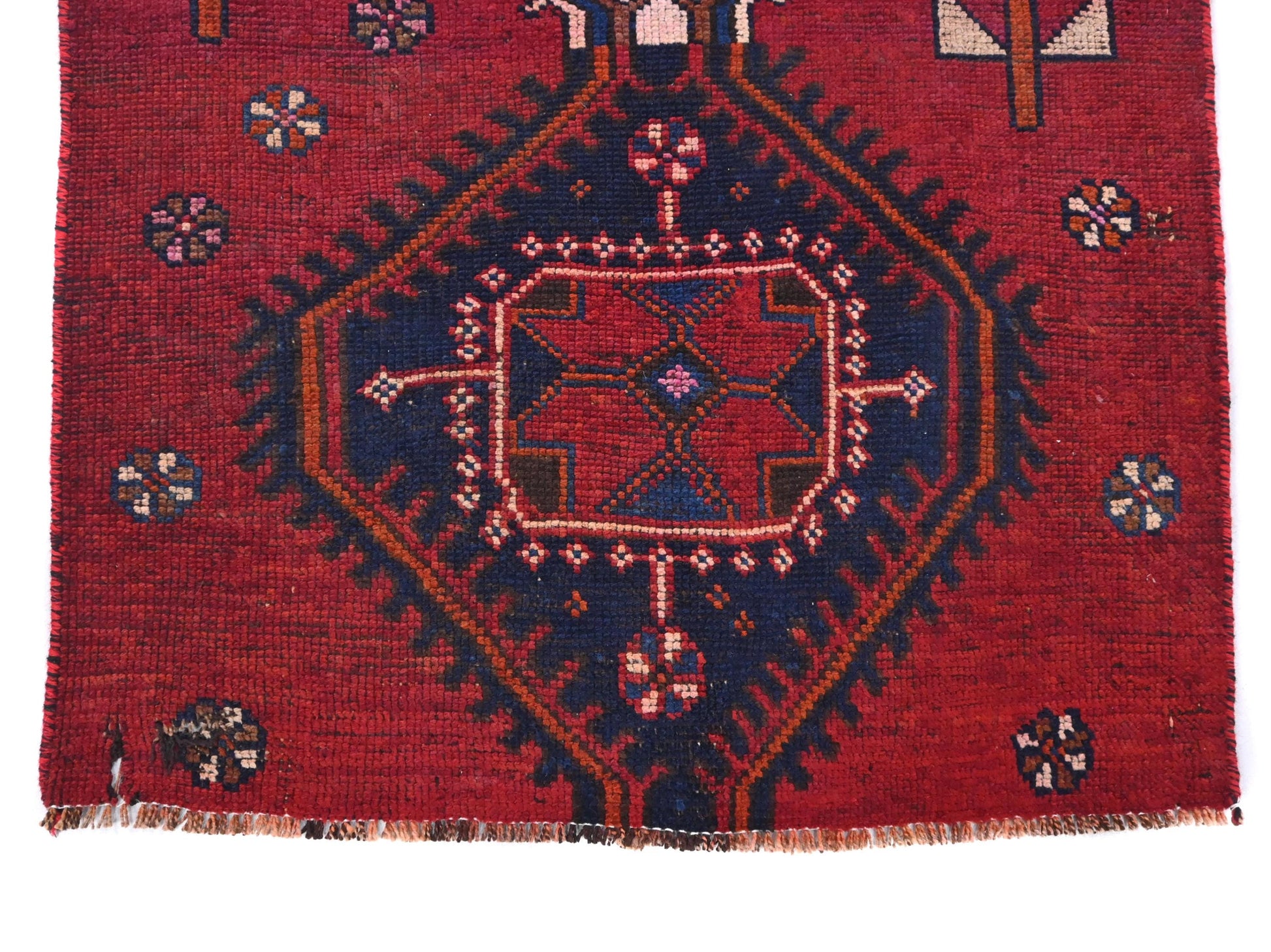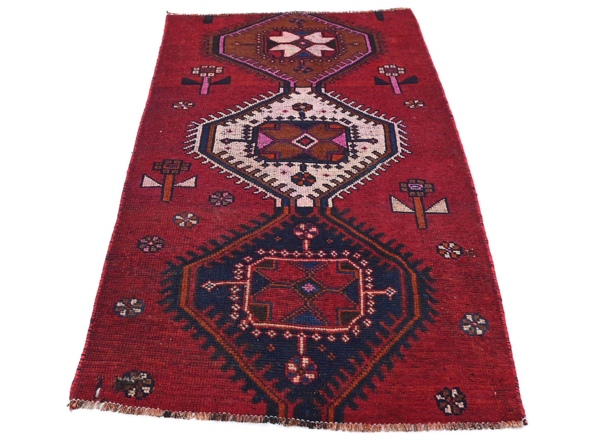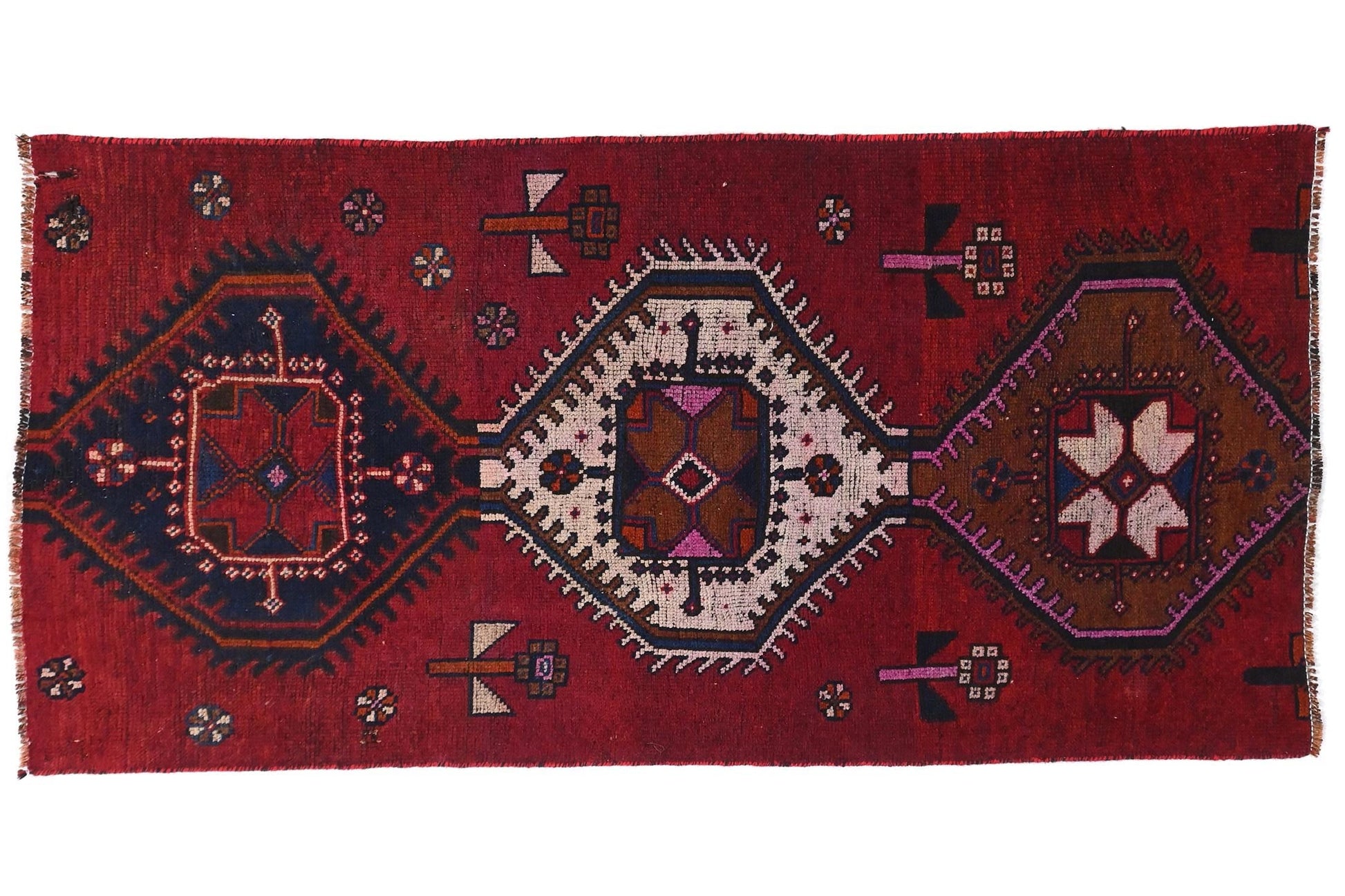 This 3x6 handmade Turkish vintage rug from 1970 showcases a distinctive series of stacked hexagonal medallions, each bursting with character and individuality. Set on a vibrant red field, the medallions alternate in color — from chestnut brown to ivory to deep navy — and are punctuated with tribal florals and charming small rosette motifs. The composition gives a balanced, almost totemic structure that draws the eye vertically and makes a bold artistic statement.