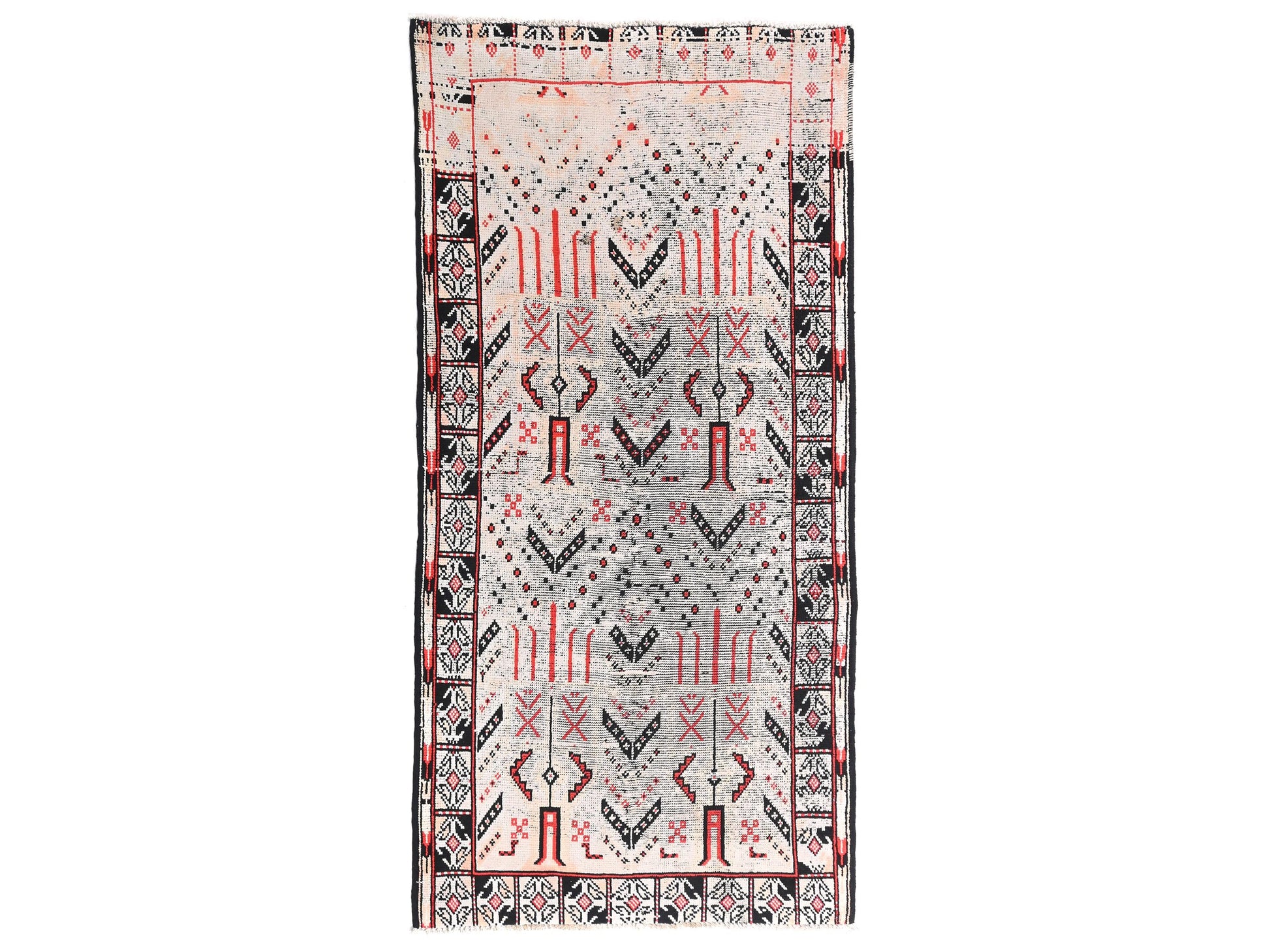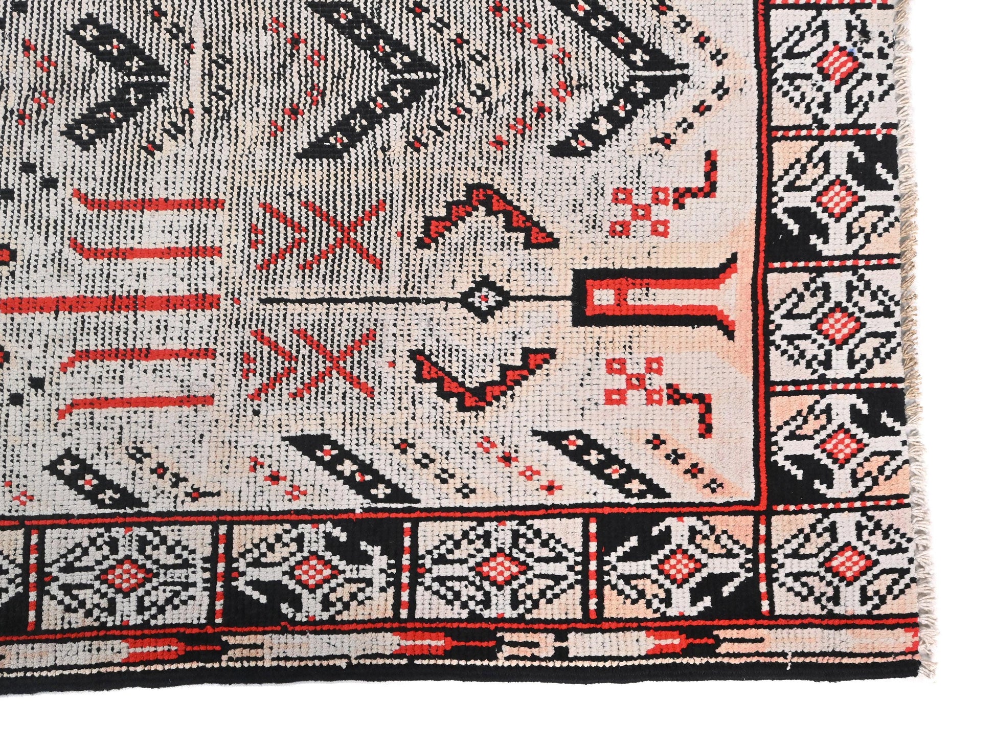 This handmade Turkish vintage tribal rug is a true collector's piece, combining ancient Anatolian symbolism with contemporary bohemian charm. The central focus of the design features arrow-like motifs and fertility symbols that once adorned village homes as blessings of abundance, strength, and prosperity. Framed by a striking black and crimson floral border, this piece is the perfect conversation starter for your home entrance, hallway, reading corner, or studio.