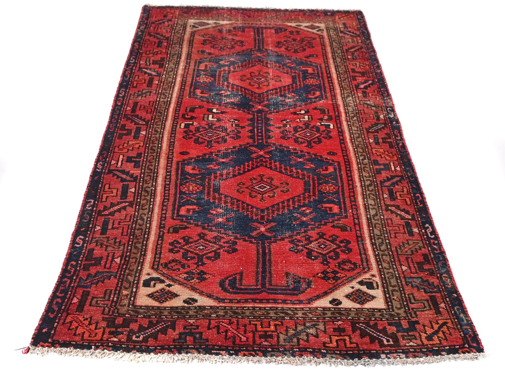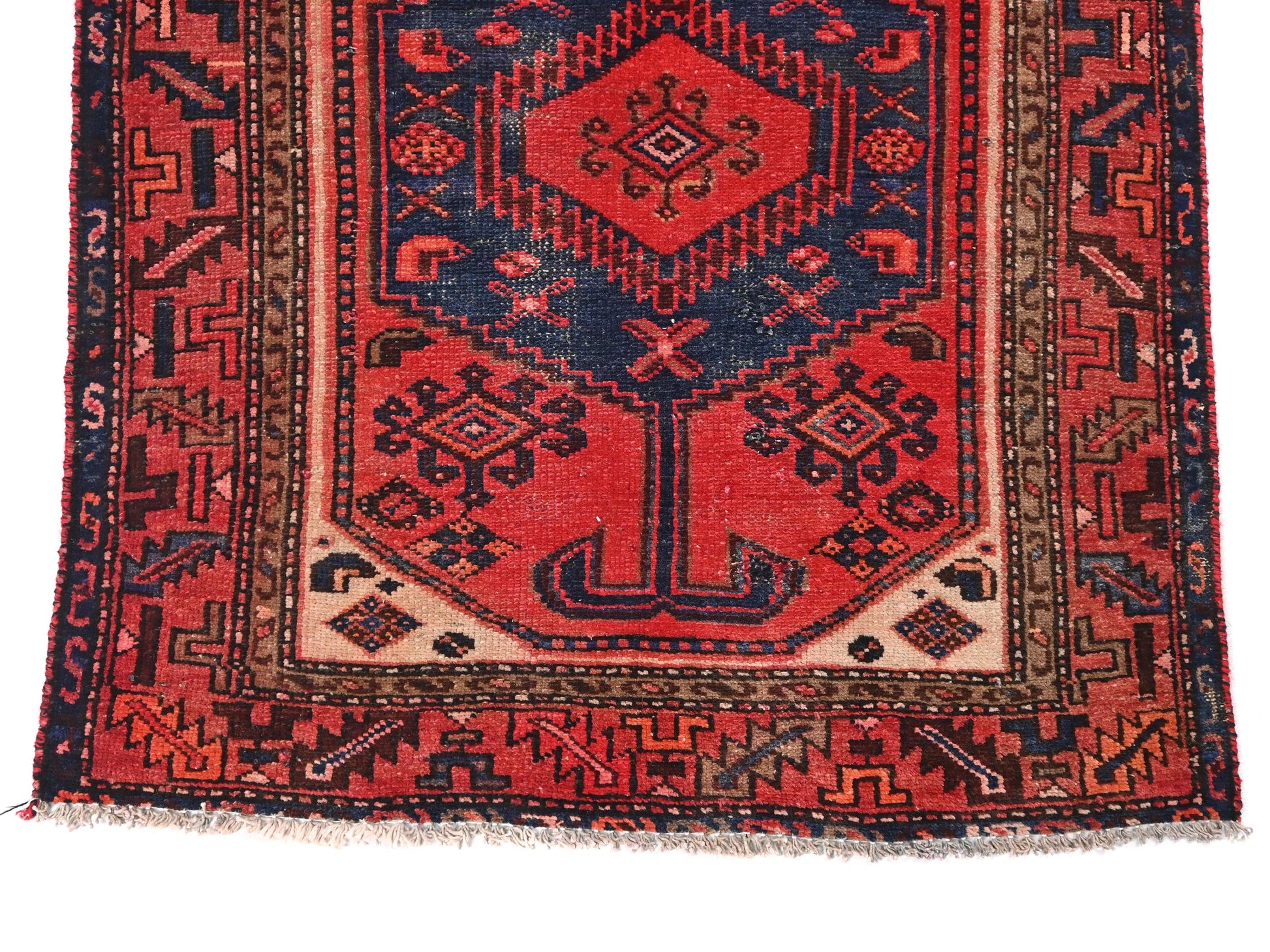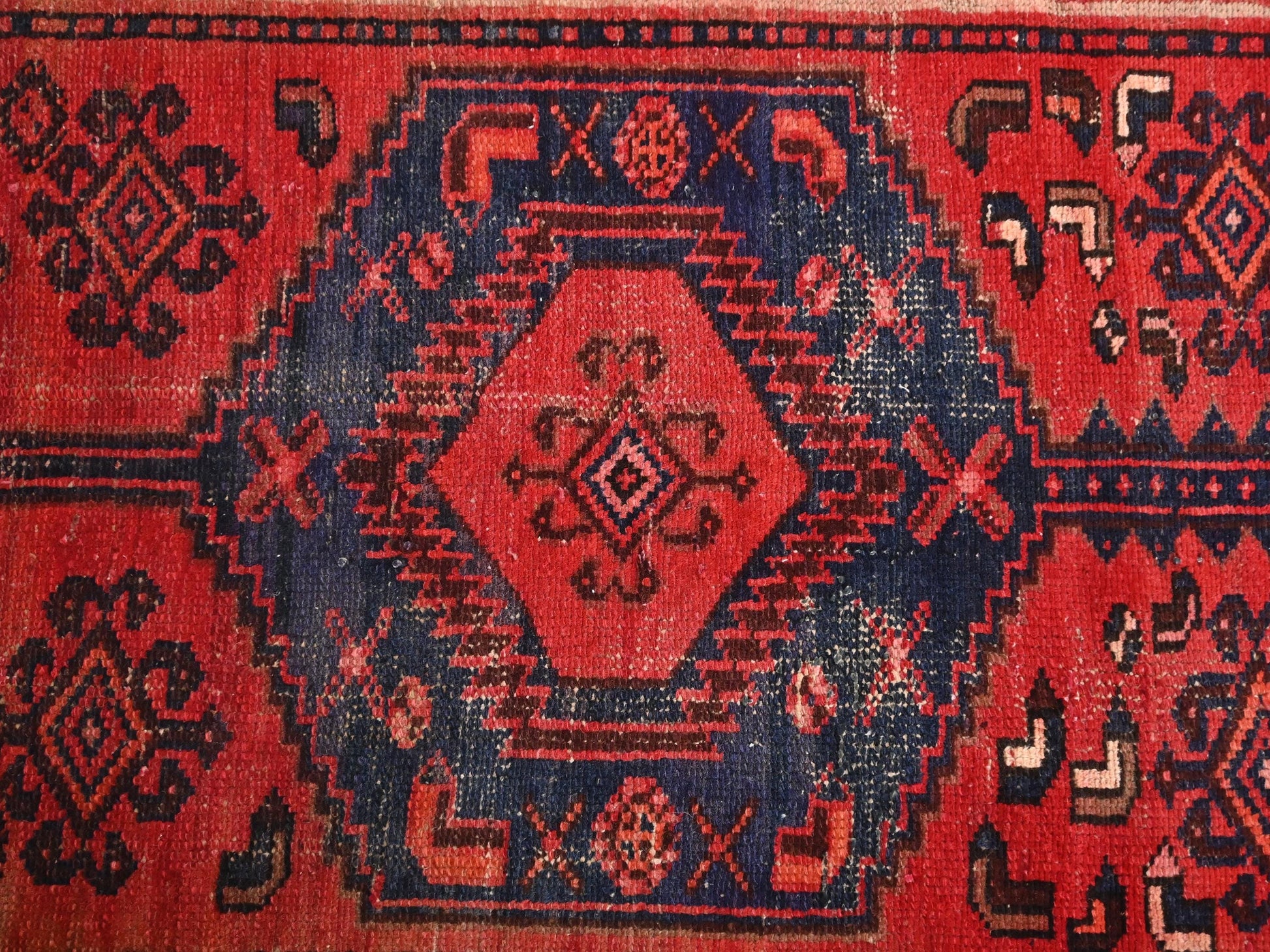 This 3x7 handmade Turkish vintage rug from 1970 features bold hexagonal medallions stacked along its center, framed by an intricate inner border. A saturated red background is overlaid with deep navy medallions, each holding symmetrical motifs reminiscent of tribal emblems. Ivory corner spandrels break the intensity with their contrast, guiding the eye to the central motifs.