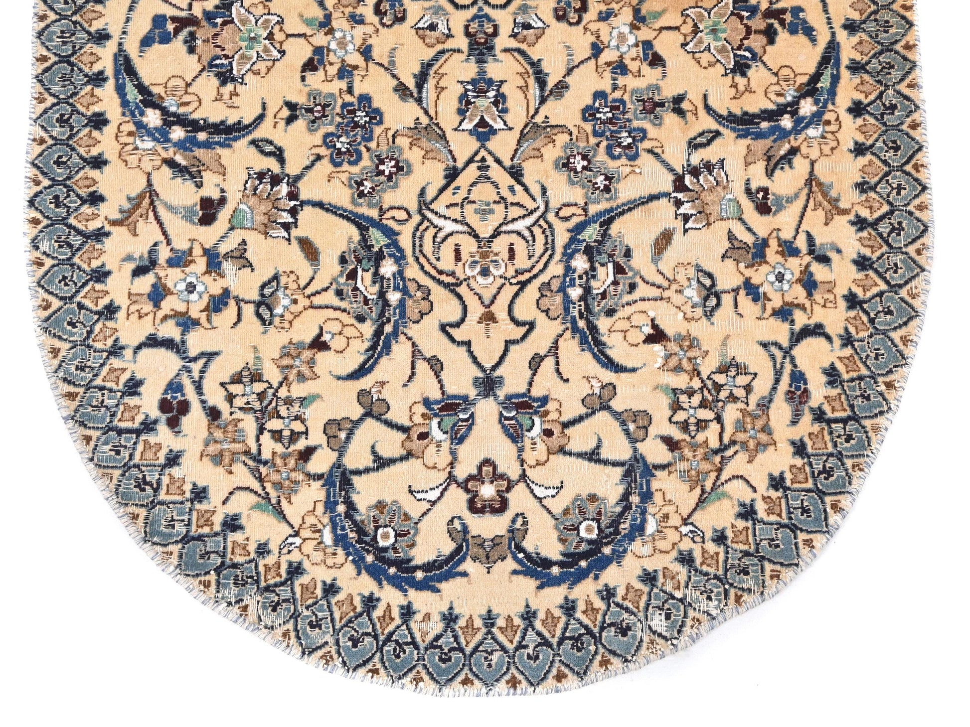 This 3x7 handmade Turkish vintage rug from 1970 is a stunning oval-shaped piece featuring an ornate central medallion in midnight blue, framed by an elaborate spread of floral and vine motifs. The beige backdrop softens the intensity of the navy and charcoal detailing, creating a graceful and harmonious balance. Woven with precision at 12 knots per square inch, this rare format is both a visual and structural treasure.