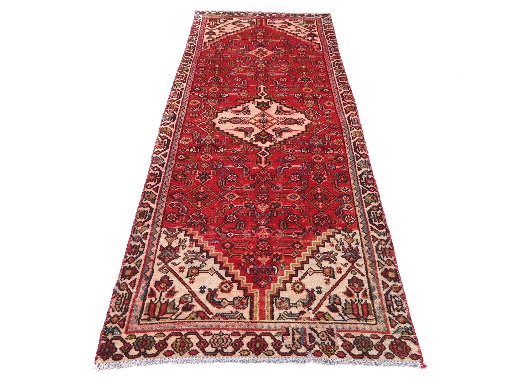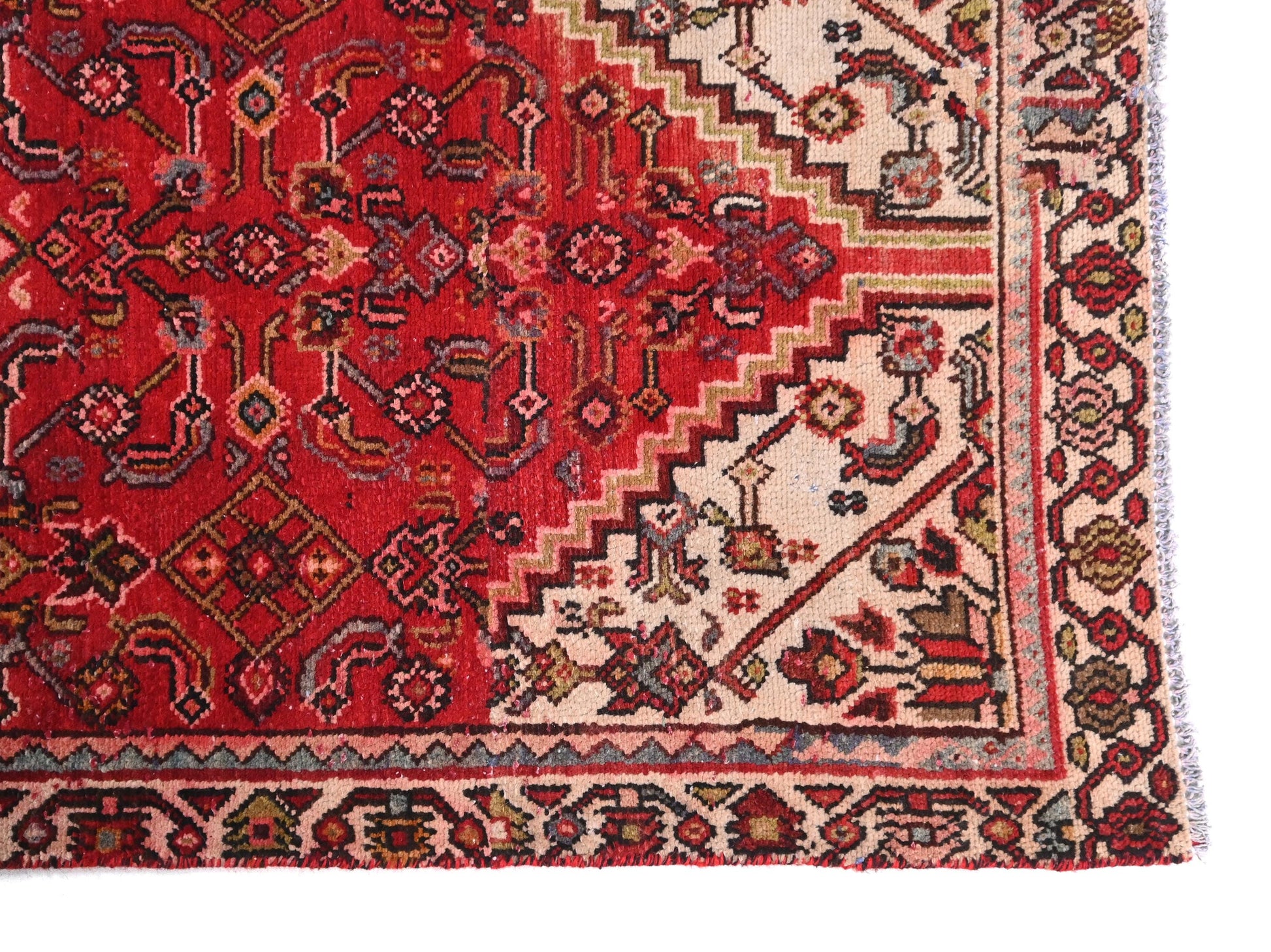 This 3x8 Turkish handmade tribal rug from 1970 presents a deep red field bursting with traditional geometric medallions and ivory corner spandrels that add remarkable structure to the composition. At the center, a bold cream and brown diamond-shaped motif anchors the design, drawing the eye in with its perfect symmetry. The surrounding motifs mimic architectural elements with sharp angles and rhythmic patterns that give the piece a sense of controlled movement. The rug’s borders, adorned with floral and vine-like patterns, lend softness to its otherwise bold layout.