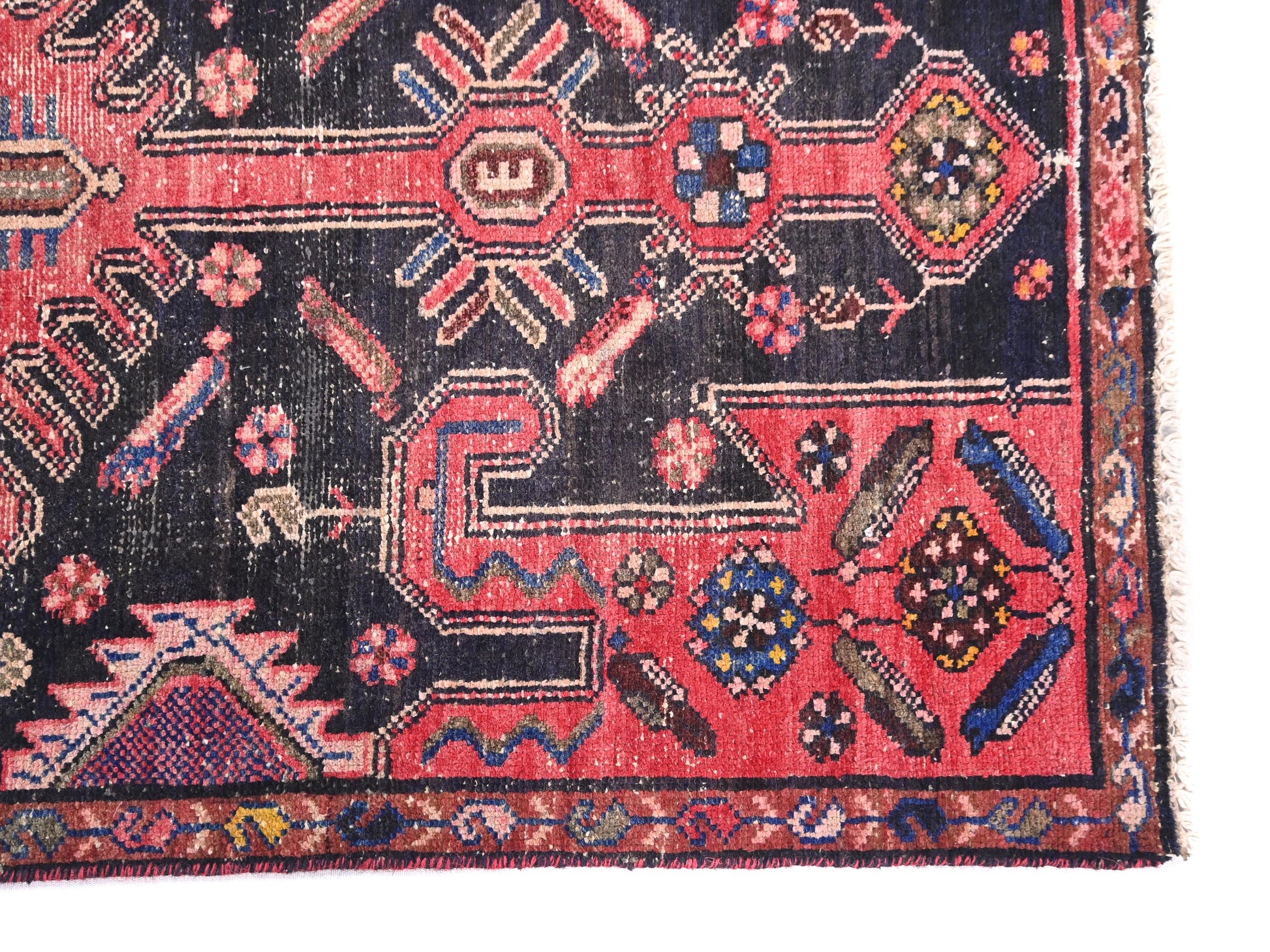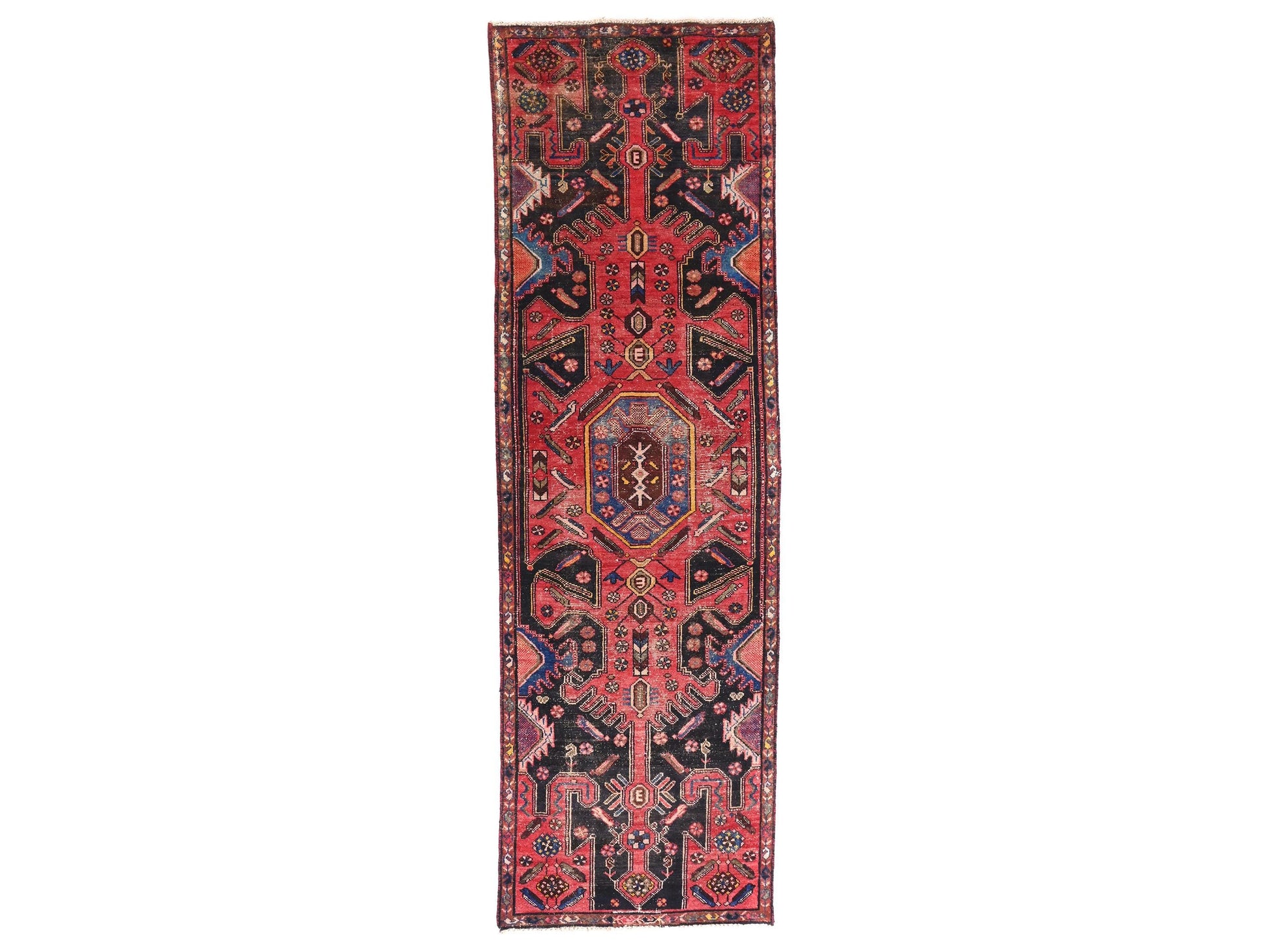 This 3x9 handmade Turkish vintage rug from 1970 features a bold brick red field contrasted with navy and mauve geometric elements and mirrored motifs throughout. The elongated medallion is framed by intricate angular motifs that create movement and energy, while warm accent tones bring balance to the design.