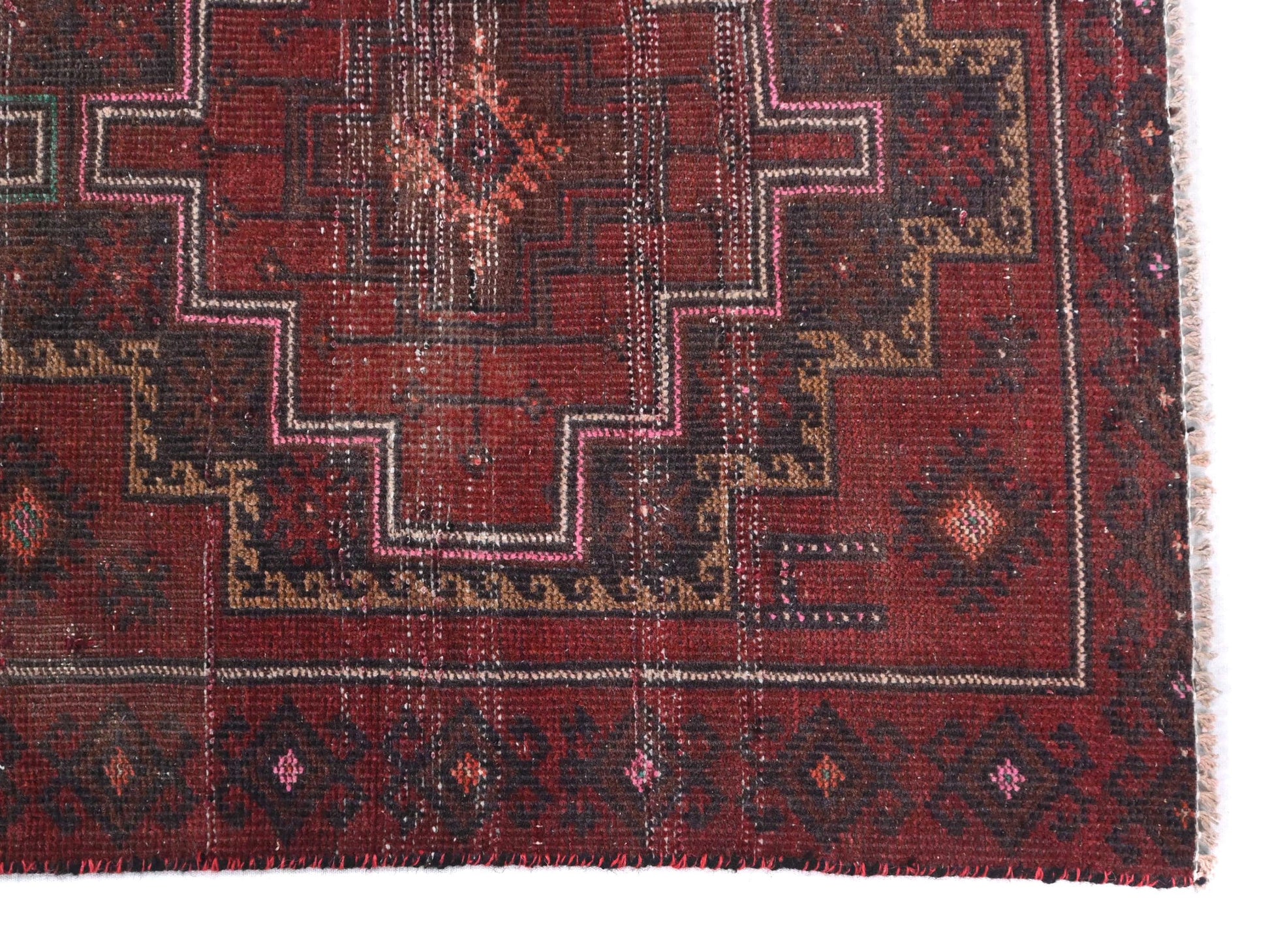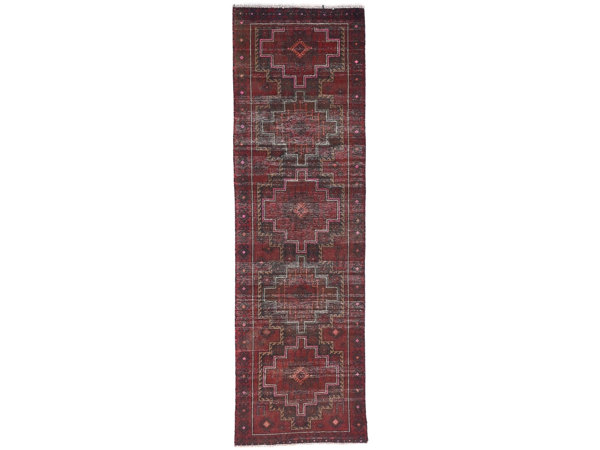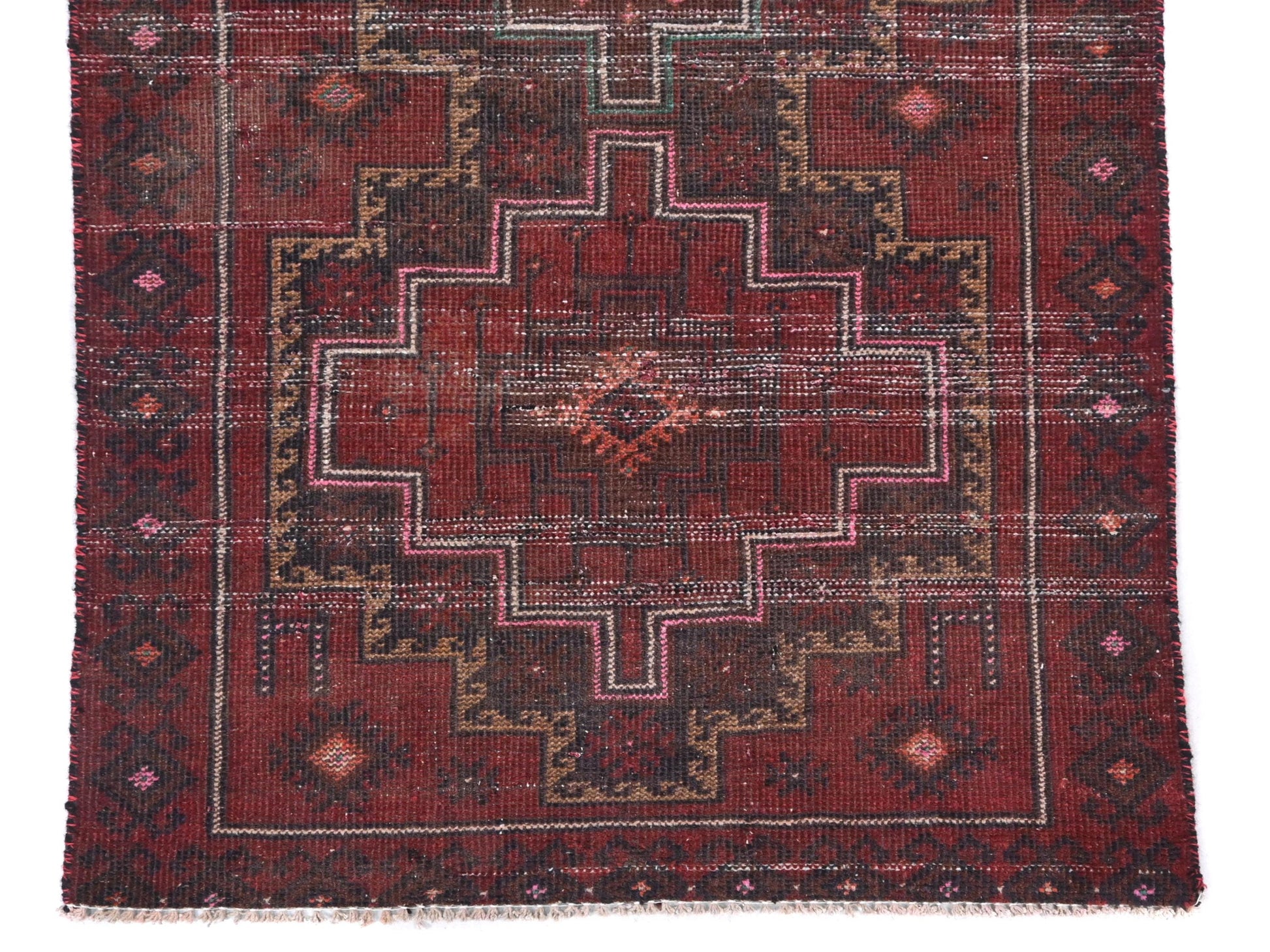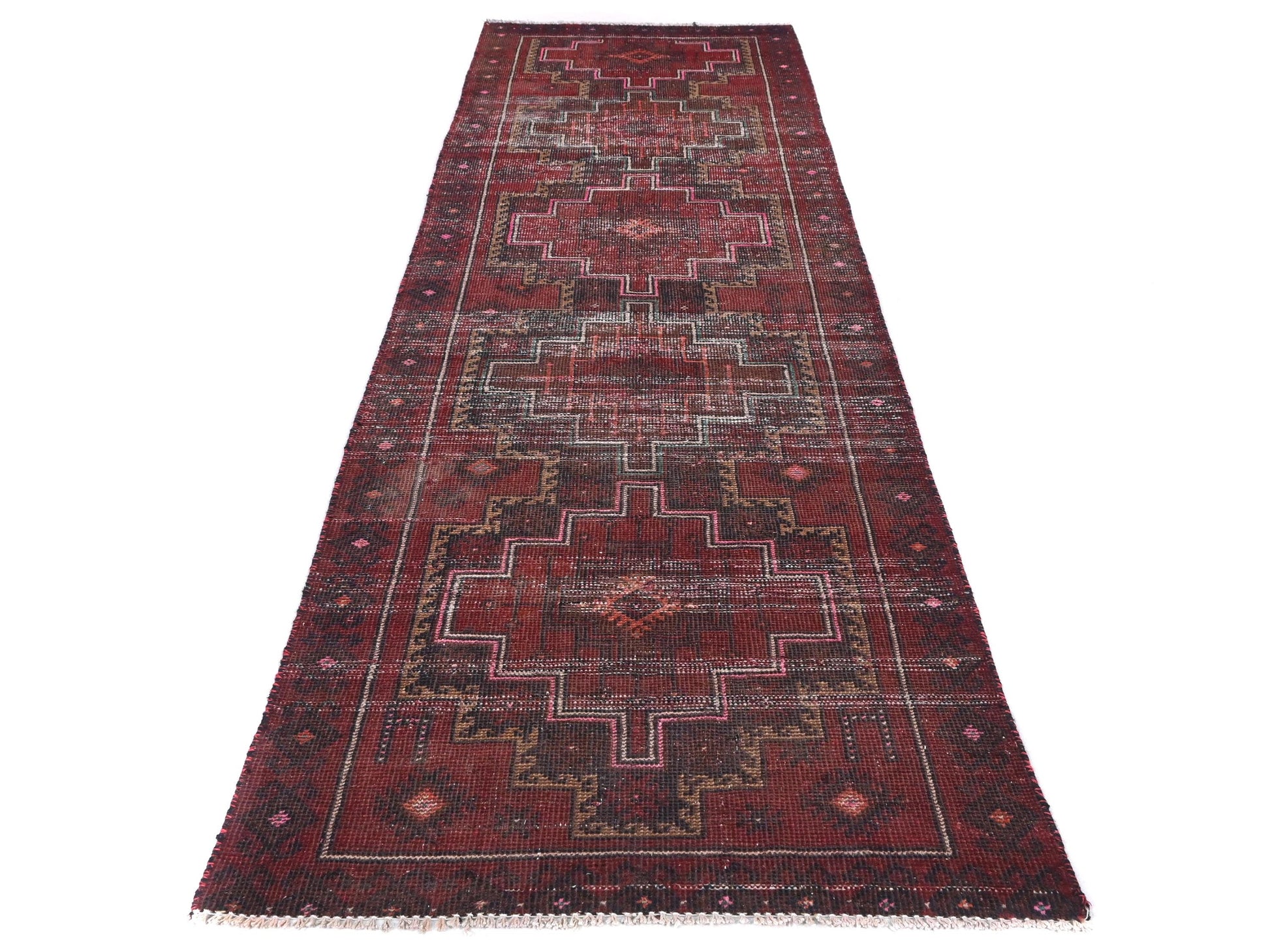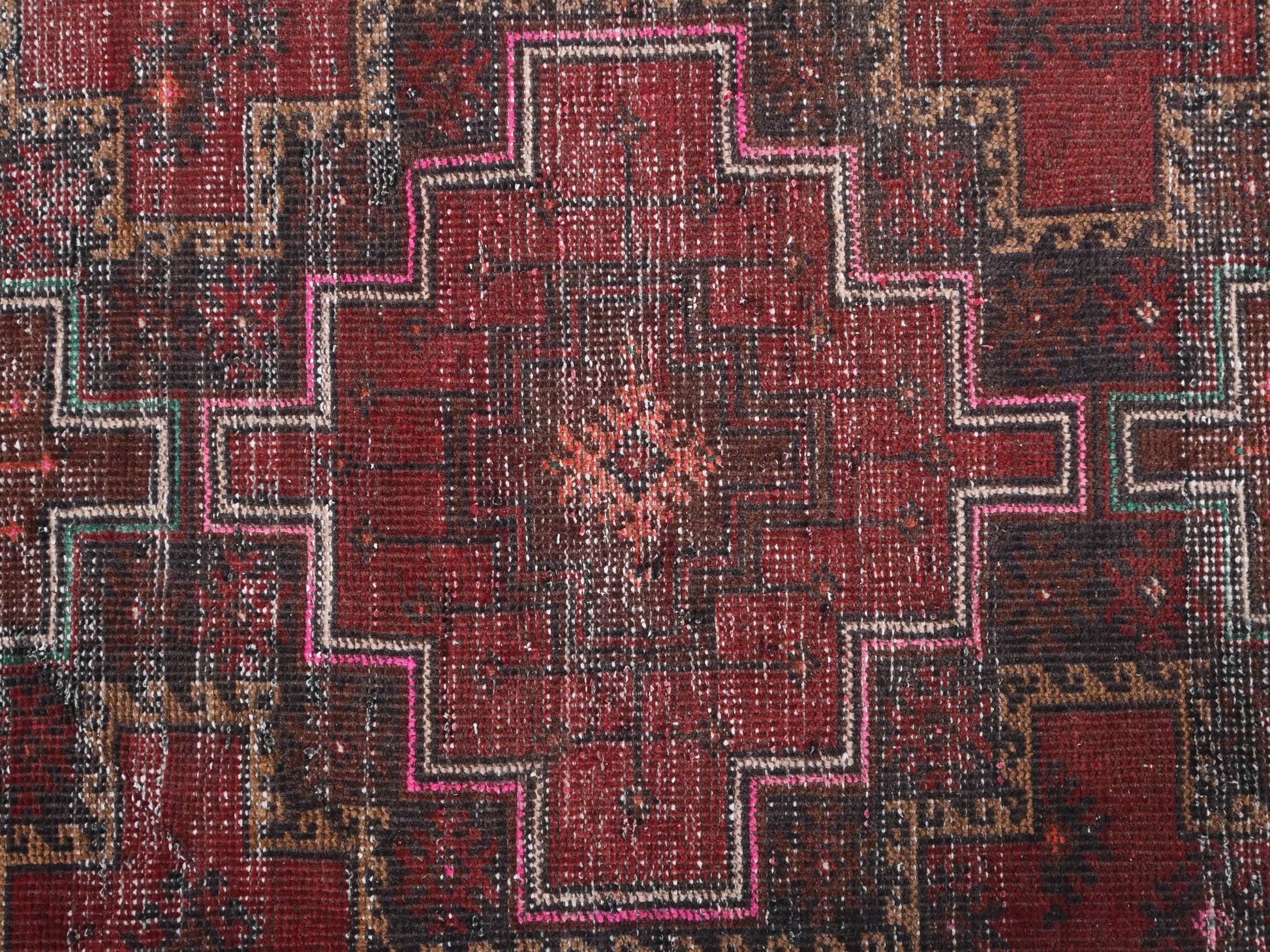 This 3x9 handmade Turkish vintage rug from 1980 brings a striking blend of boldness and warmth into your home. The field showcases a brick red hue with prominent stepped medallions outlined in soft pink, creating a beautiful contrast against the darker earthy tones and linear tribal borders. Each medallion varies slightly in pattern and wear, adding a sense of movement and charm to the long runner. The structured geometry of the design gives it a modern feel while retaining traditional Turkish influences.