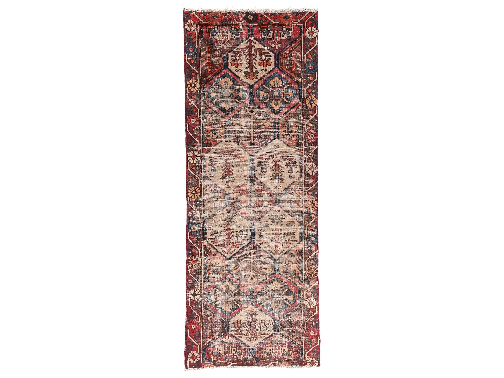 This 3x9 handmade Turkish vintage tribal rug from 1970 presents a striking chain of cream-toned hexagonal medallions, each decorated with tree-of-life and floral motifs. The alternating dark indigo and muted red backgrounds within each hexagon lend depth and movement to the design, while the borders are framed in a rich palette of brick red, midnight blue, and ivory tones.
