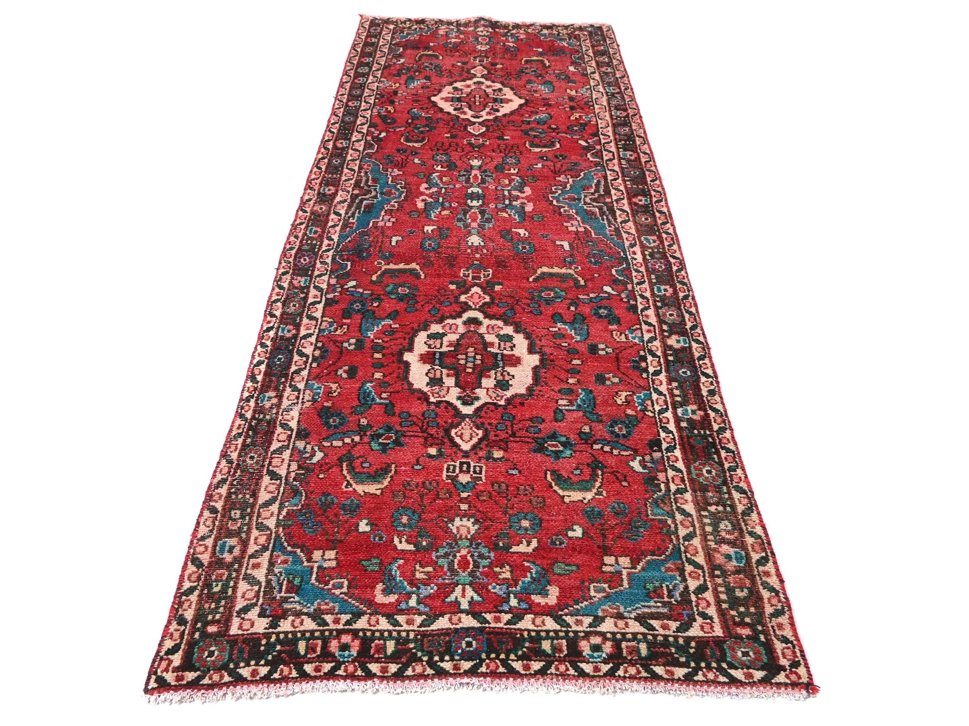 This 3x9 handmade Turkish vintage rug from 1970 features graceful ivory floral medallions that stand out beautifully against a bold red field. Framed by intricate navy and cream borders, its vertical symmetry creates a timeless elegance, perfect for hallways or narrow spaces in need of warmth and character.