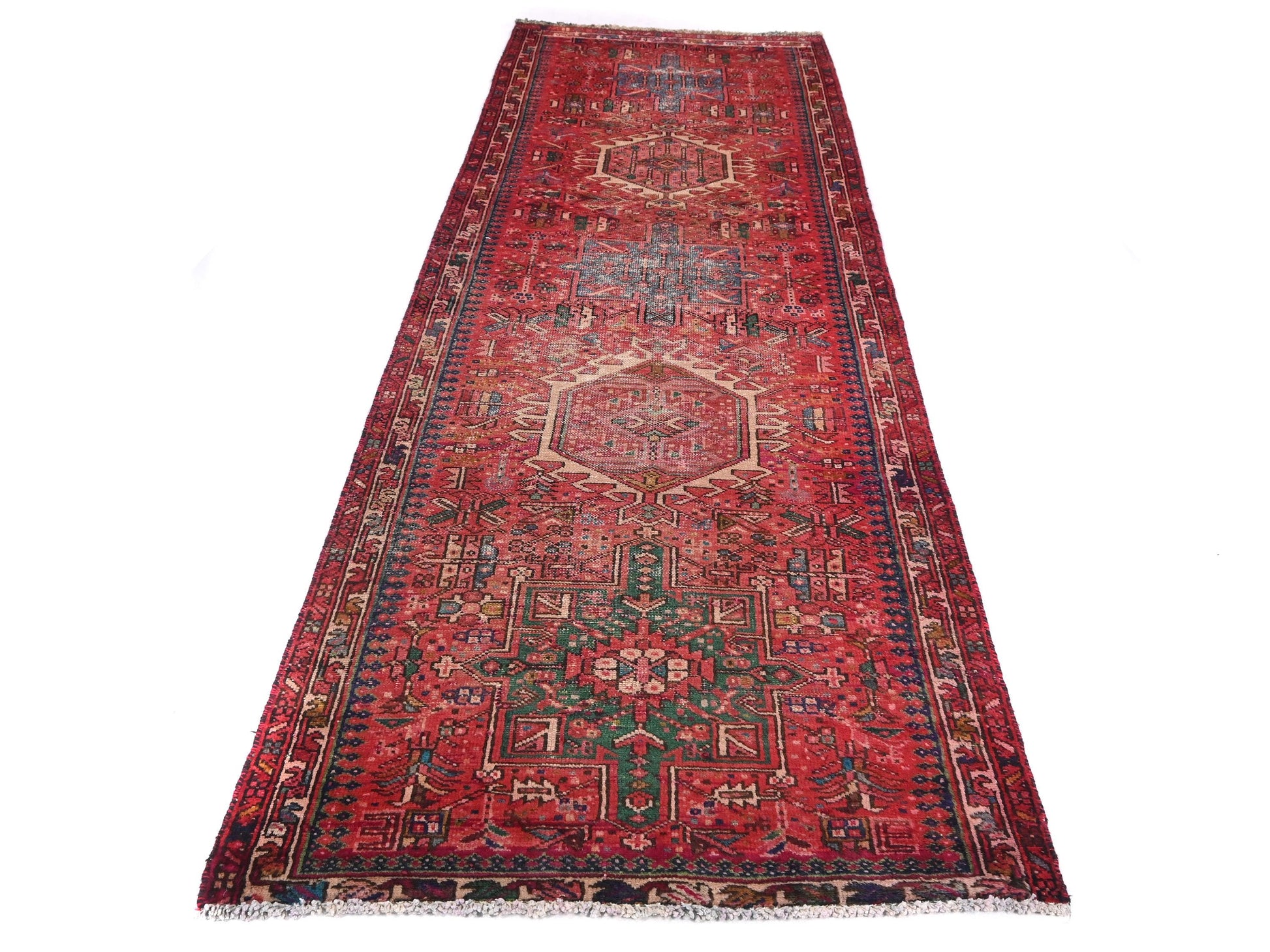 This striking 3x9 handmade Turkish vintage rug from 1980 features a deep red field punctuated by a series of large, intricately woven hexagonal medallions. Each medallion—ranging from soft ivory to navy and green—anchors the design with balance and vibrancy. The use of contrasting colors, especially the green motif near the base, adds unexpected depth and artistic charm.