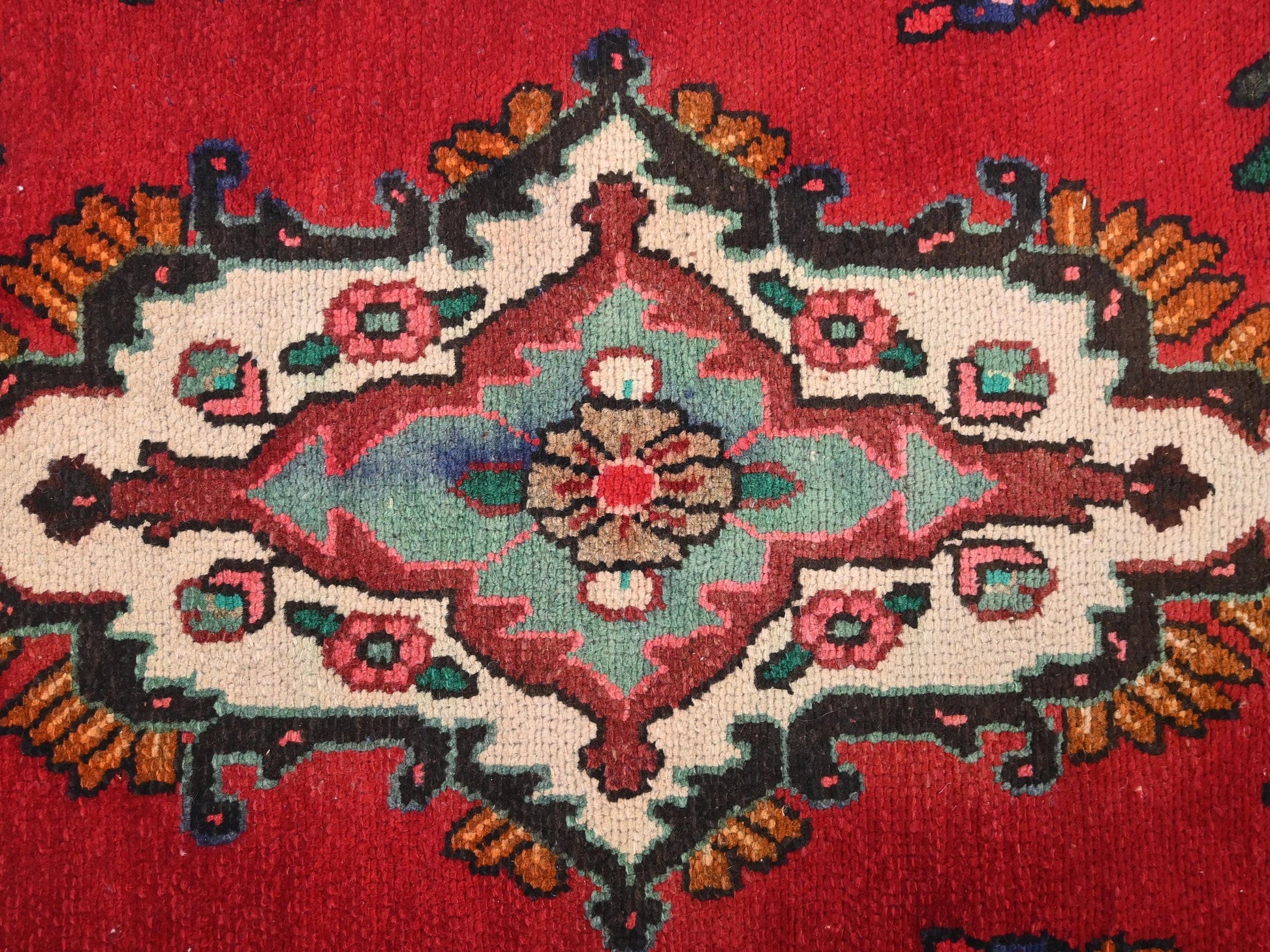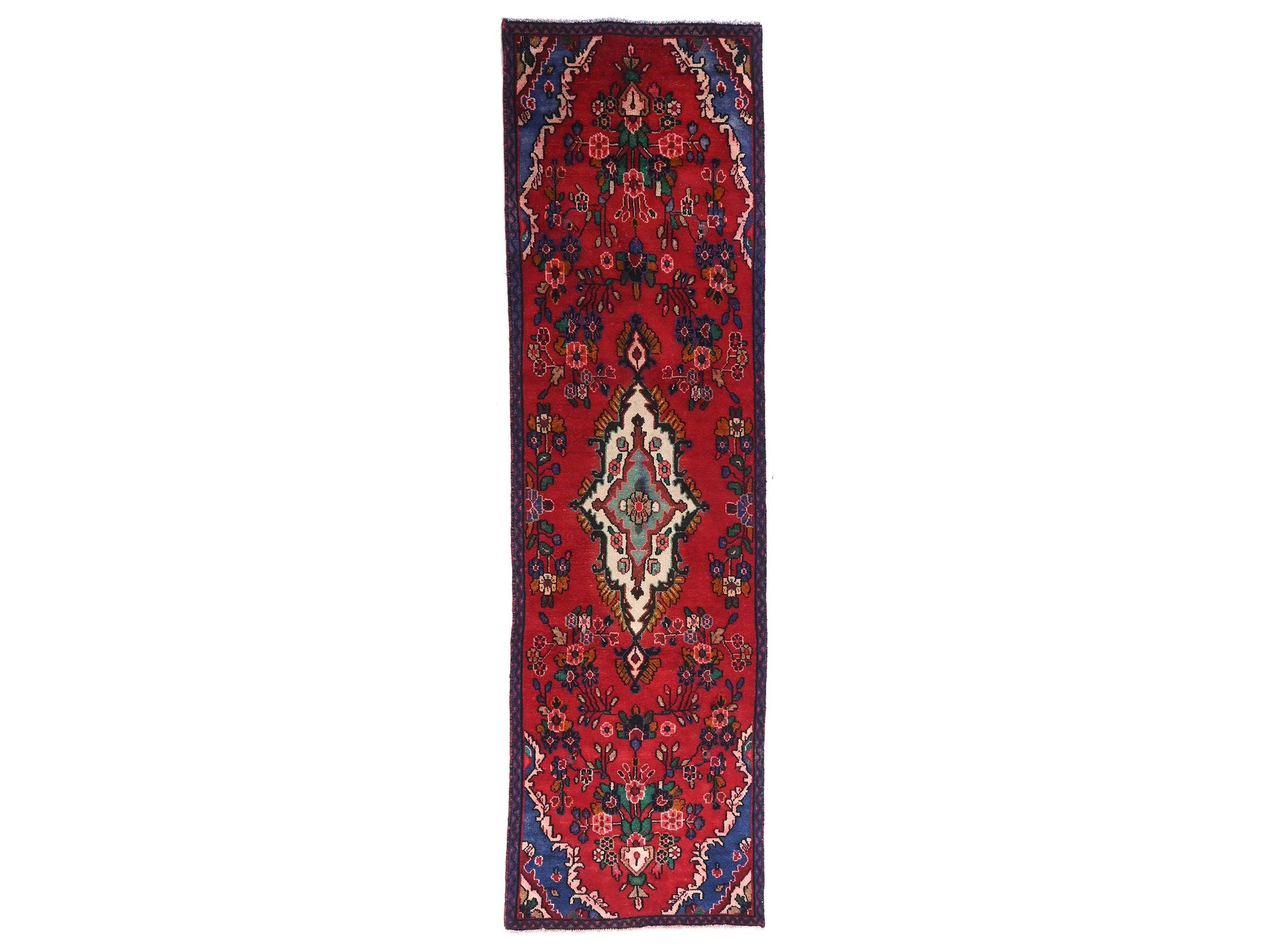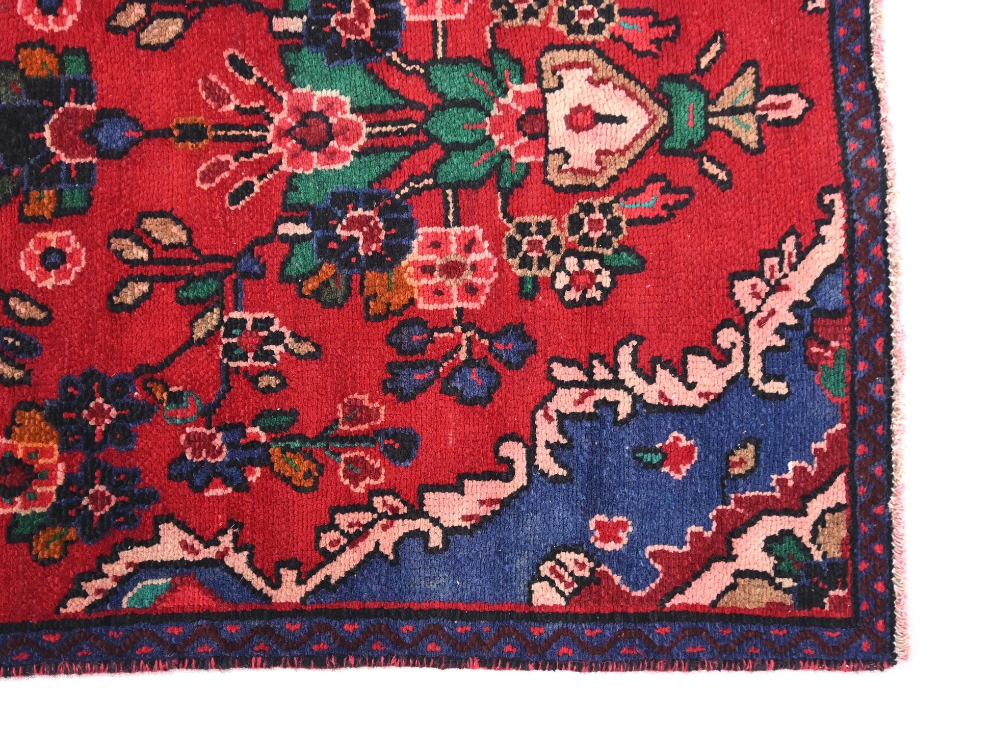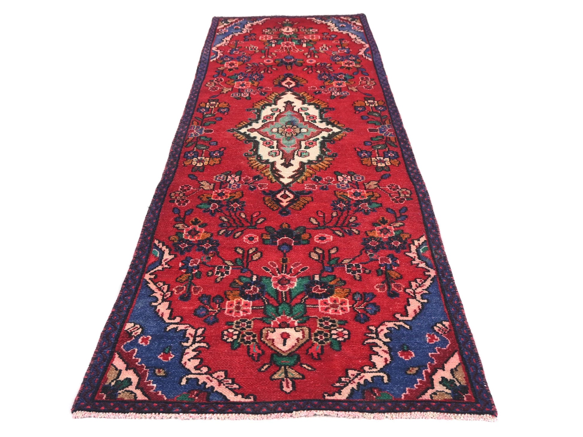 This 3x9 handmade Turkish vintage rug from 1970 features a dazzling floral field in rich red, adorned with navy and pink blossoms that climb toward a beautifully carved ivory medallion. The medallion’s ornate silhouette and complementary blue edgework give the piece a regal symmetry, while the upper and lower floral panels frame the design in botanical harmony.