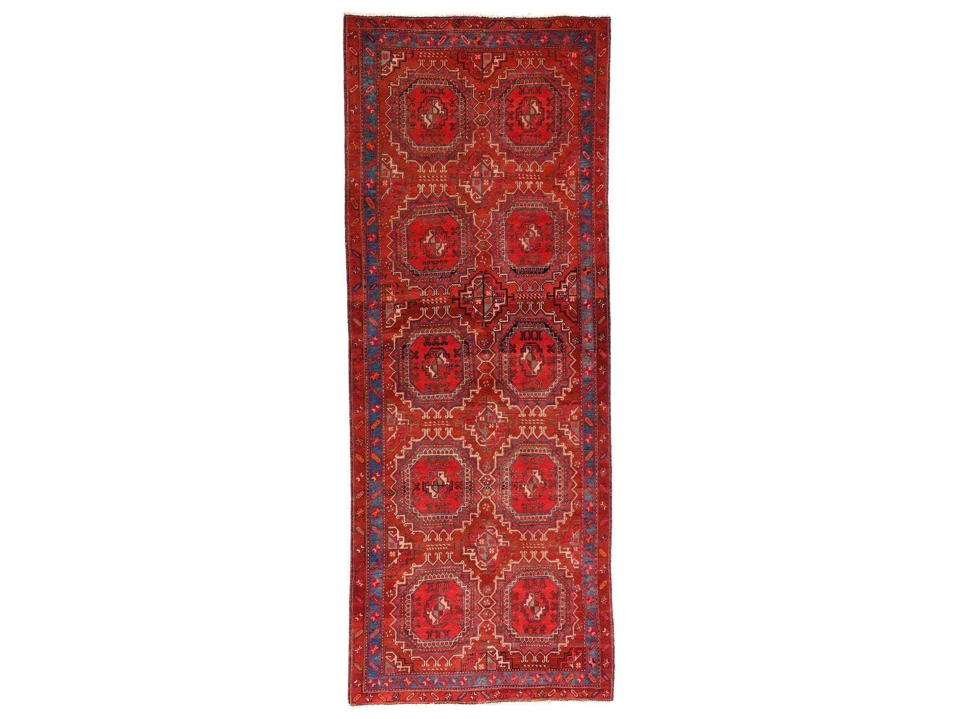 This stunning handmade Turkish vintage tribal rug showcases a repeating pattern of octagonal medallions, arranged in a perfect grid across a bold crimson field. The deep blue outer borders add richness and contrast, while symbolic inner details bring charm and story to this unforgettable piece. Ideal for anchoring a living room, study, or open hallway, it’s a rare and radiant example of Anatolian craftsmanship.