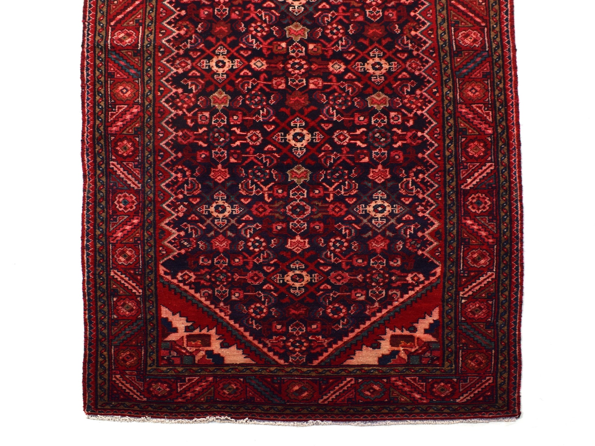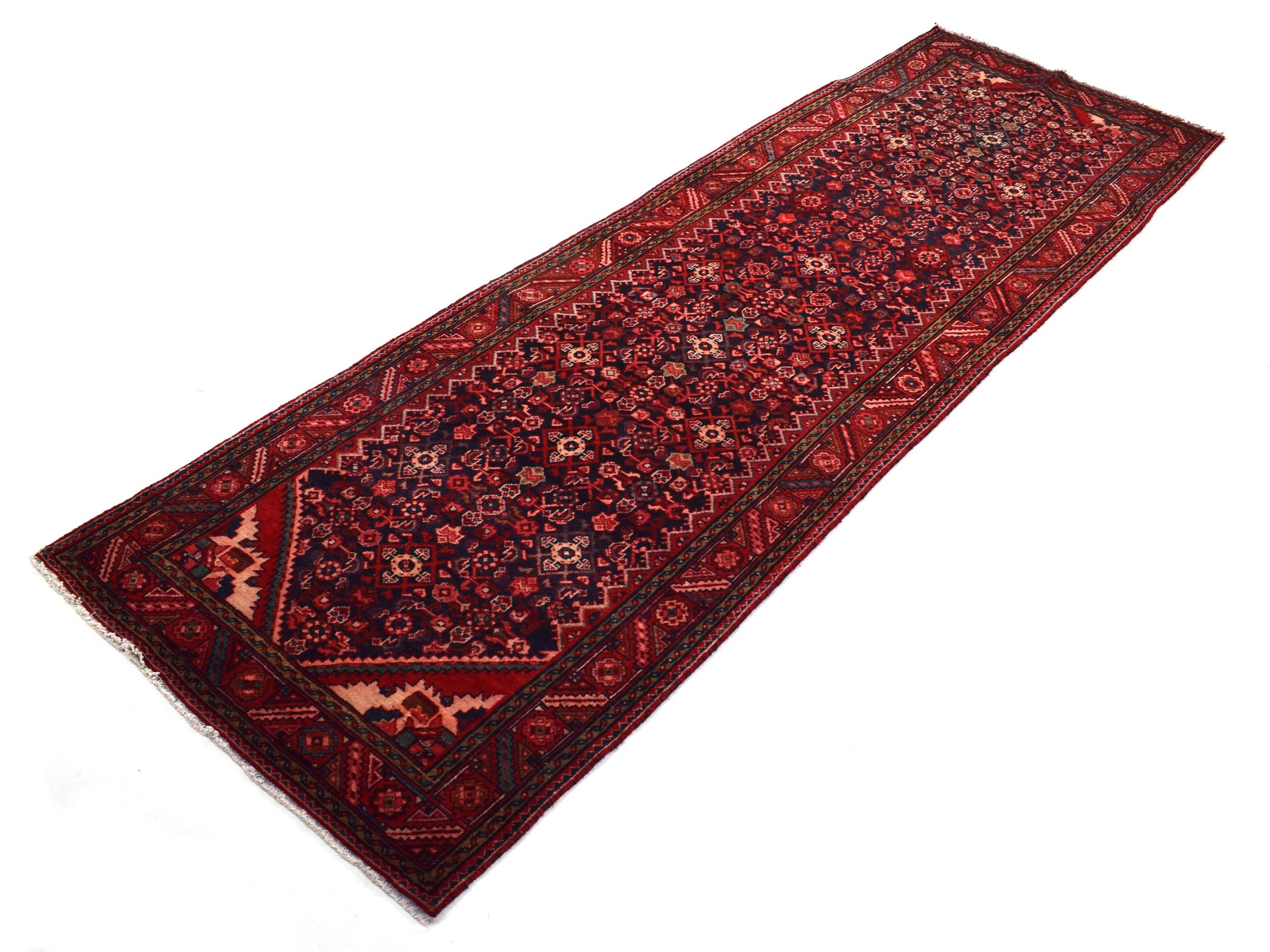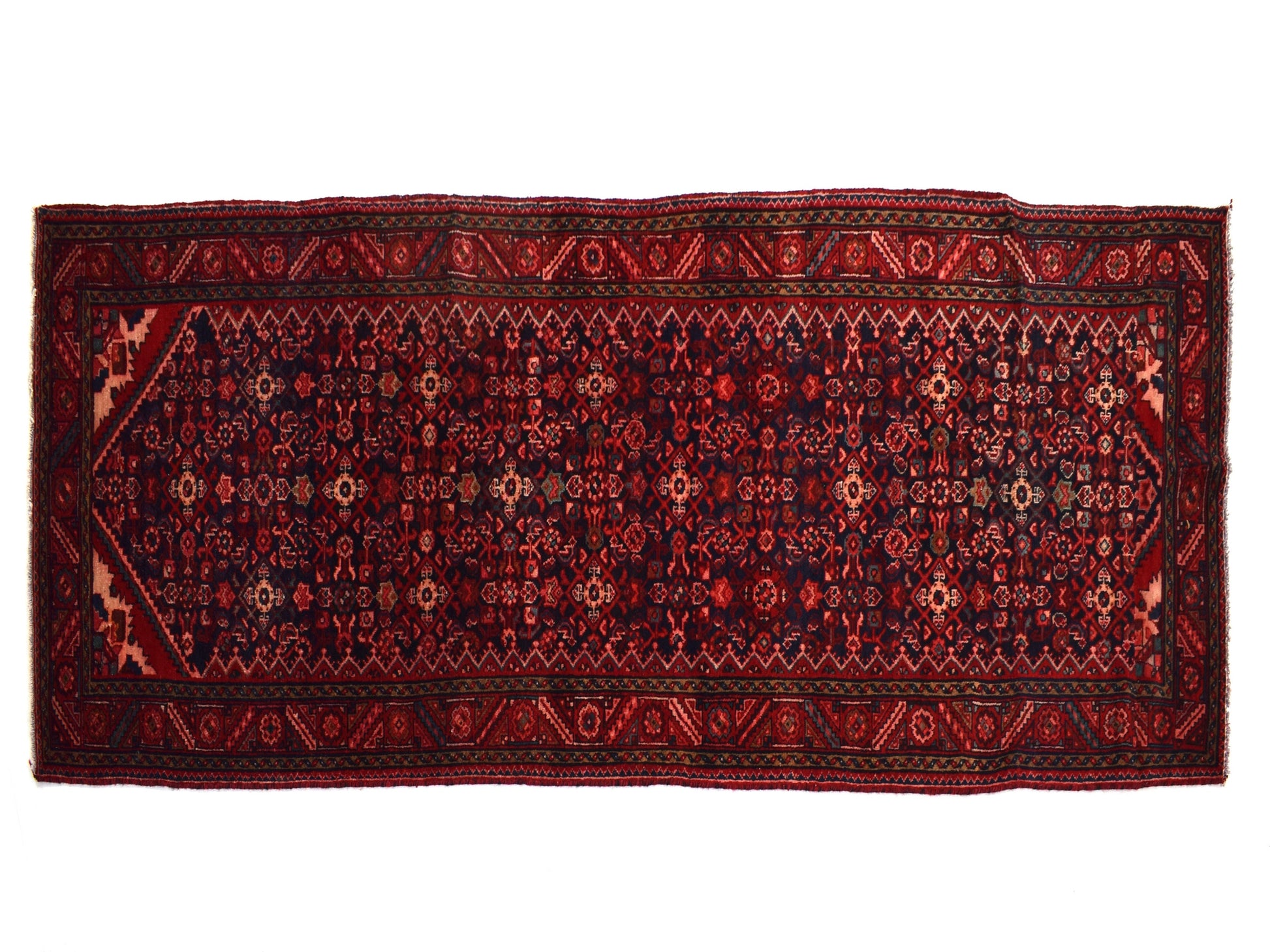 The vintage rugs in our collection have a rich and deep color palette and feature the characteristic design of a central pole medallion interspersed with geometric patterns and symmetrical shapes. Across their borders are often smaller bands encompassing a larger band with palm and leaf designs. A common theme in these rugs is geometric floral motives in various colors.