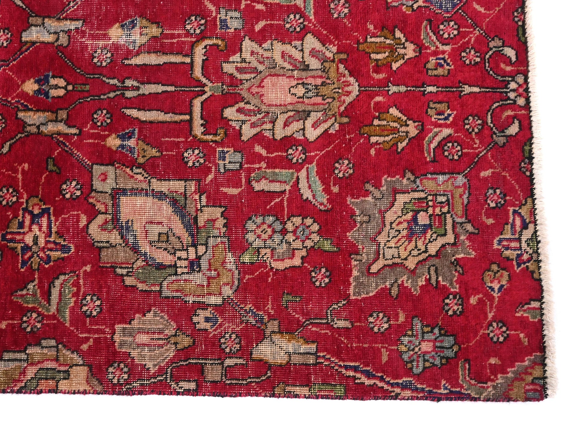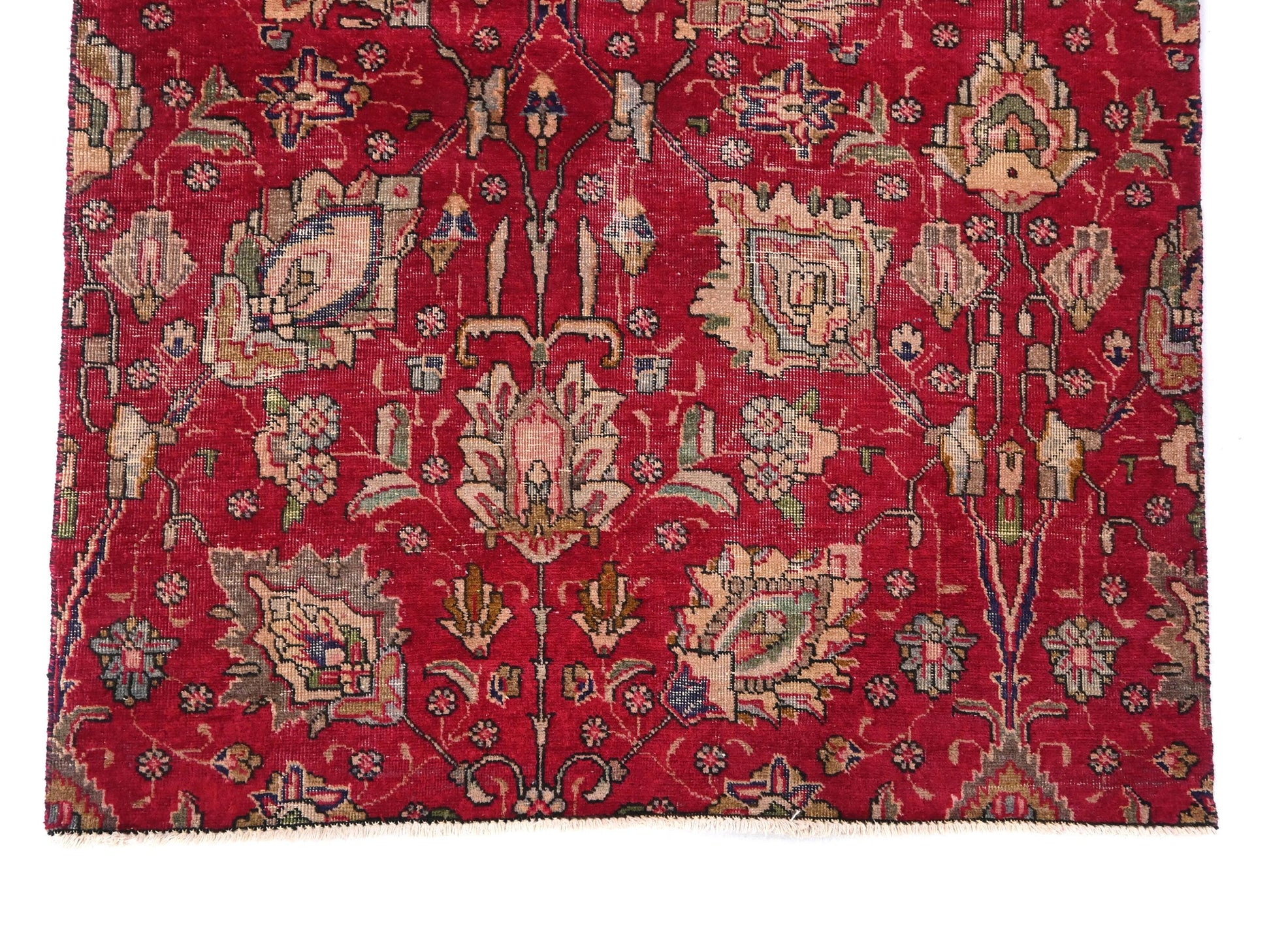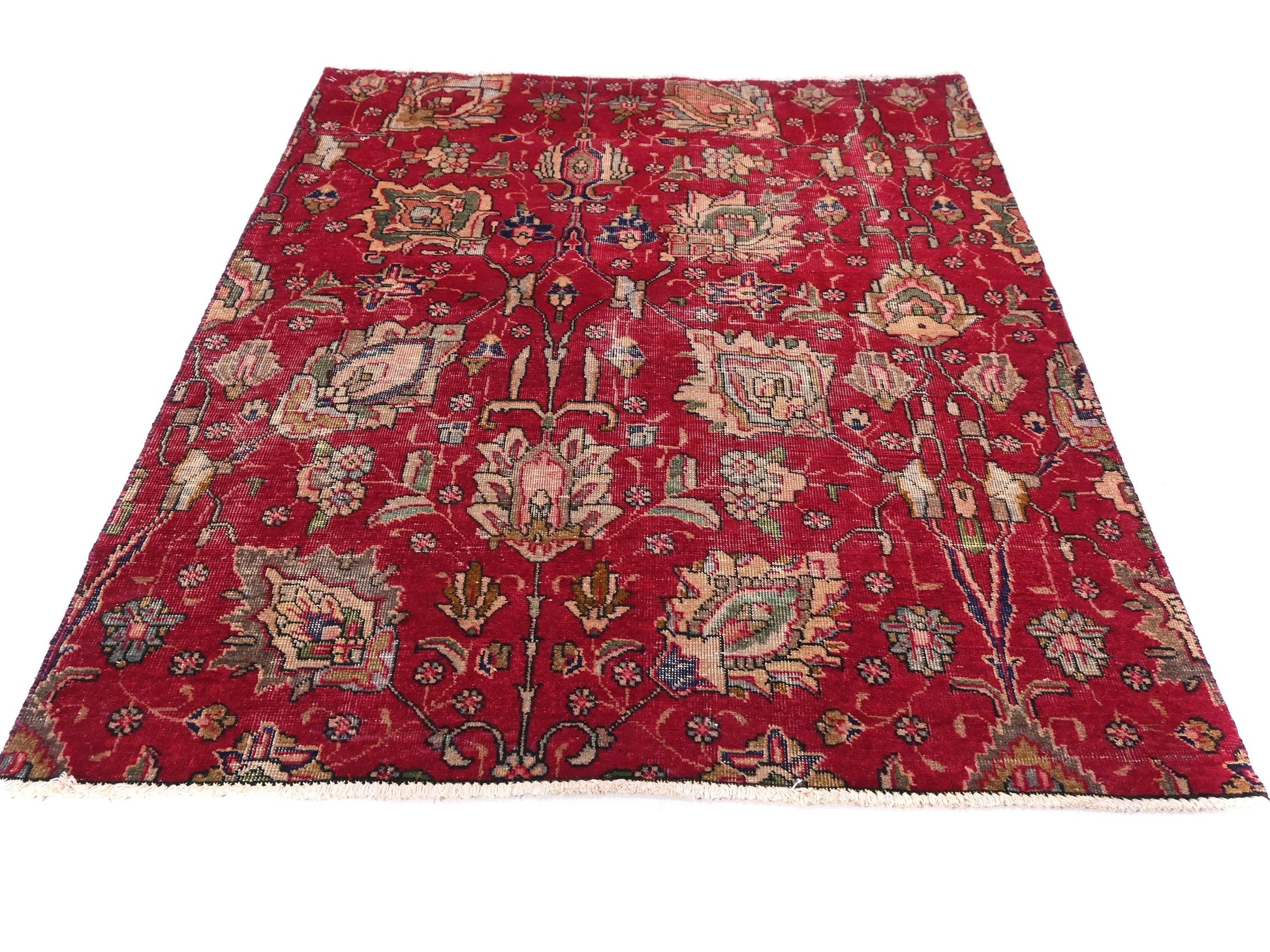This 4x5 handmade Turkish vintage rug from 1970 features an eye-catching deep red background enriched with stylized floral and palmette motifs in earthy moss green and light beige. Each corner is graced with intricate detailing, showcasing a refined sense of symmetry and balance. With 12 knots per square inch, the craftsmanship delivers both texture and precision, making this rug a visual masterpiece.