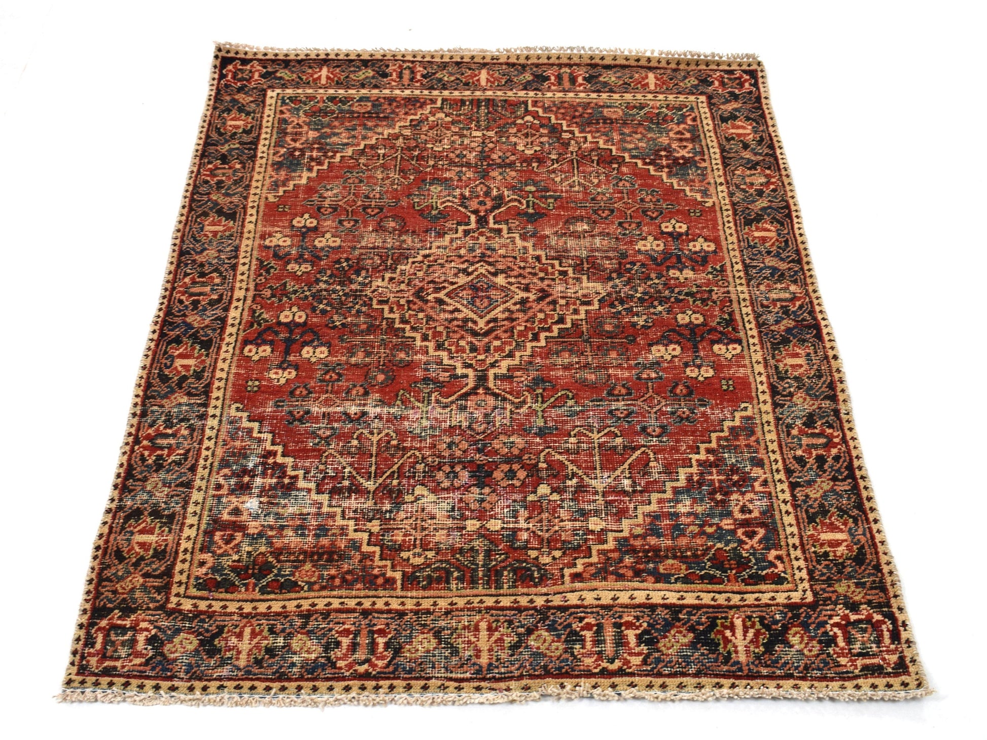 The vintage rugs in our collection have a rich and deep color palette and feature the characteristic design of a central pole medallion interspersed with geometric patterns and symmetrical shapes. Across their borders are often smaller bands encompassing a larger band with palm and leaf designs. A common theme in these rugs is geometric floral motives in various colors.