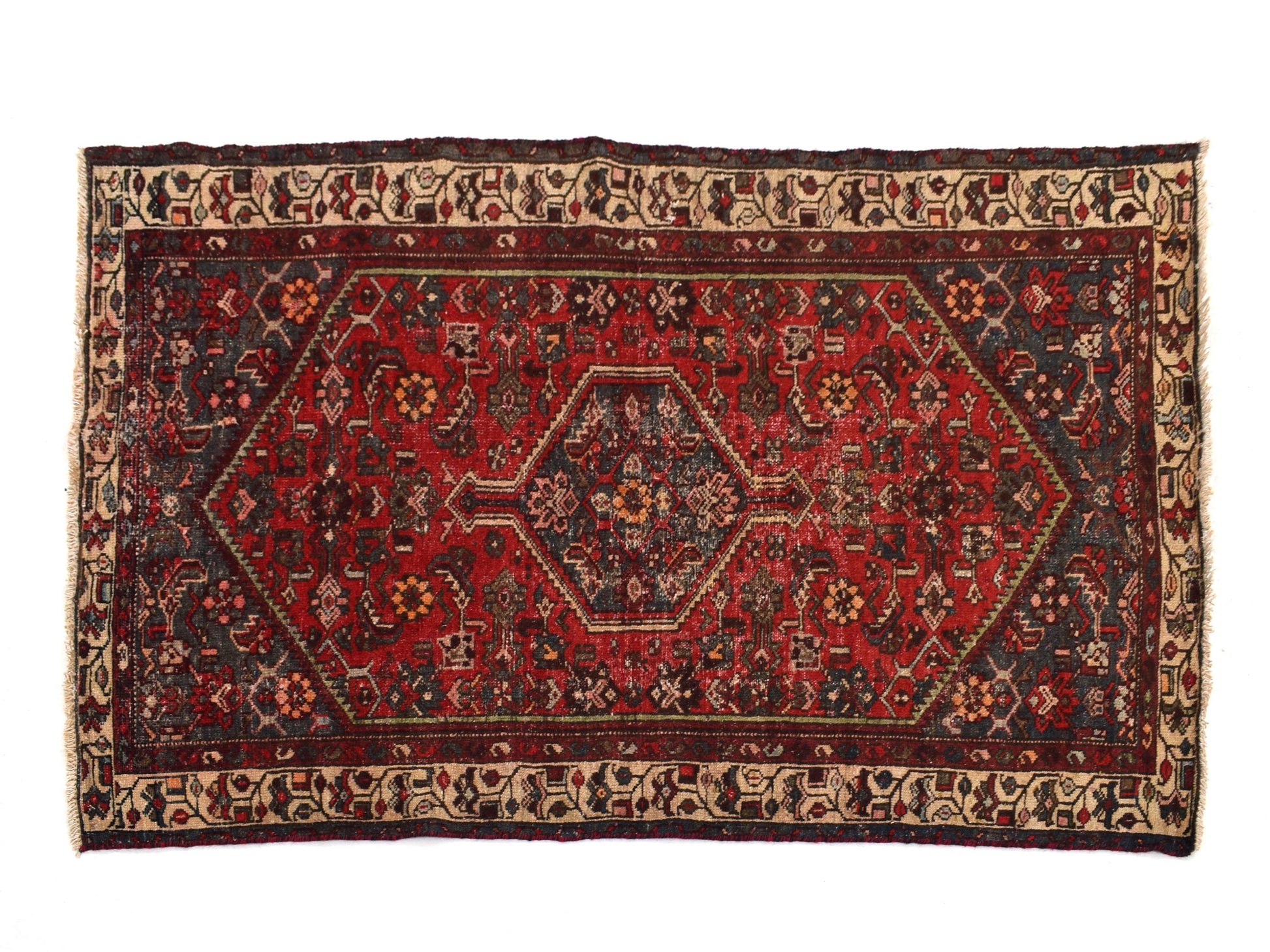 The vintage rugs in our collection have a rich and deep color palette and feature the characteristic design of a central pole medallion interspersed with geometric patterns and symmetrical shapes. Across their borders are often smaller bands encompassing a larger band with palm and leaf designs. A common theme in these rugs is geometric floral motives in various colors.