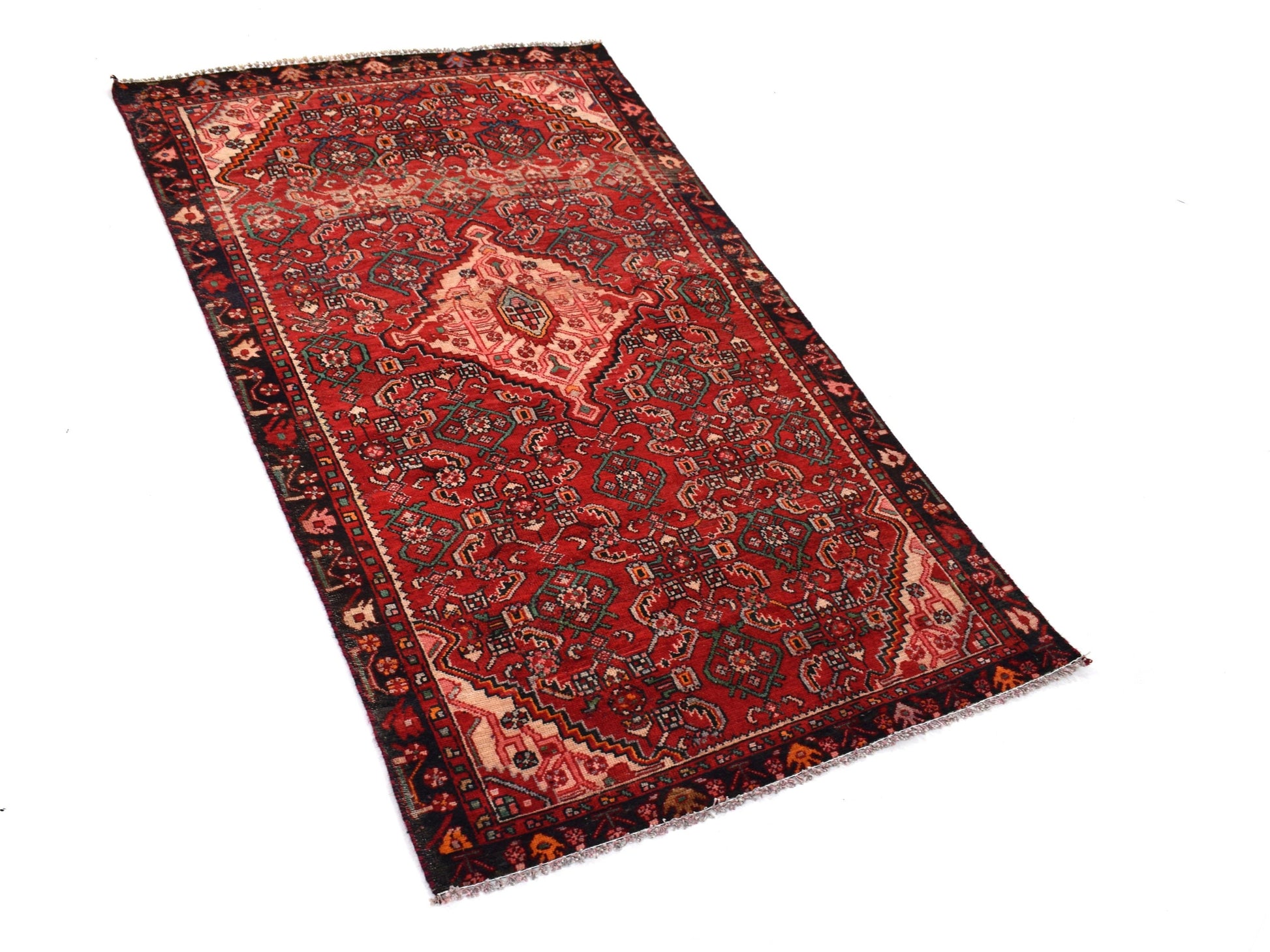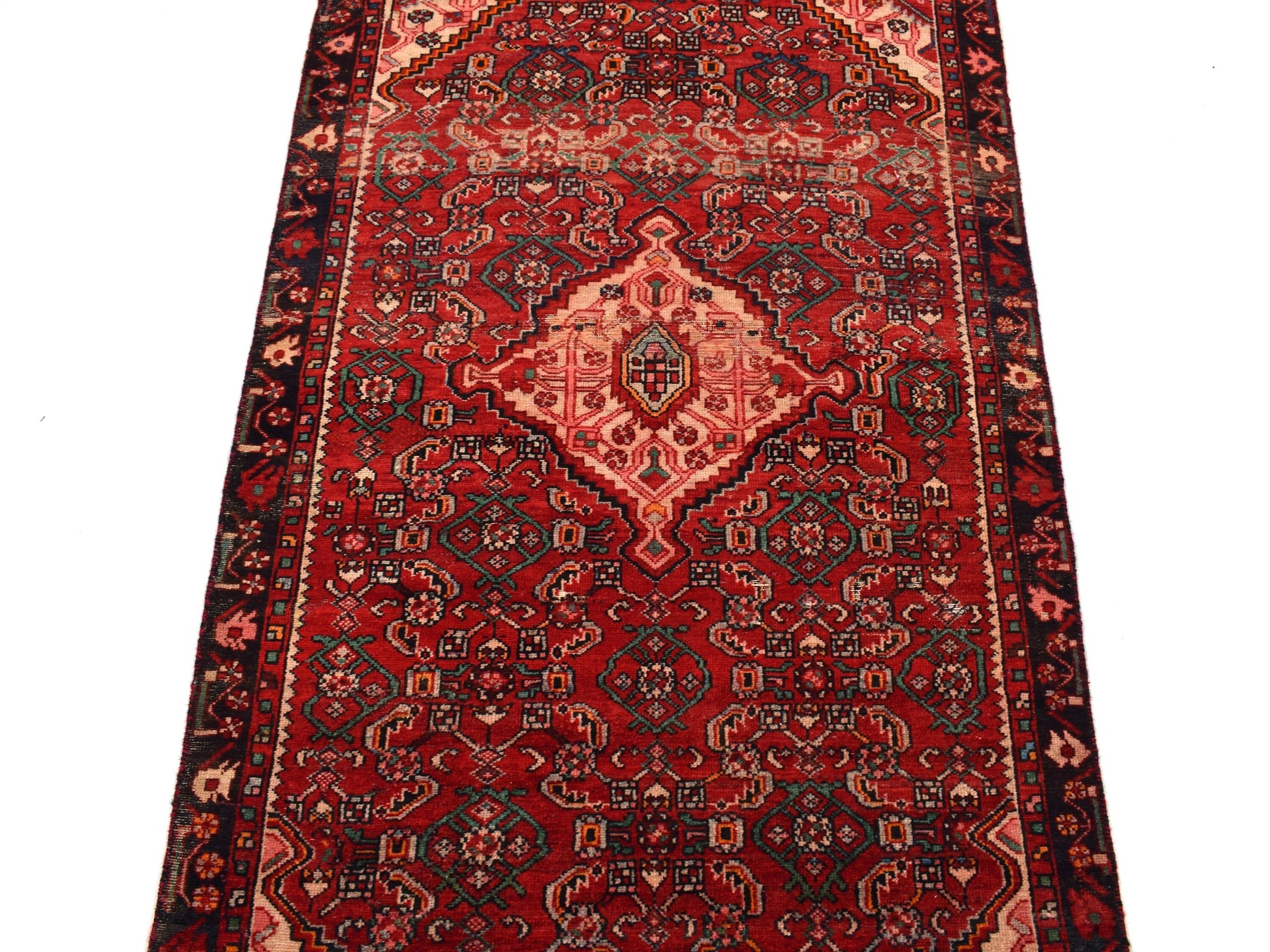 The vintage rugs in our collection have a rich and deep color palette and feature the characteristic design of a central pole medallion interspersed with geometric patterns and symmetrical shapes. Across their borders are often smaller bands encompassing a larger band with palm and leaf designs. A common theme in these rugs is geometric floral motives in various colors.