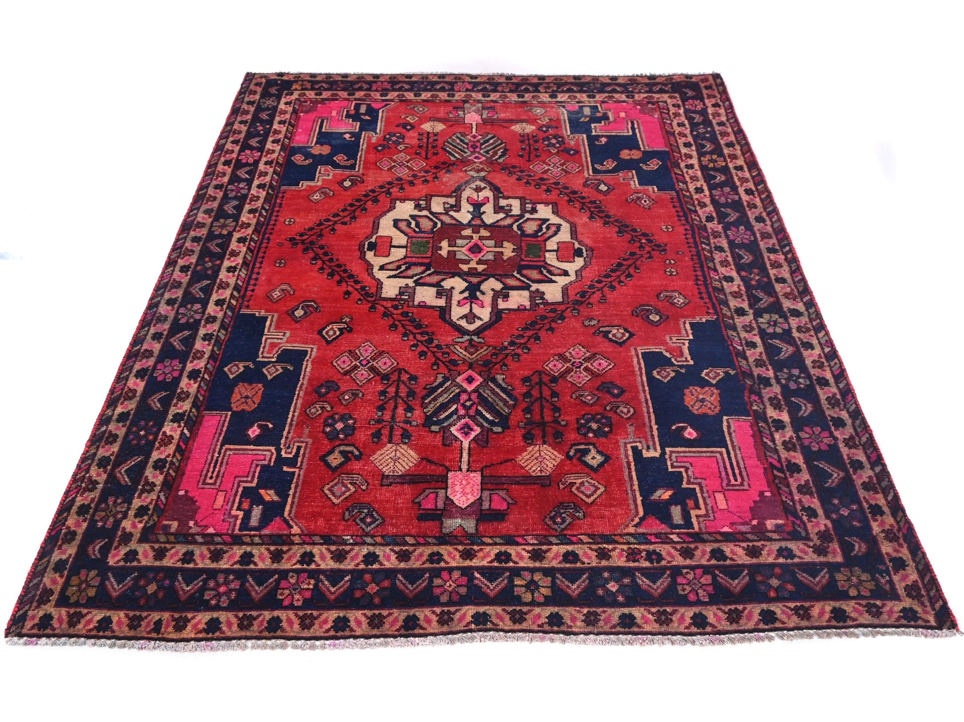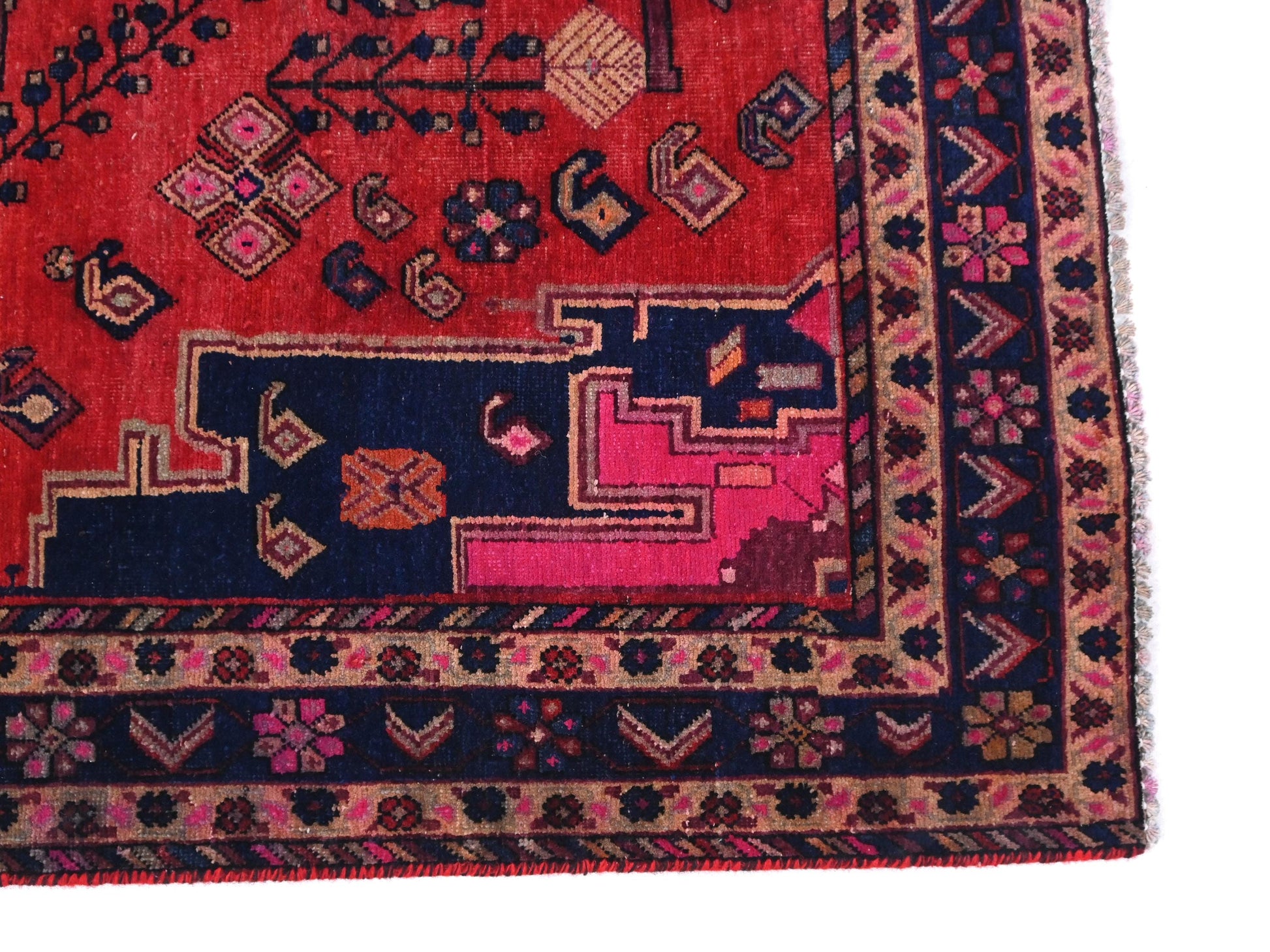 4x6 Handmade Turkish Vintage Tribal Rug | Crimson Garden Emblem With Indigo Floral Flanks | Boho Rug, Anatolian Rug | SHR458 | From 1980