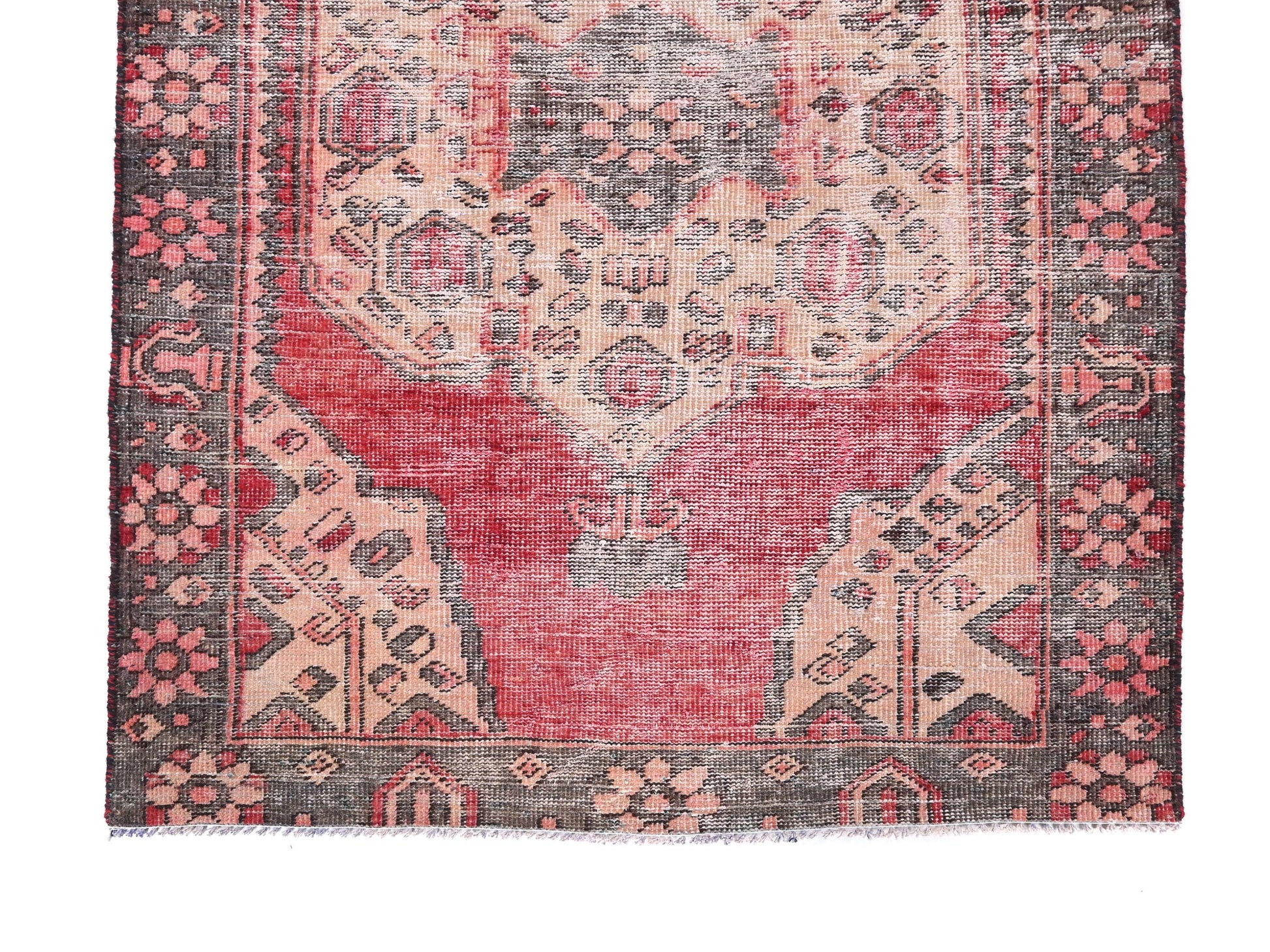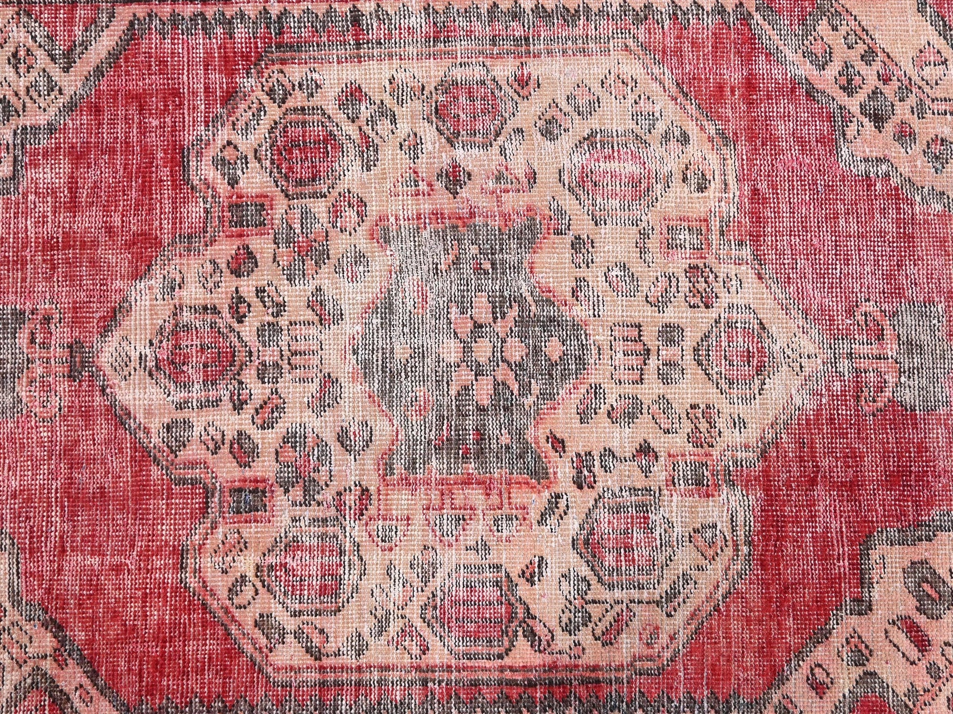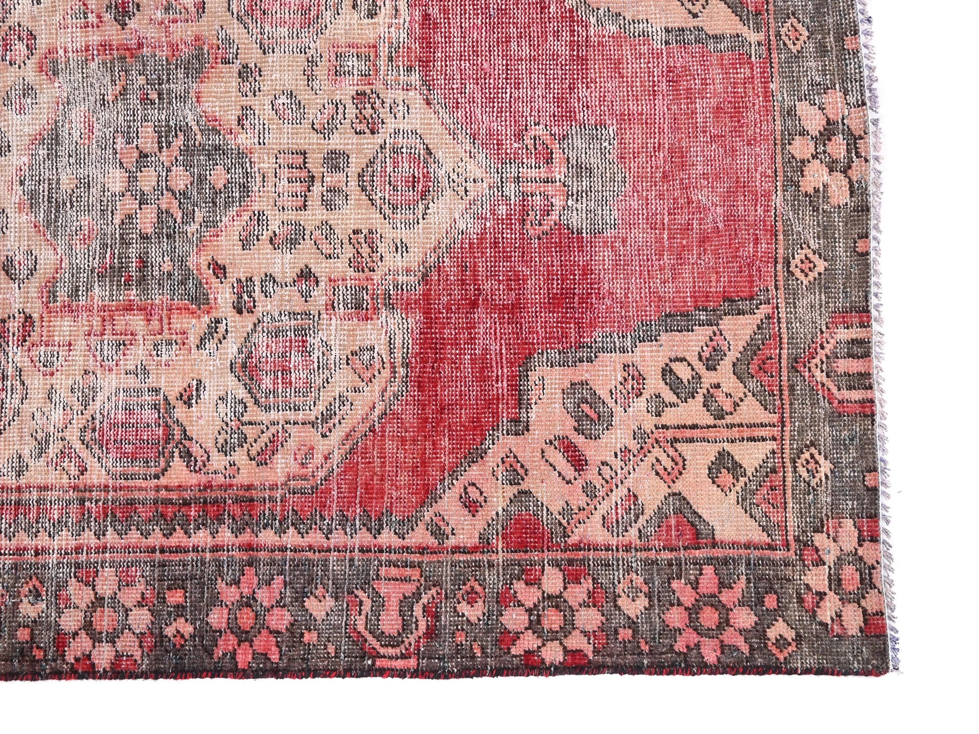 This handwoven Turkish vintage rug evokes the gentle aging of time through its faded terracotta field and soft ivory diamond medallion. The corners are etched with geometric motifs in charcoal and muted rose, grounded by delicate flower patterns across a deep border, all softened with a natural patina.