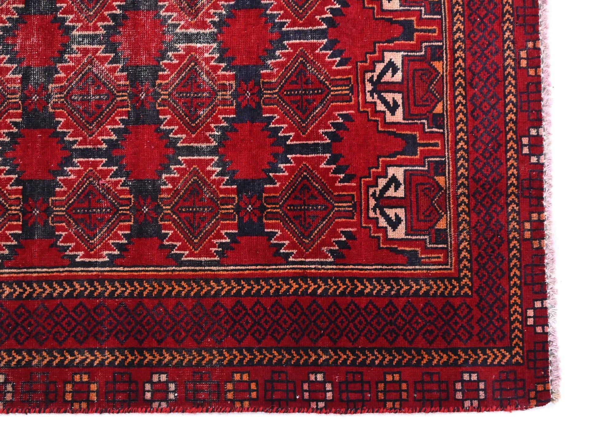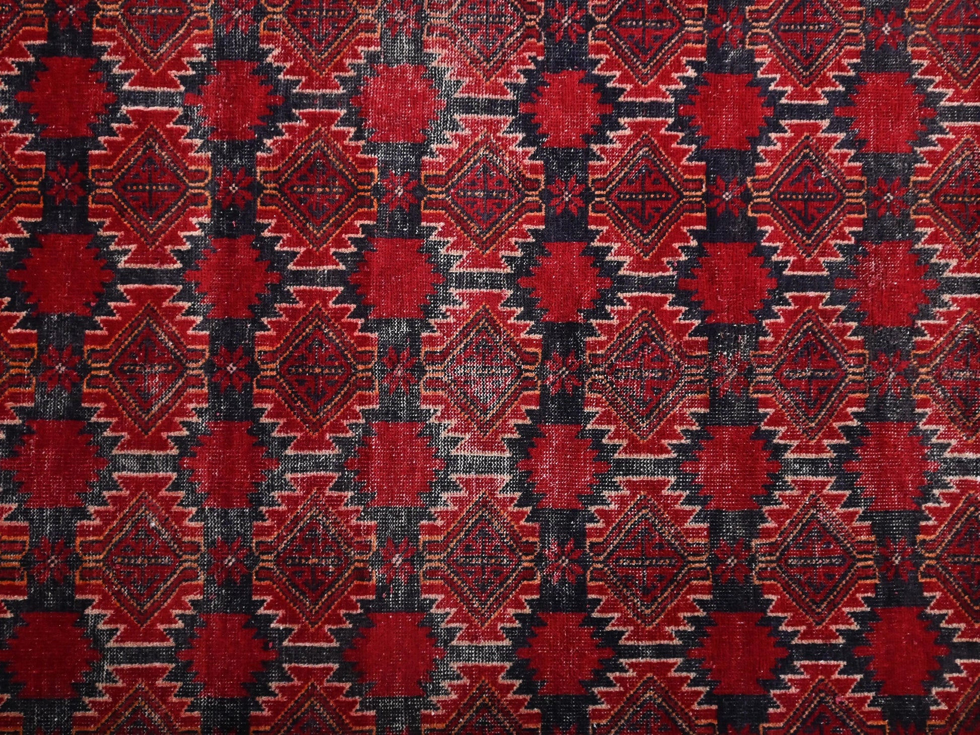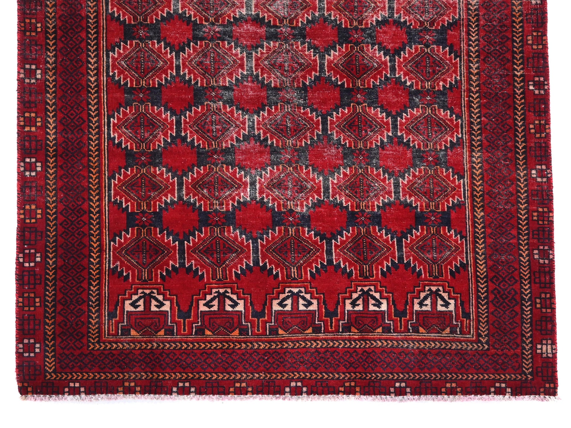 This mesmerizing tribal piece features a bold raspberry-toned field filled with repeating 'elephant foot' guls – geometric medallions symbolizing strength and resilience. The contrast between deep red, indigo, and ivory tones forms a rhythmic harmony that feels both regal and grounded. Angular details and a strong repeating motif throughout the body of the rug make it perfect for lovers of symmetry and bold design.